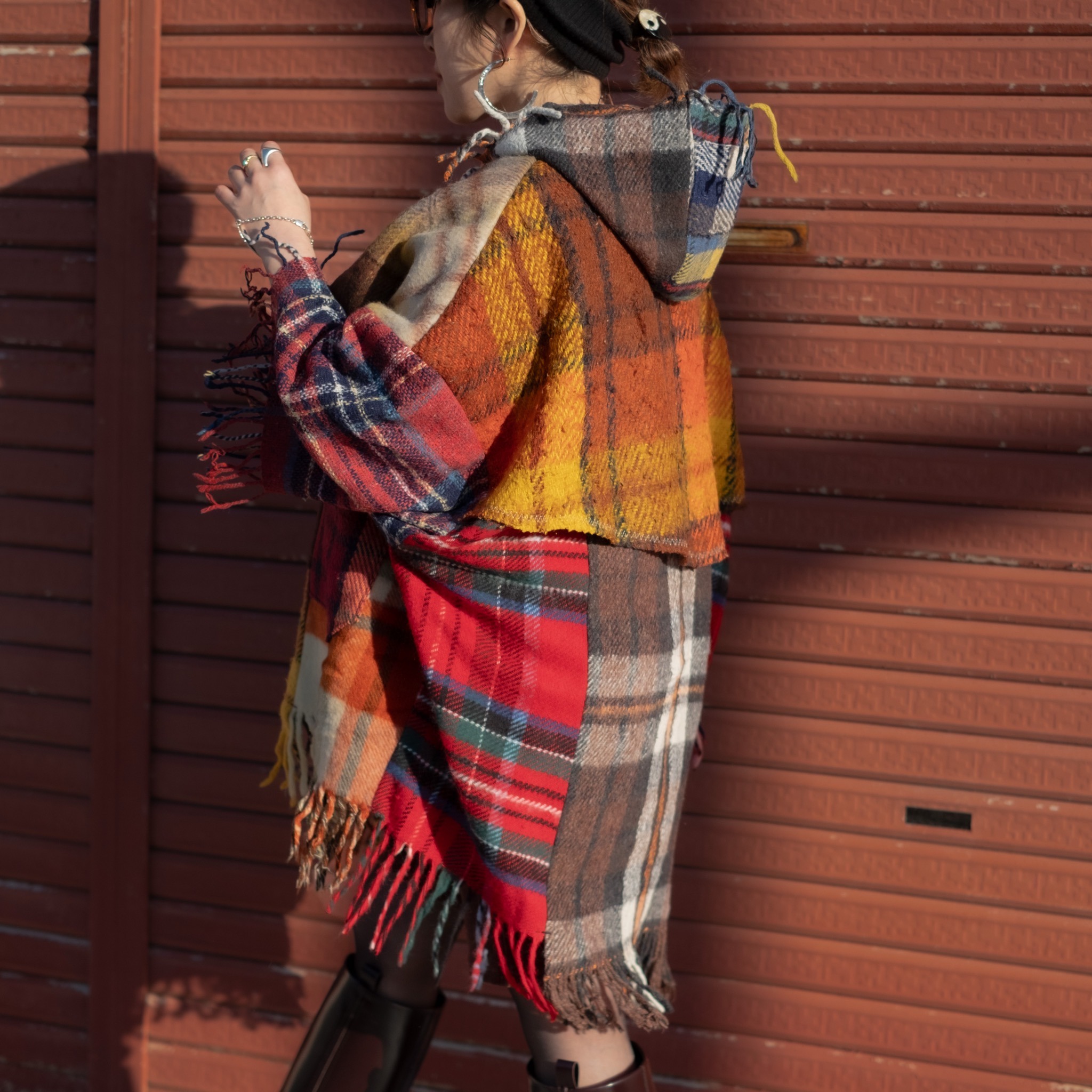 希少な古着のラグをふんだんに使用し製作されたリメイクポンチョアウター。