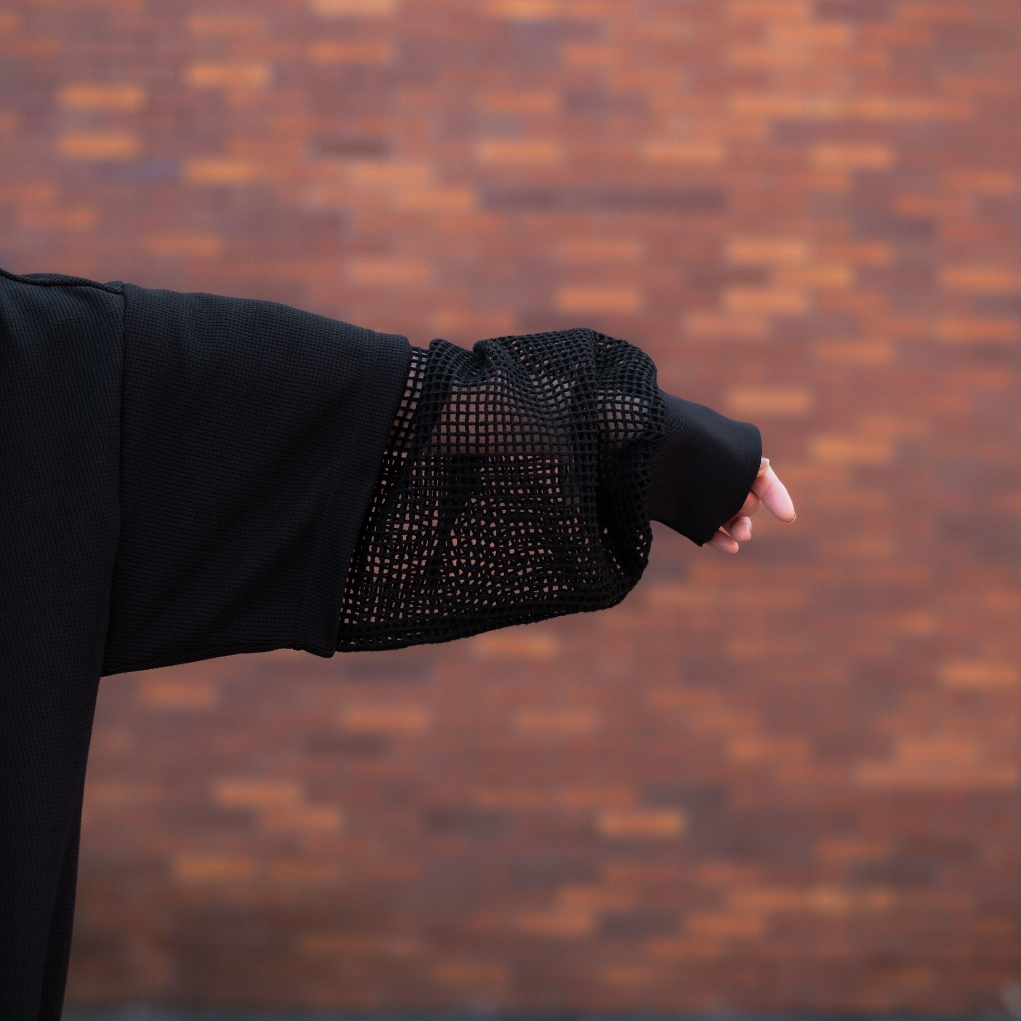 袖部分は2重構造で、長袖部分はメッシュ素材なので涼しさと透け感のオシャレさを両立したデザインに仕上げました。
