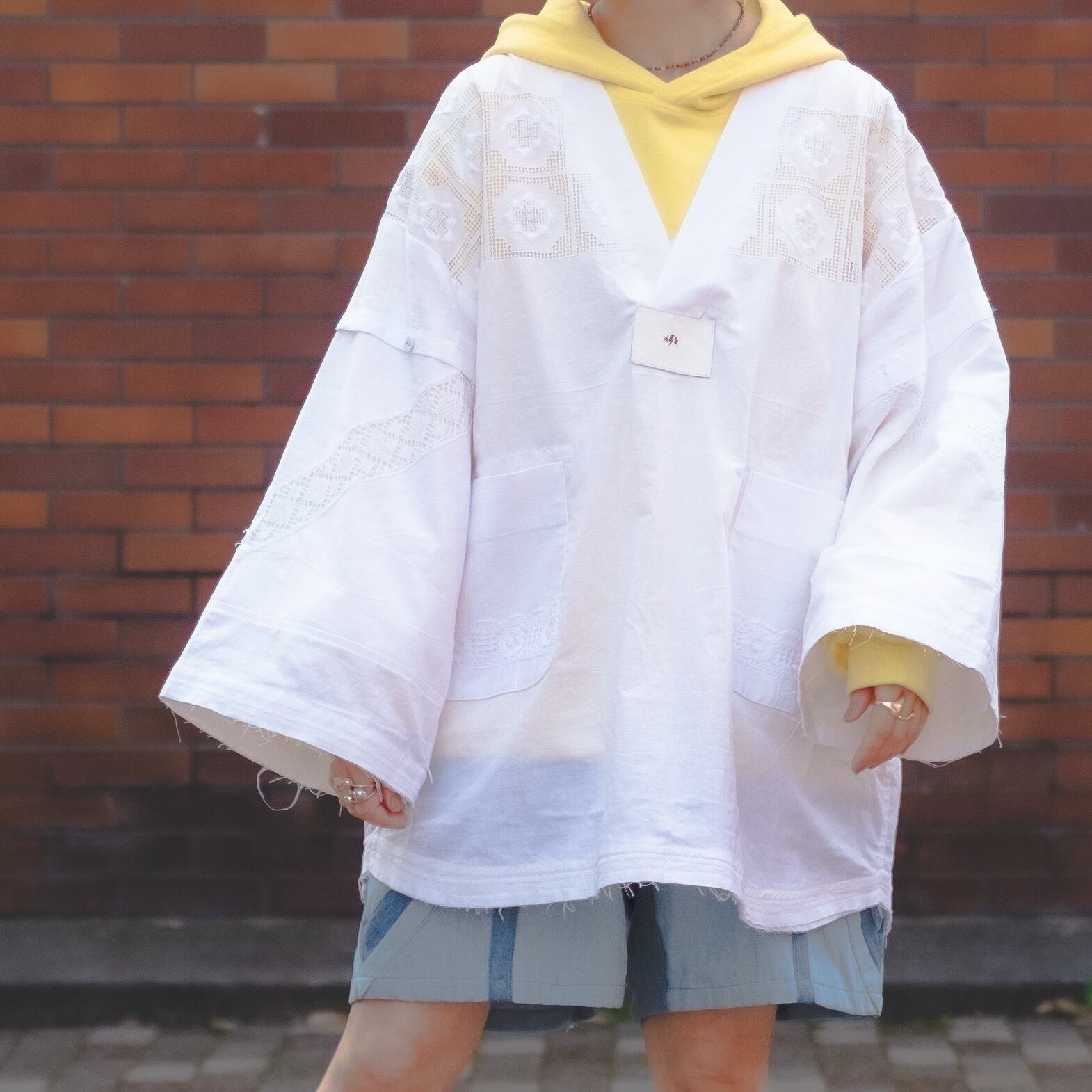 1970年代のヴィンテージのピローケース(枕カバー)を用いて制作したVネックプルオーバーシャツ。