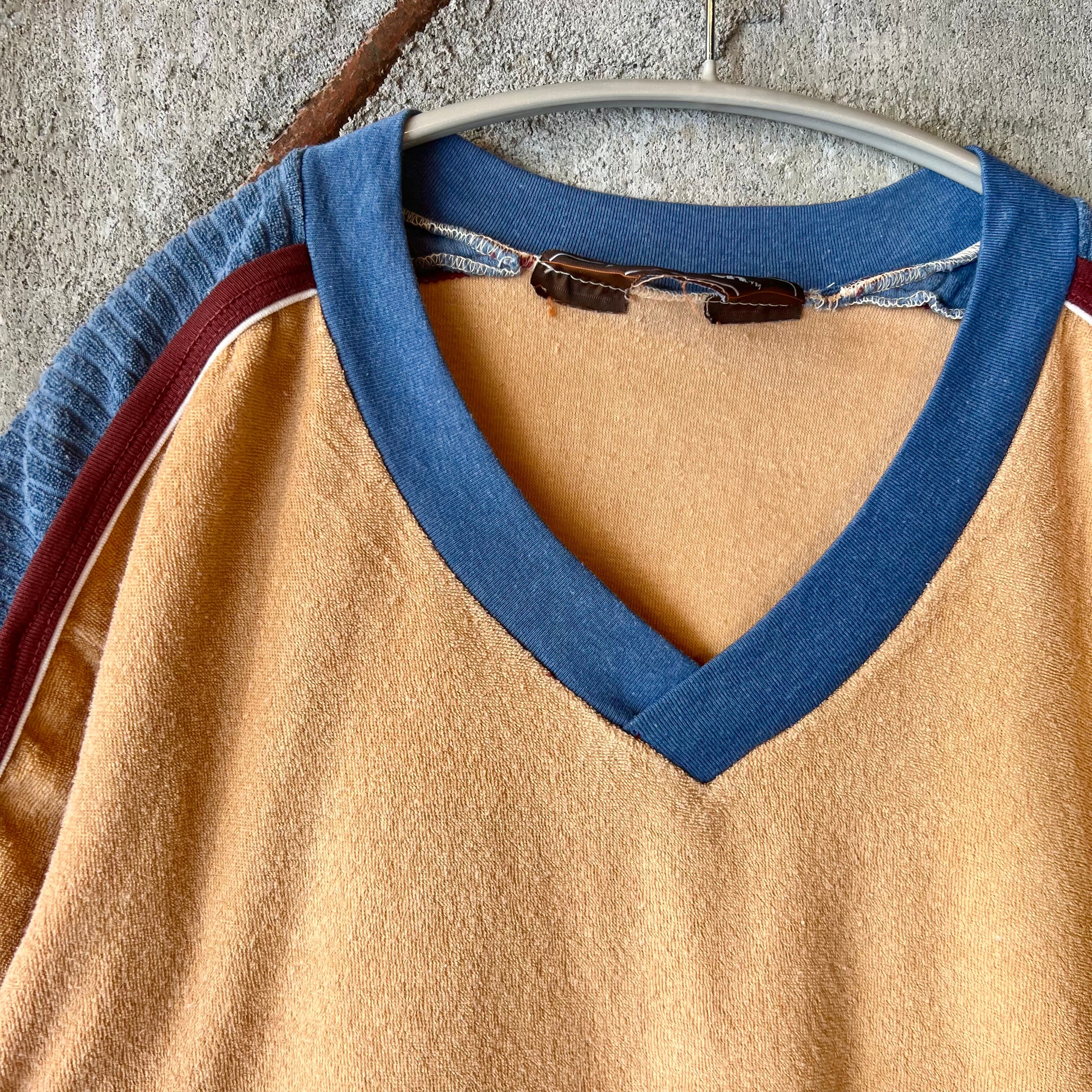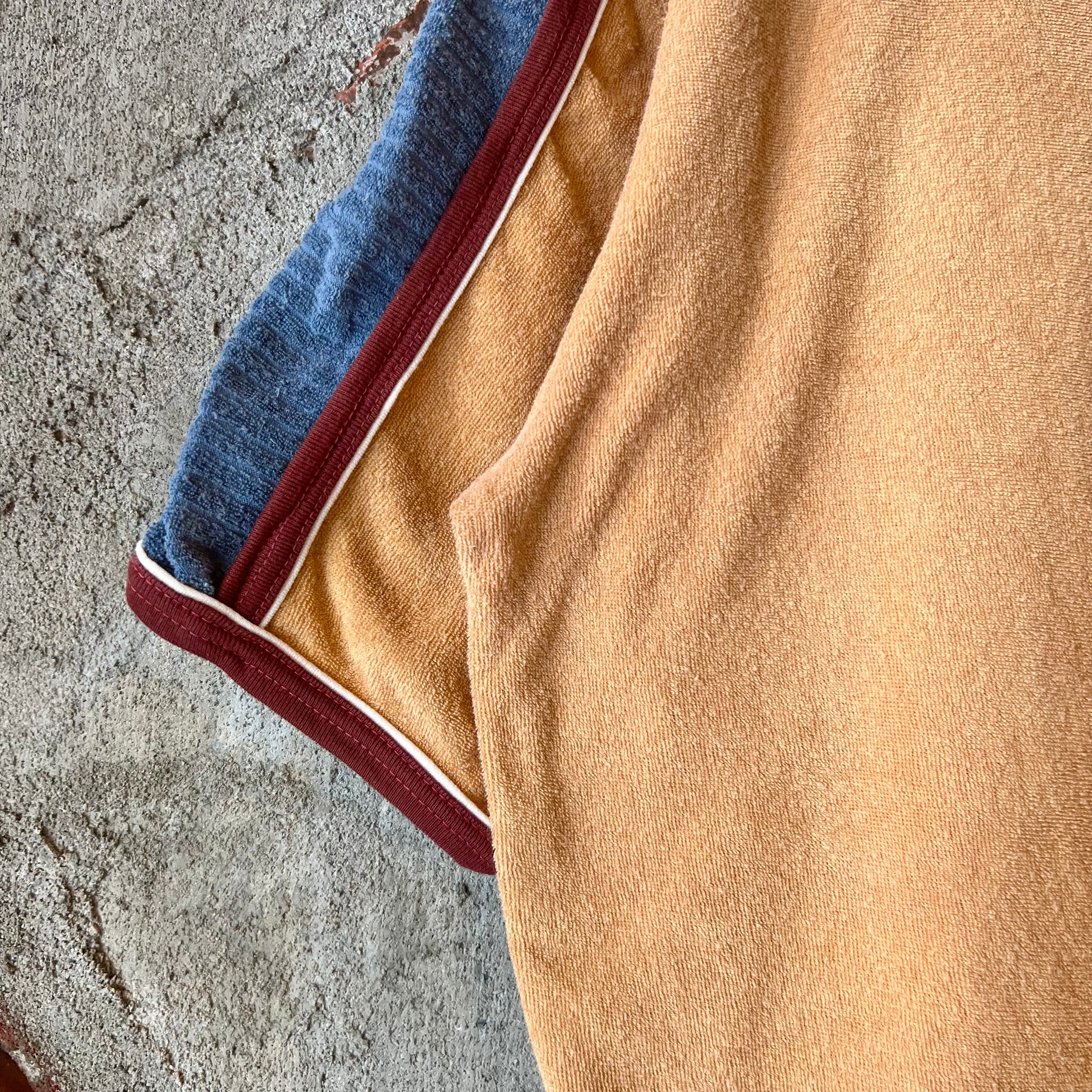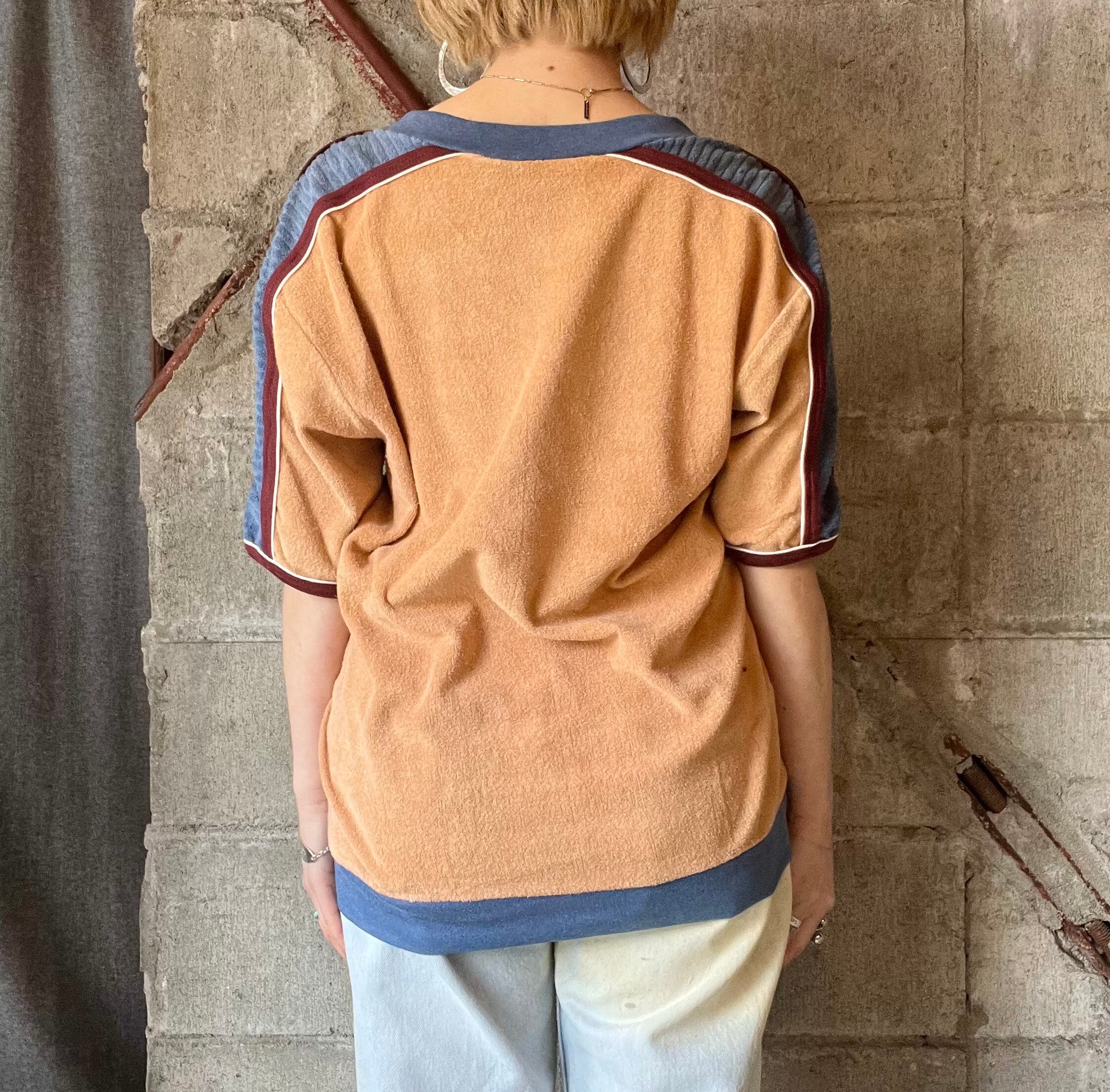 パイル地独特の風合いと、切り替え、配色がレトロで目を引く1枚。