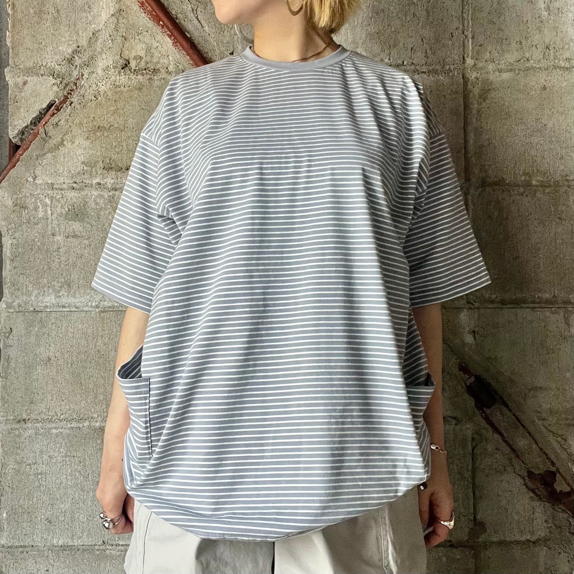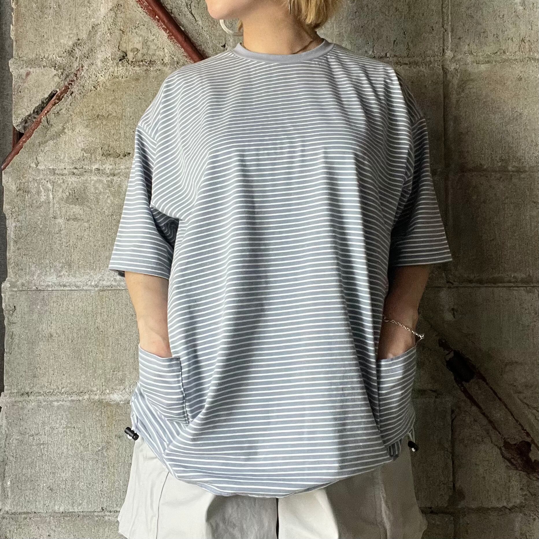 ピッチの細いボーダーで少しキレイな印象でややワイドなシルエットでサイドのポケットもあり実用性も。