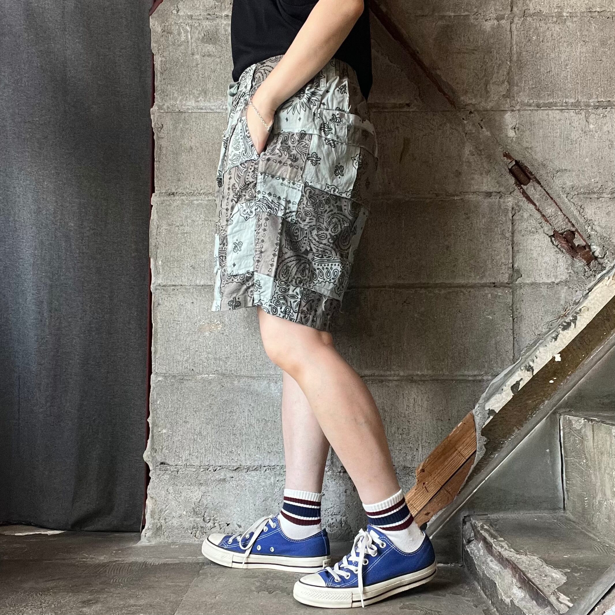濃淡あるバンダナ生地を1枚1枚繋ぎあわせたパッチワーク生地を作り、製品ピグメントで染め上げたリメイク感満載のショートパンツ。