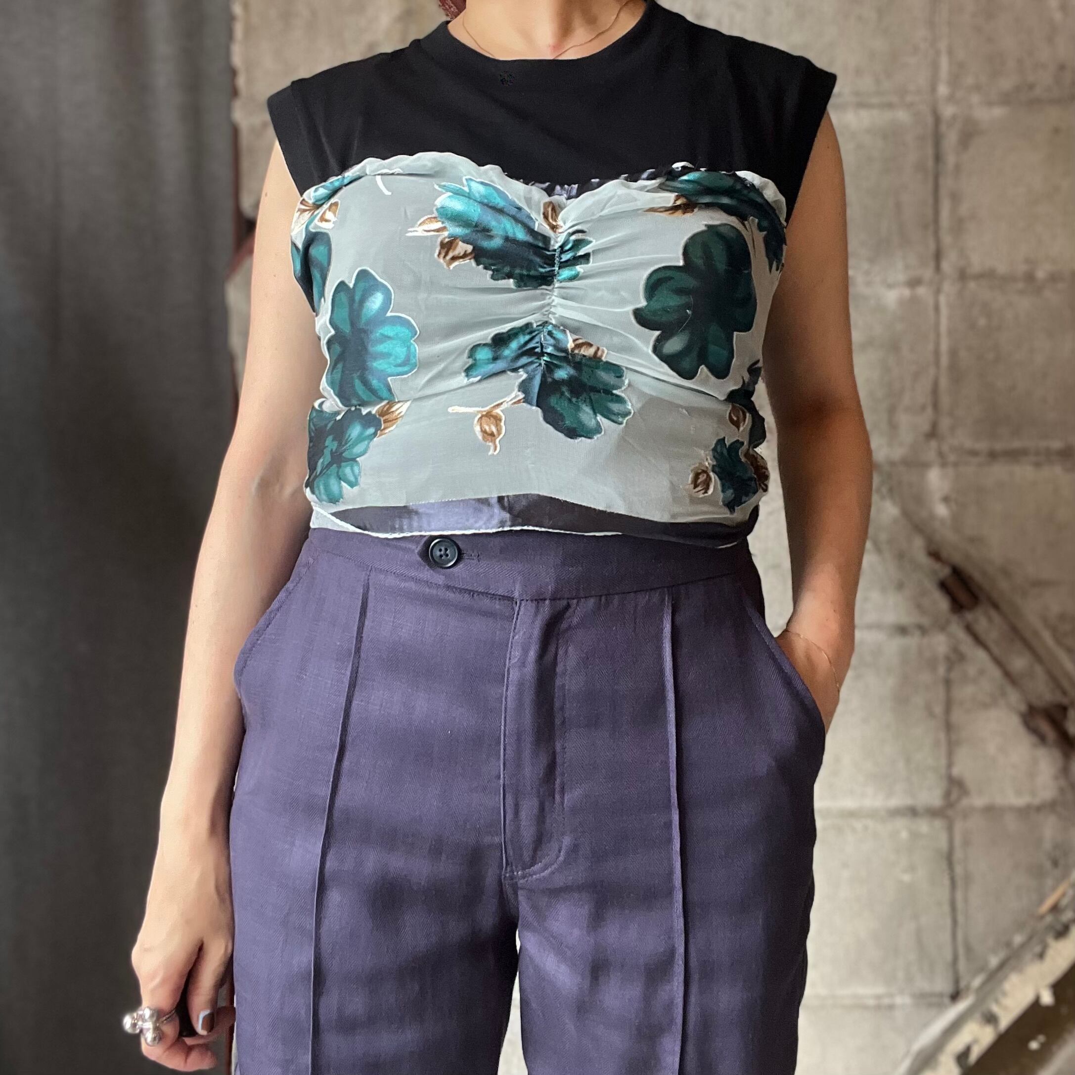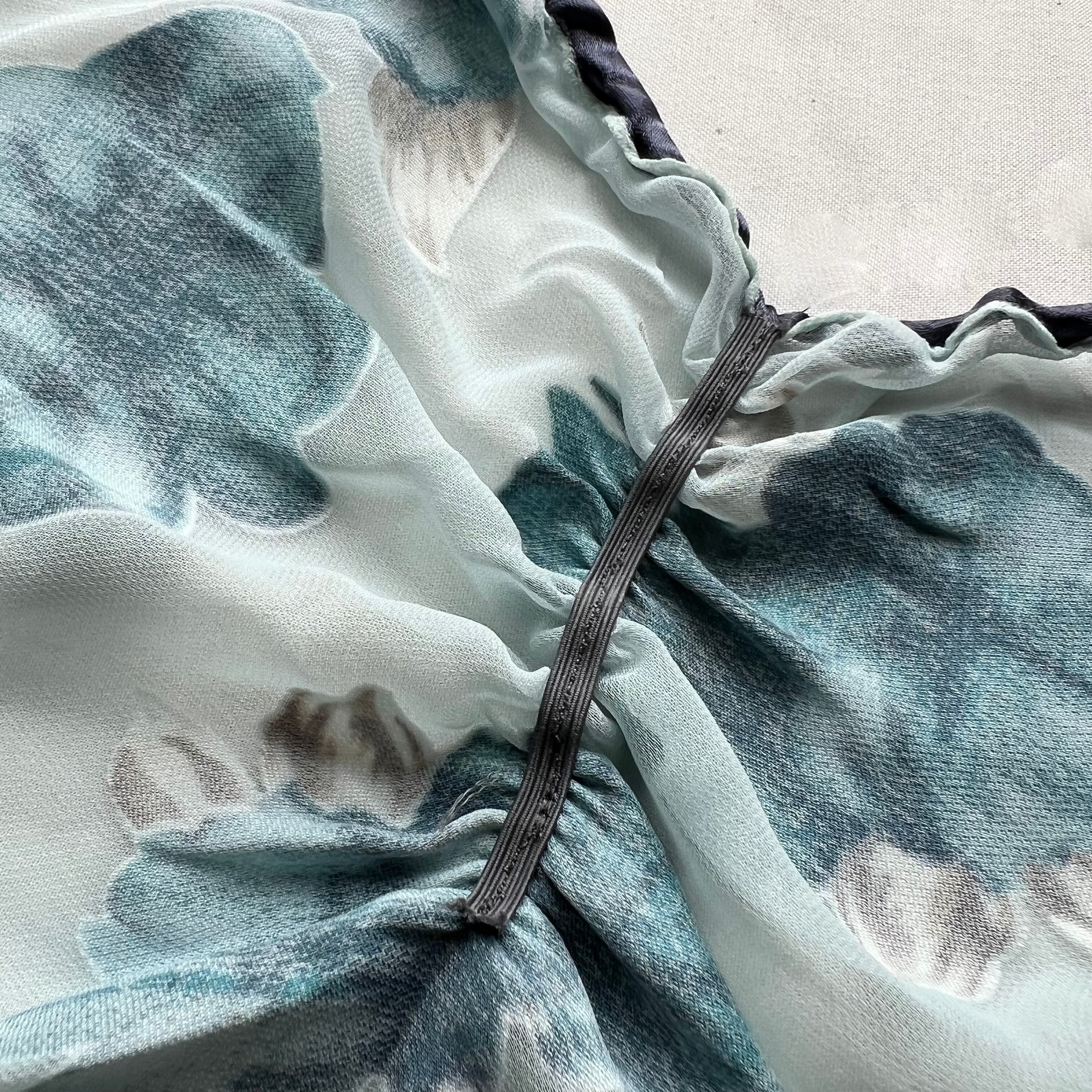 単にスカーフを巻くだけでは落ちてきてしまうので胸の上部分にゴムを入れ、フロント真ん中にギャザーを寄せポイントに。