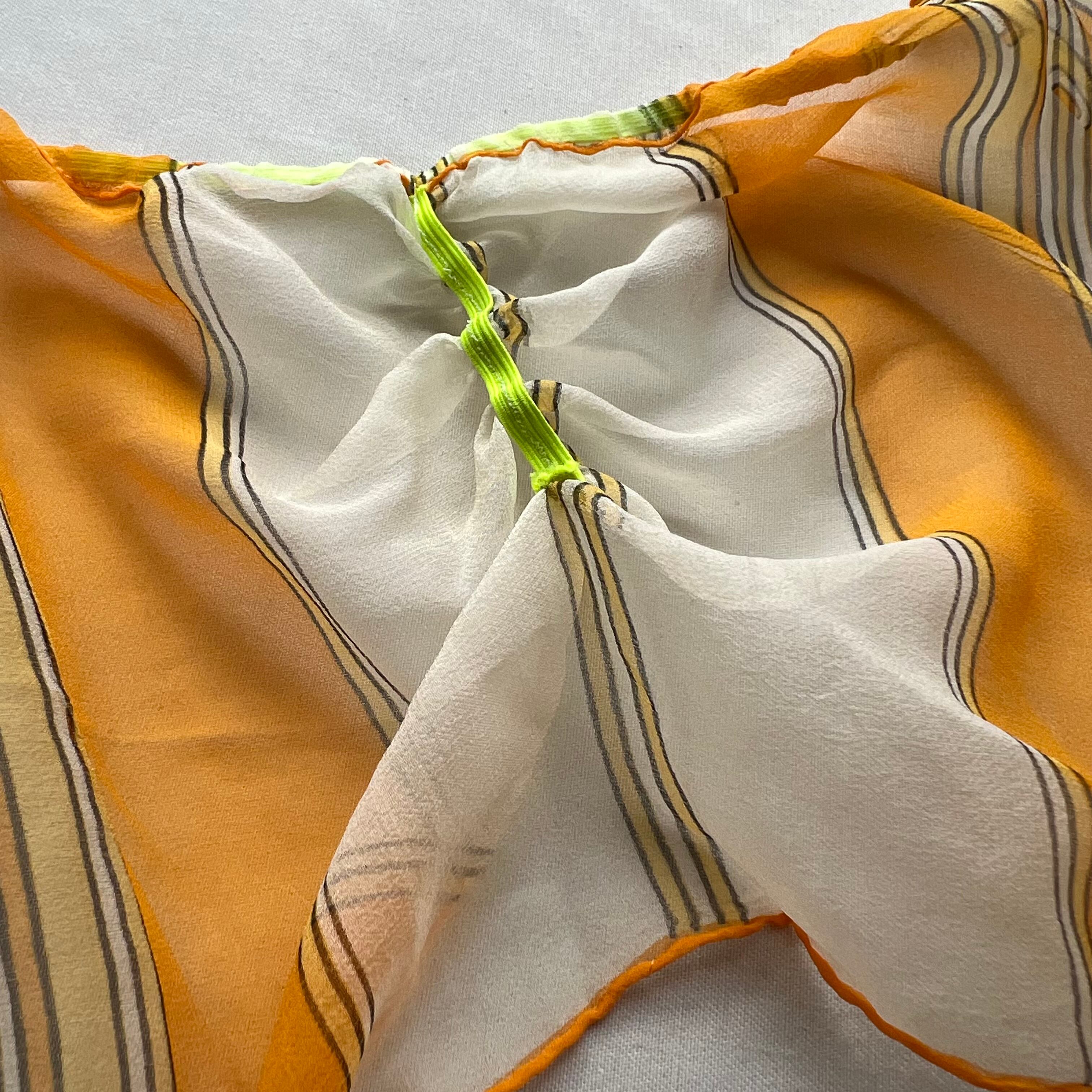 単にスカーフを巻くだけでは落ちてきてしまうので胸の上部分にゴムを入れ、フロント真ん中にギャザーを寄せポイントに。