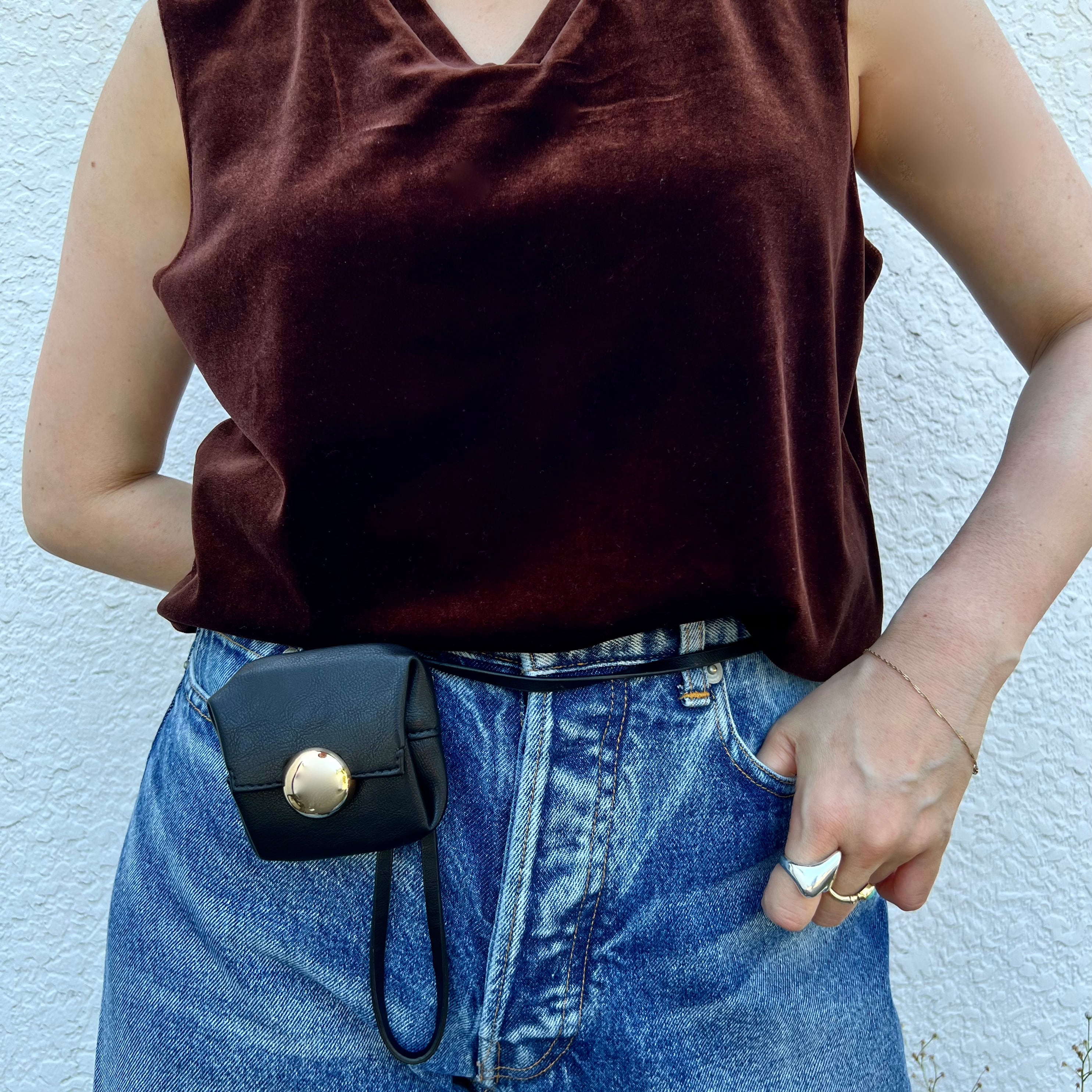 長いほうのストラップを腰に巻き付けて、ベルトのように使うスタイリングもおすすめ。