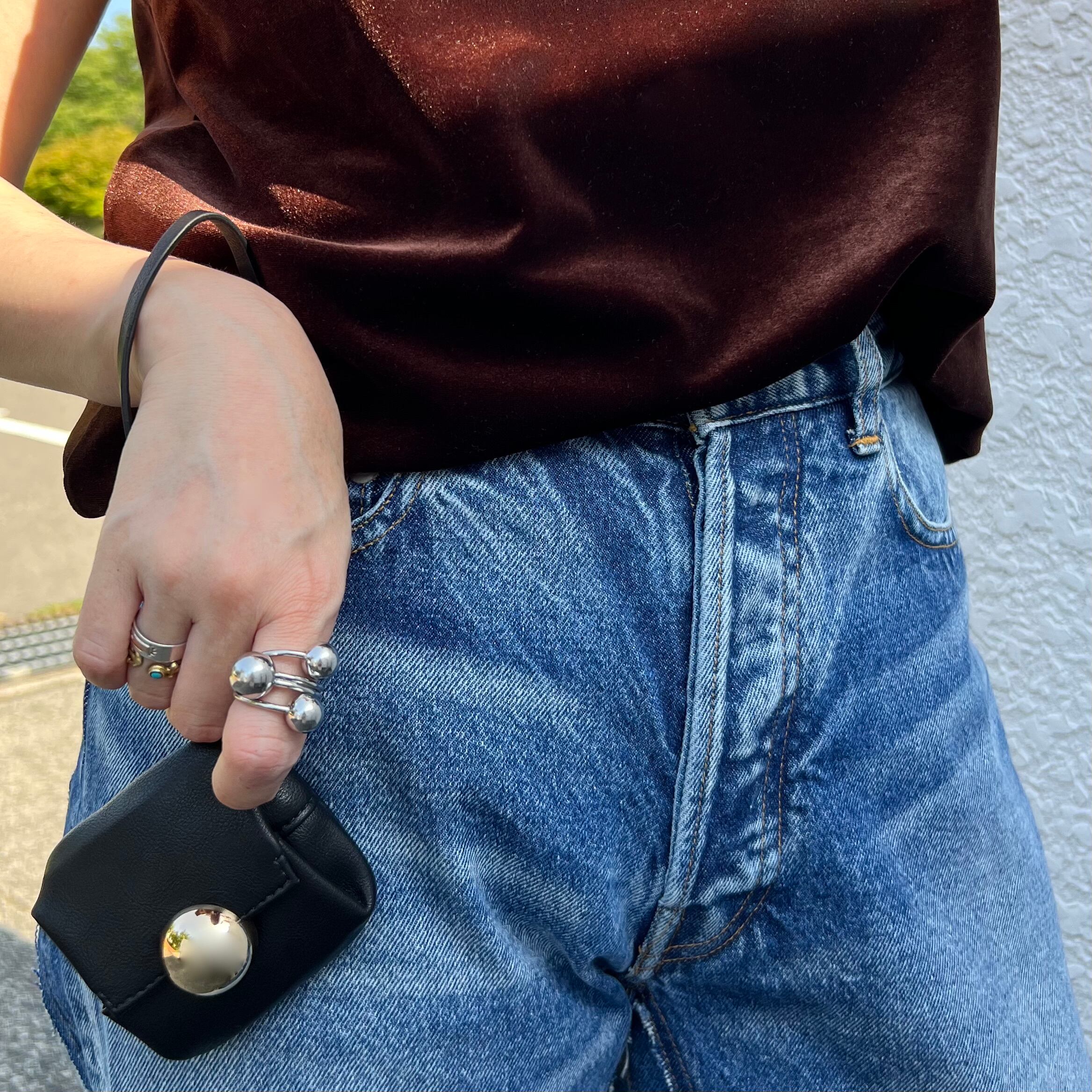 中央についた丸いモチーフ金具がポイントのミニウォレット。