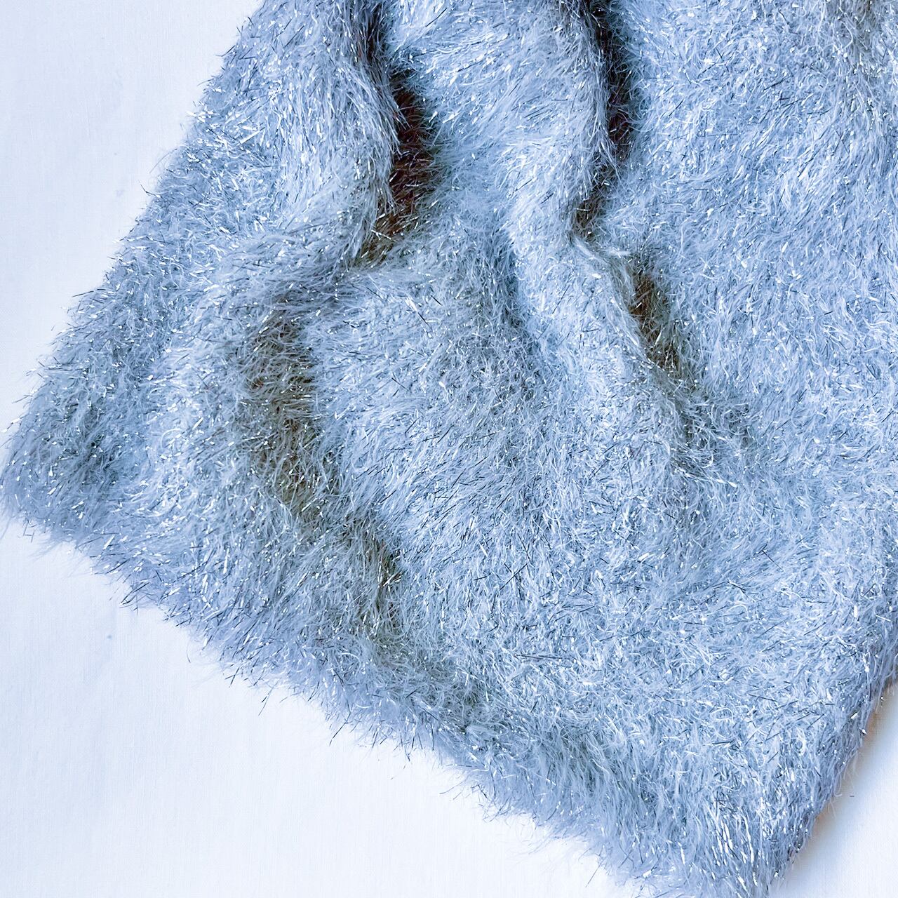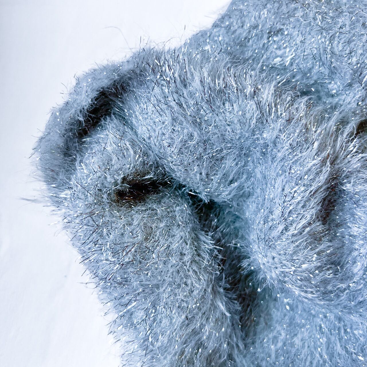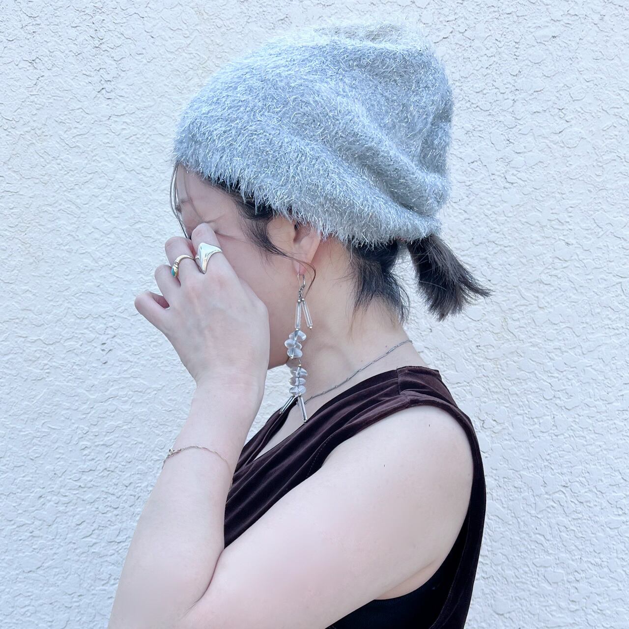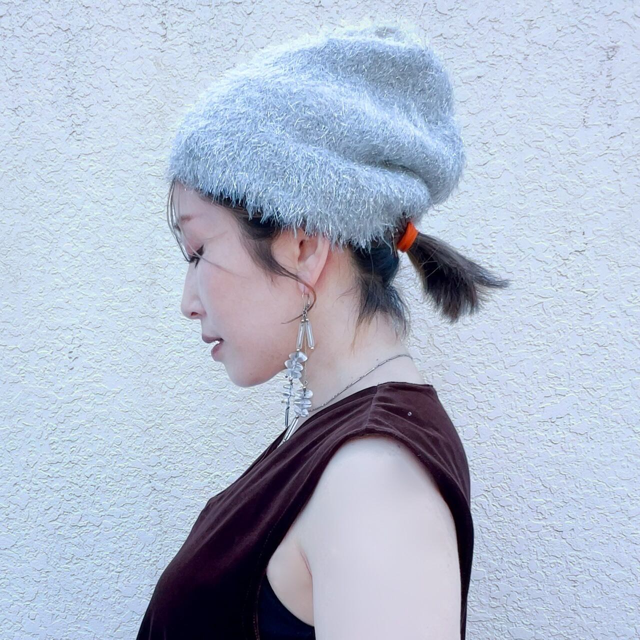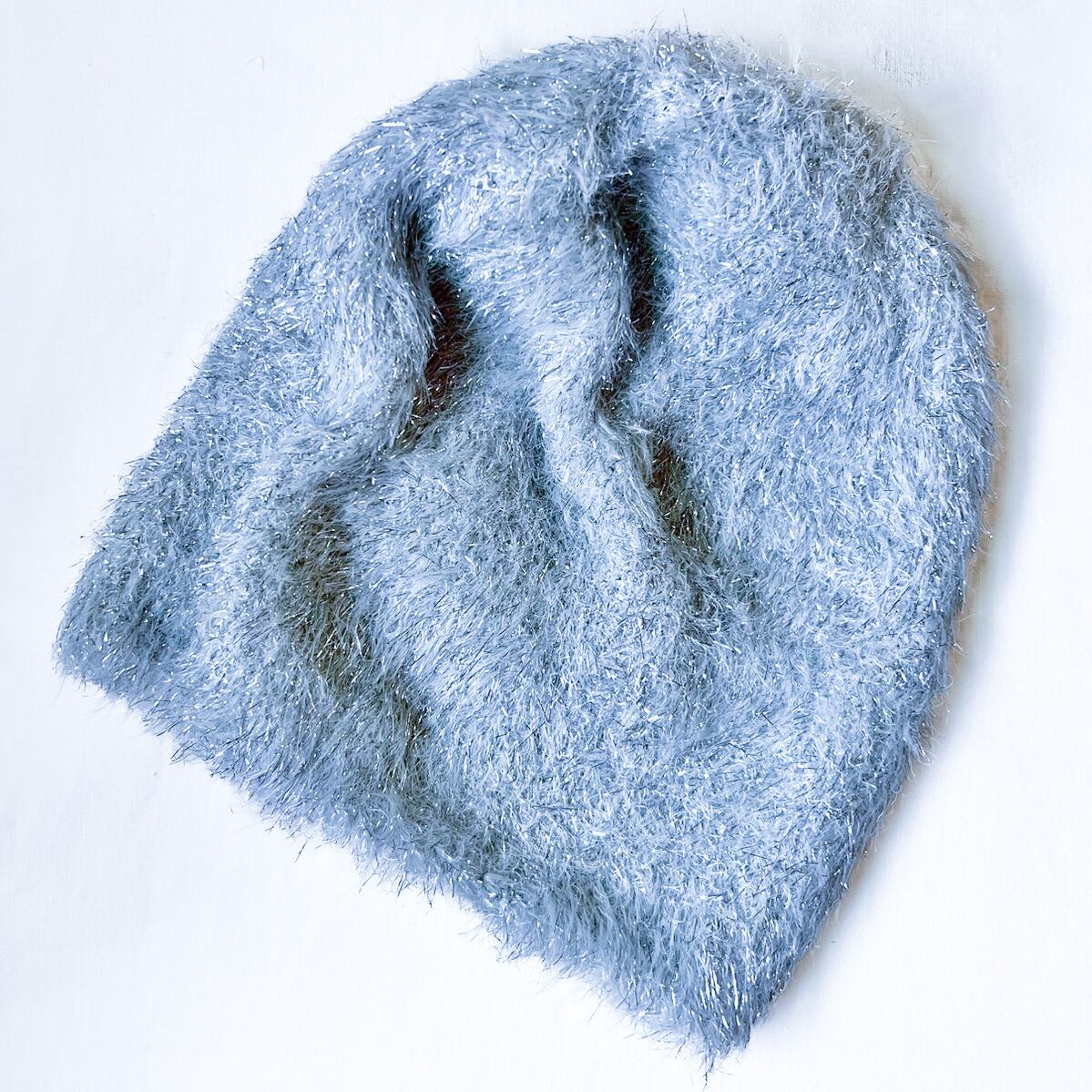 フェザーヤーンとラメ糸の引き揃えたニット帽。