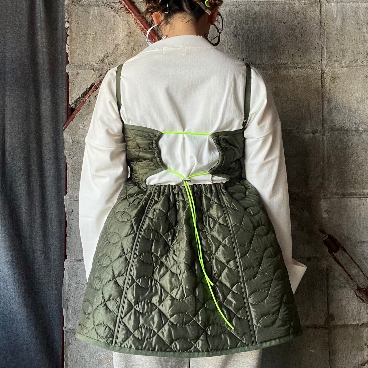 Aラインシルエット+胸元ギャザーの女性らしいデザインに、蛍光カラーのドローコードがポイント。