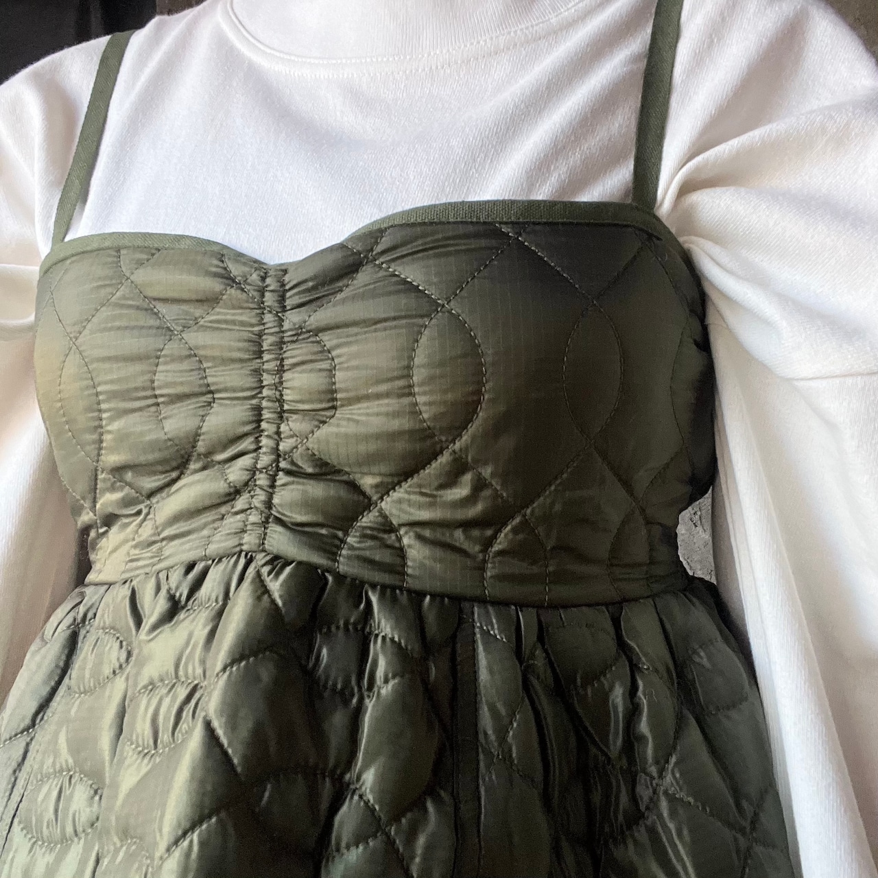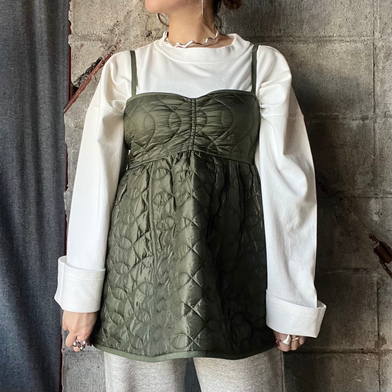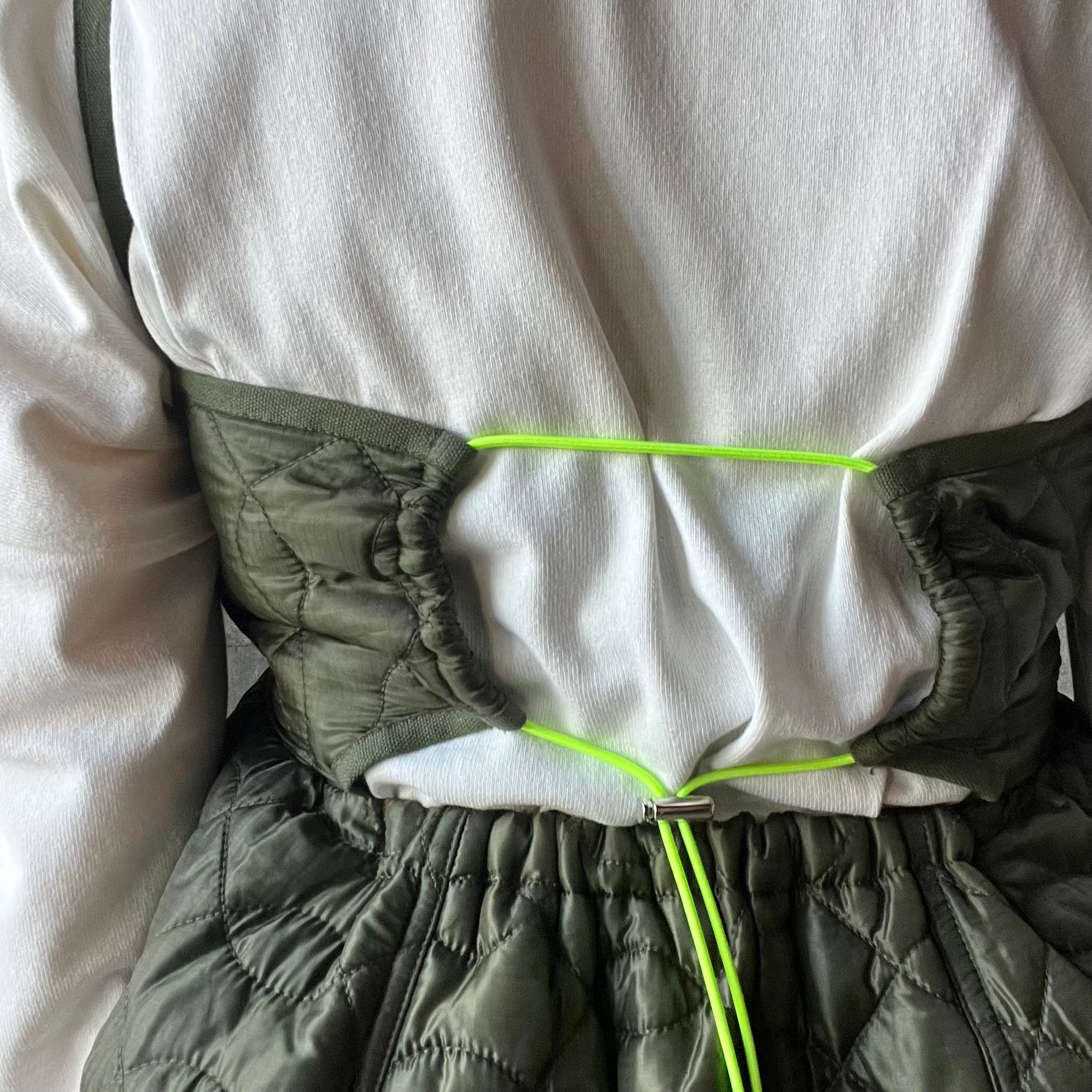 軍モノでも珍しいクロスウェーブステッチのキルトライナーをリメイクしたイメージのキャミベスト。程よい薄手な素材感なのでごわつきがないのも◎。