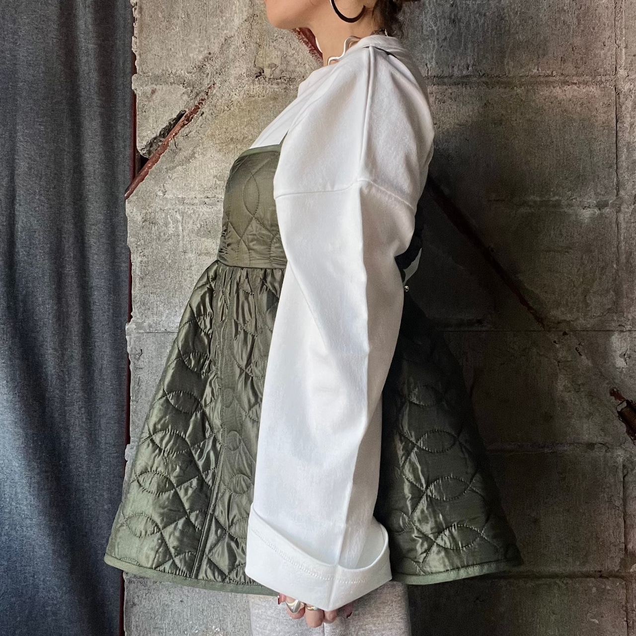 サイズ調節が可能なので、薄手のもの〜スウェット等にも重ねられ様々なレイヤードスタイルが楽しめます。