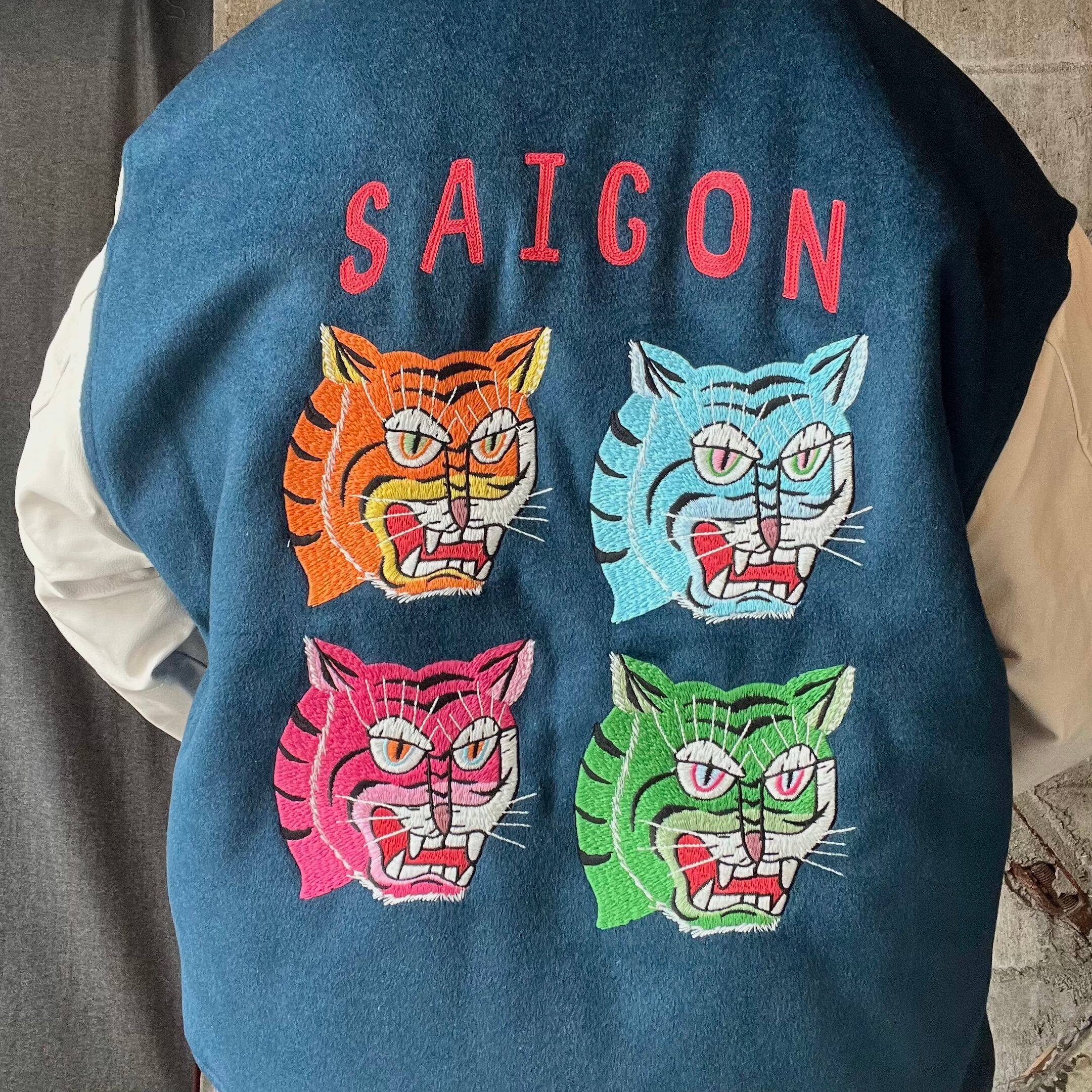 鮮やかなカラーにトラの刺繍をフロント、バッグともにに刺繍したインパクト大の1枚。