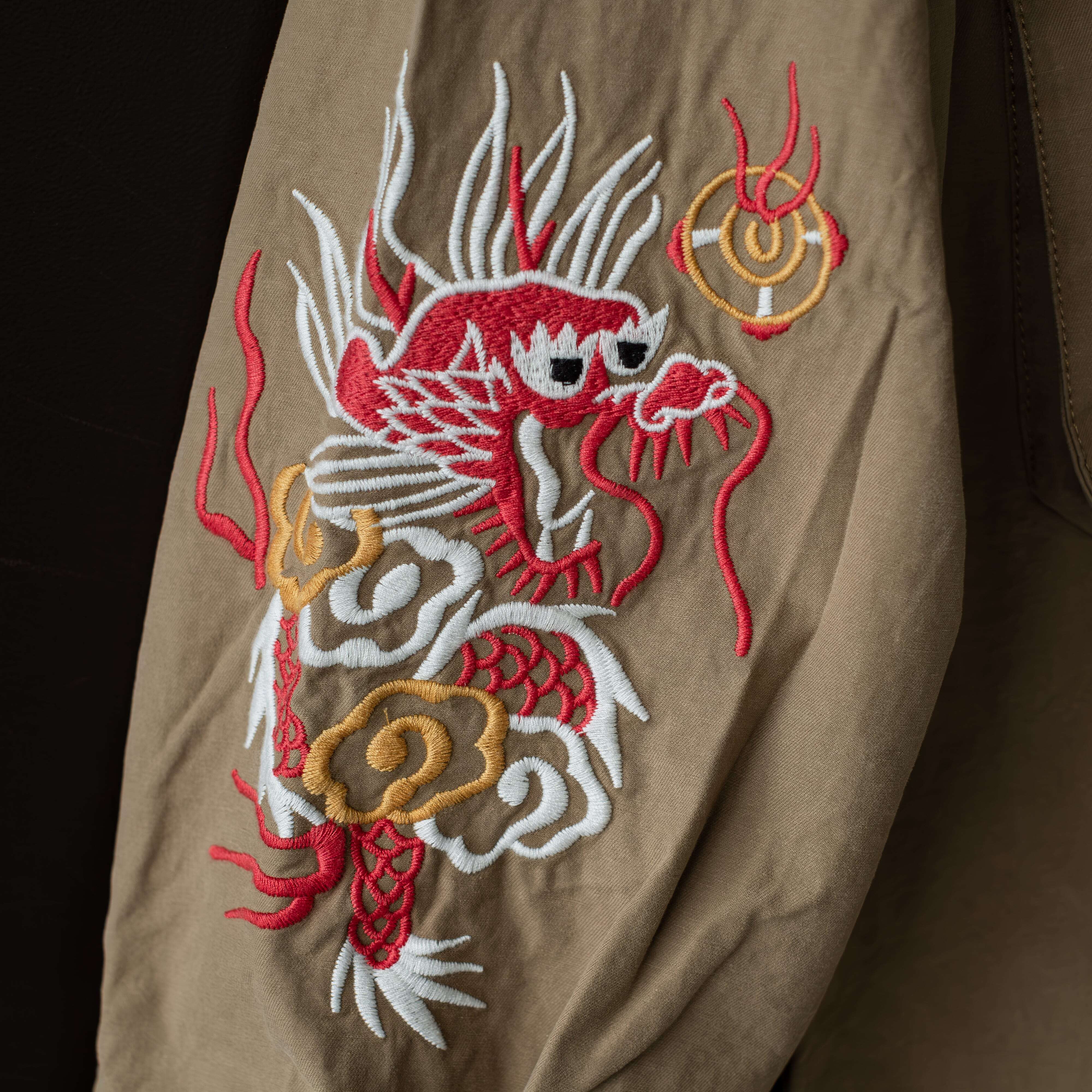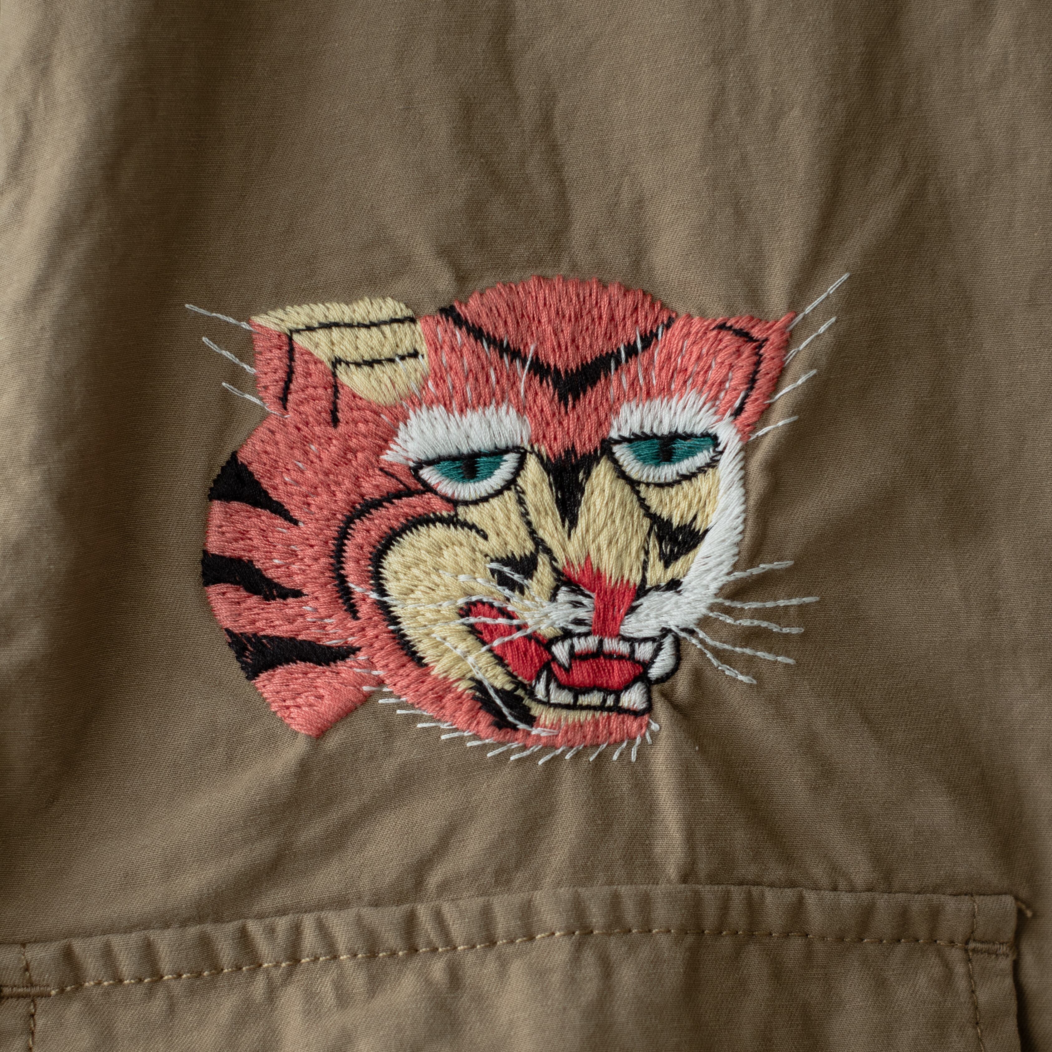 ヘビーウェイトのバックサテンを使用した刺繍入りのファティーグシャツ。