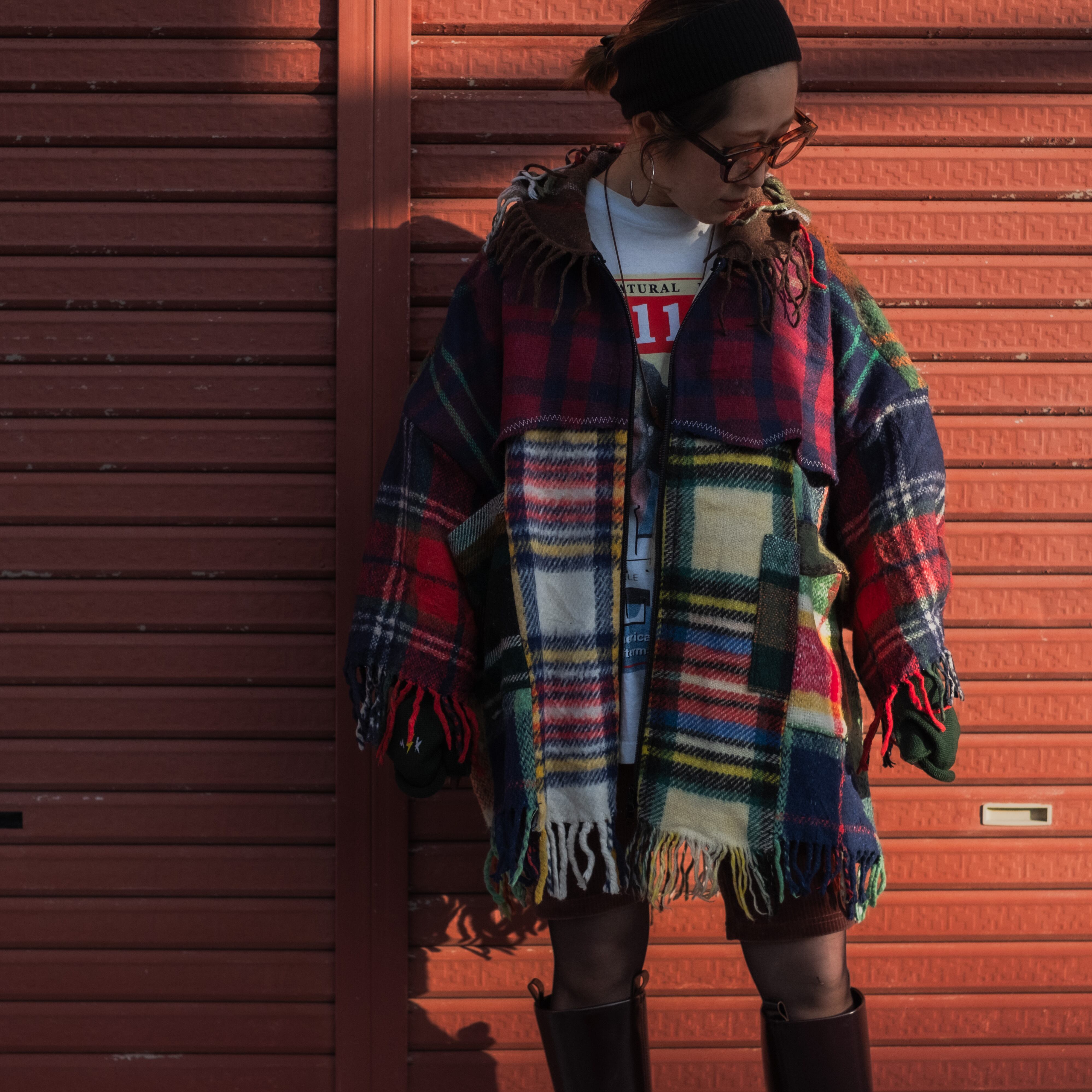 希少な古着のラグをふんだんに使用し製作されたリメイクポンチョアウター。