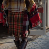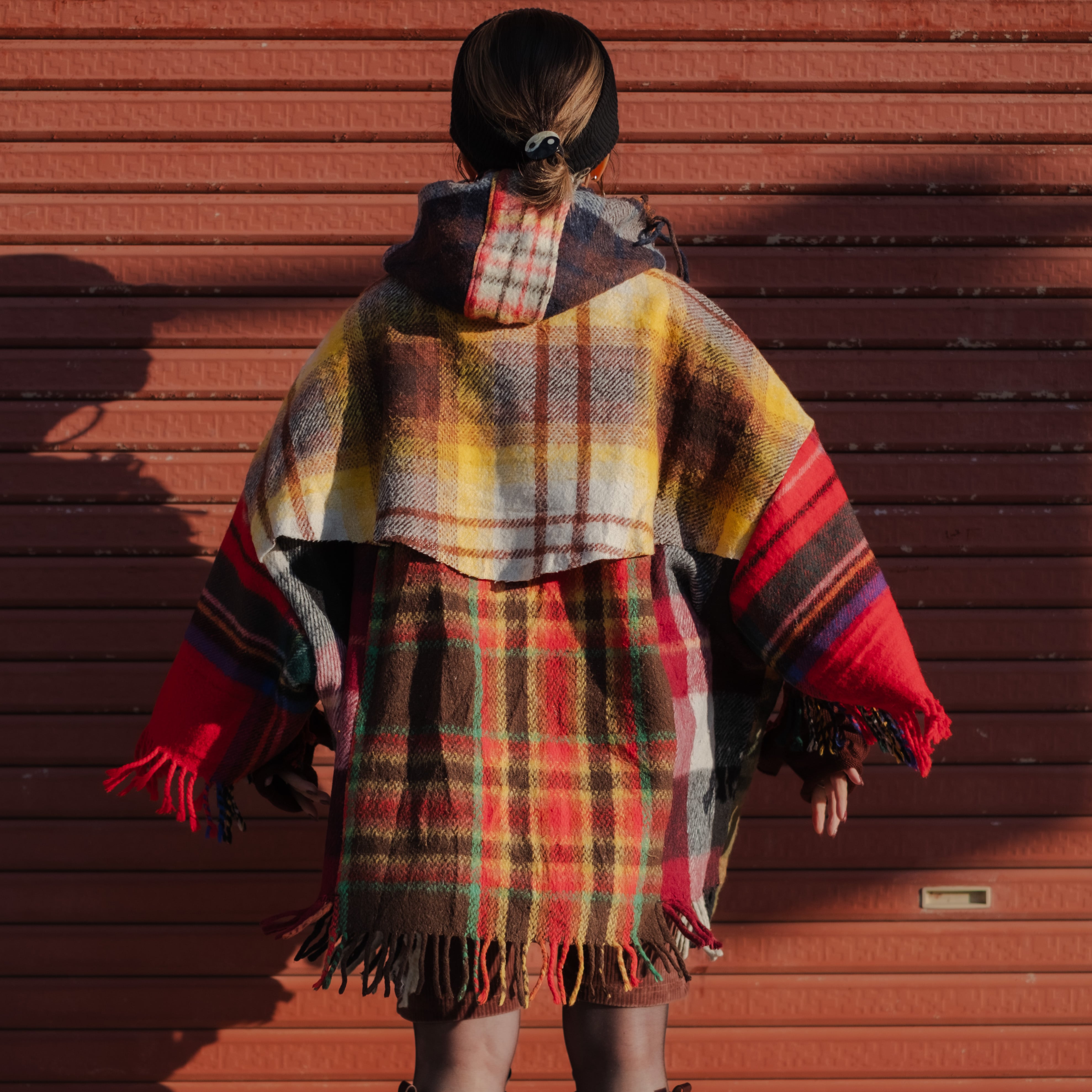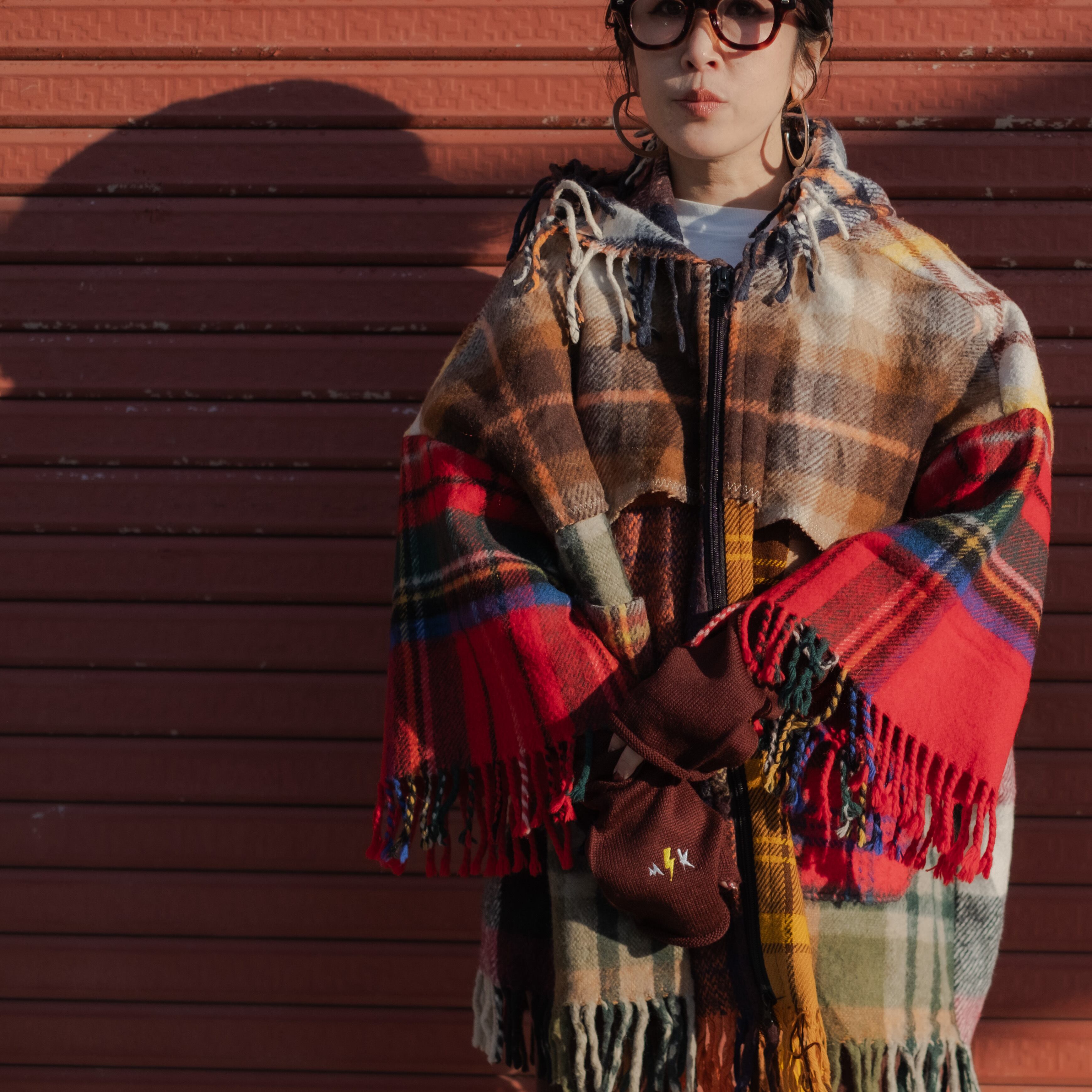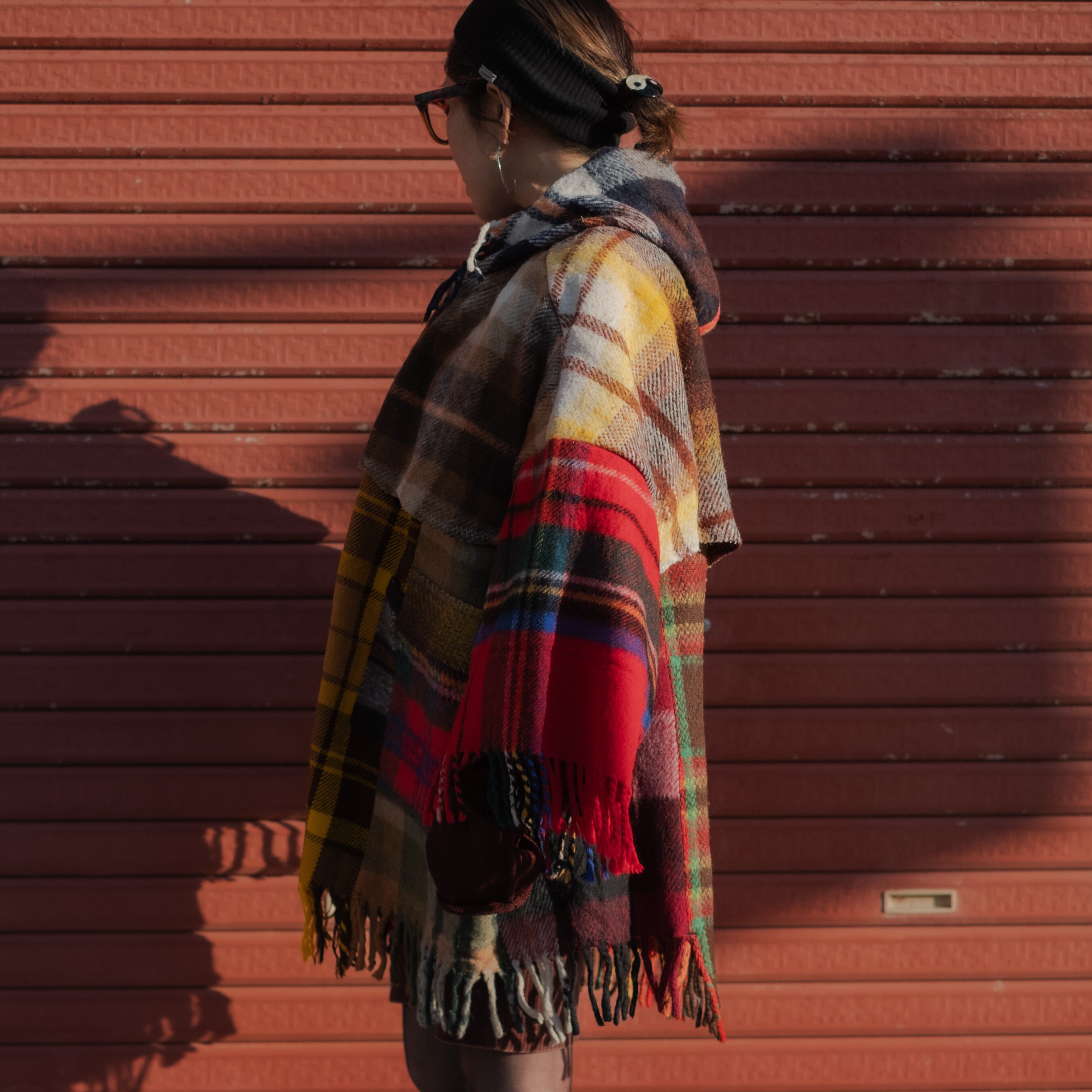 希少な古着のラグをふんだんに使用し製作されたリメイクポンチョアウター。