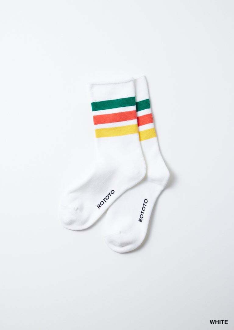 70年代のチューブソックスからインスパイアされたストライプソックス。スポーティな白ソックスとは一味違う、ポップなカラーが足元を楽しく彩ります。