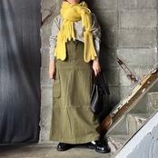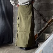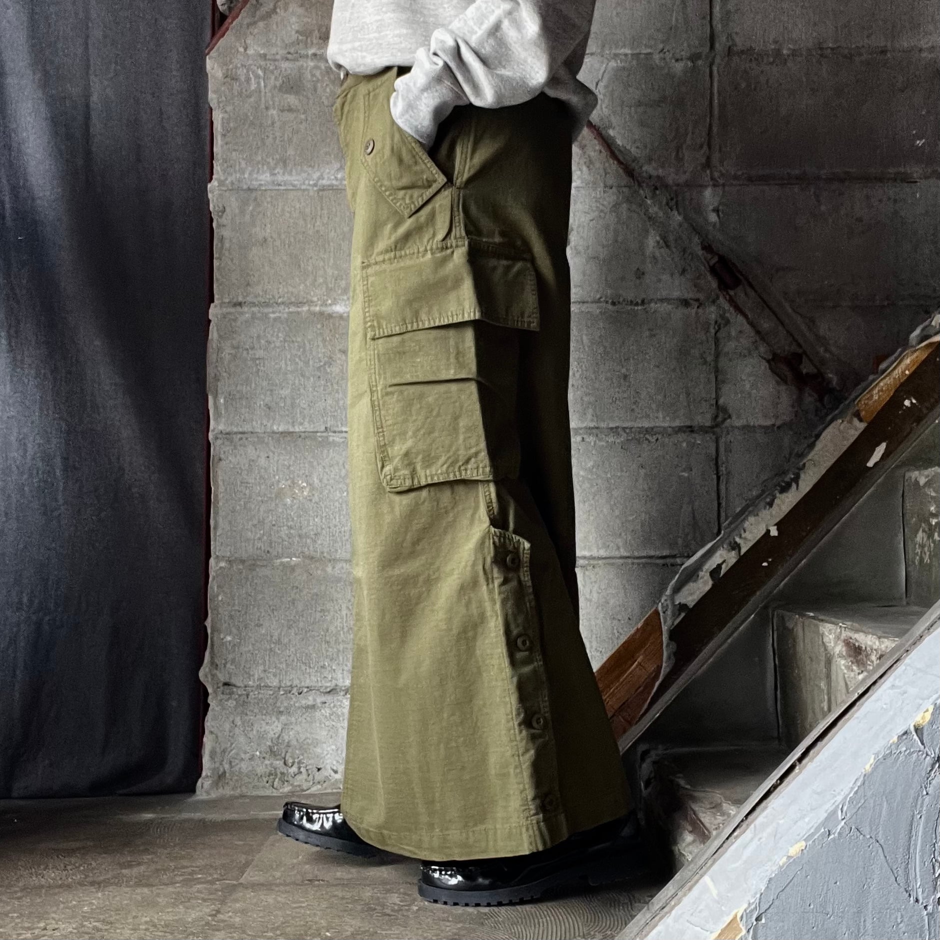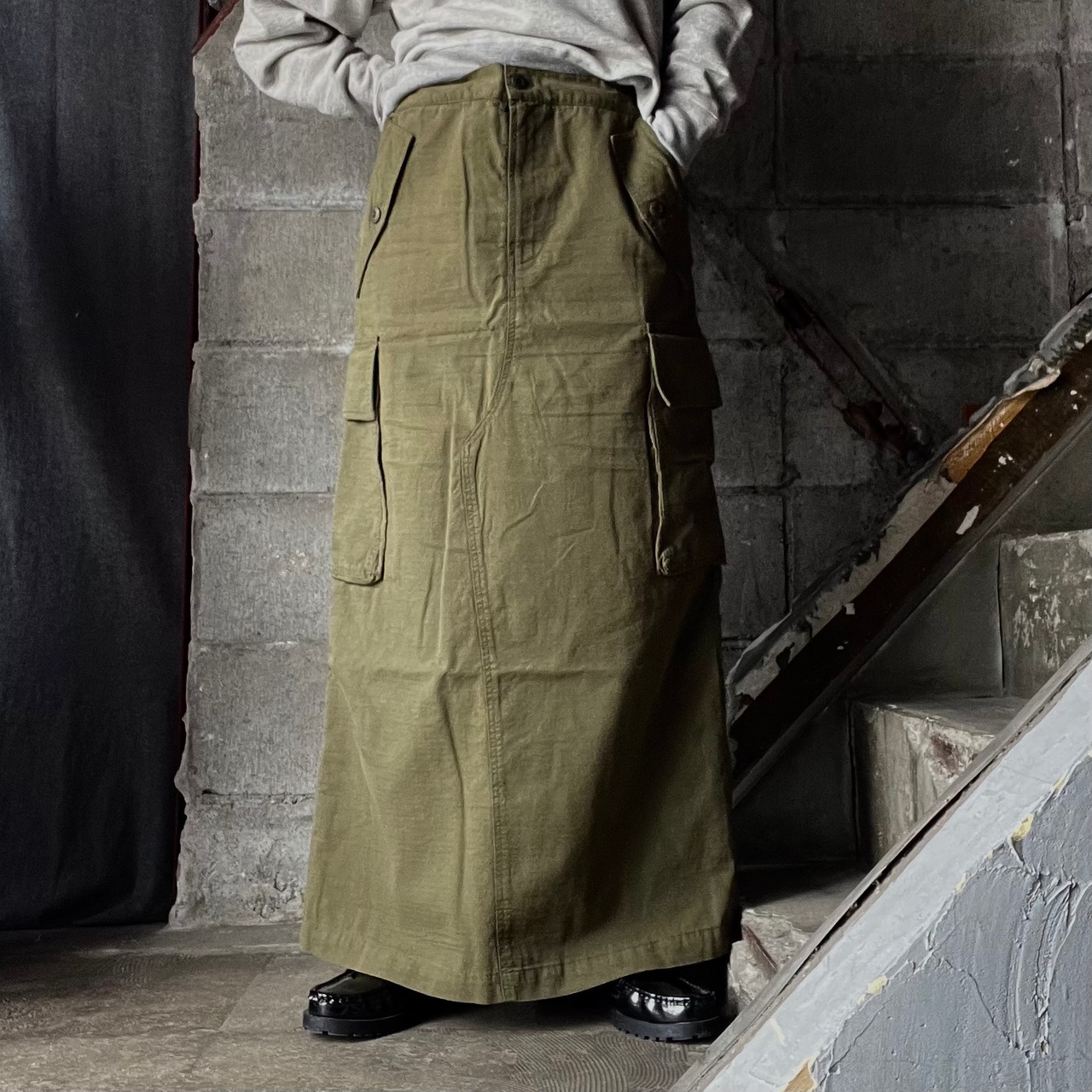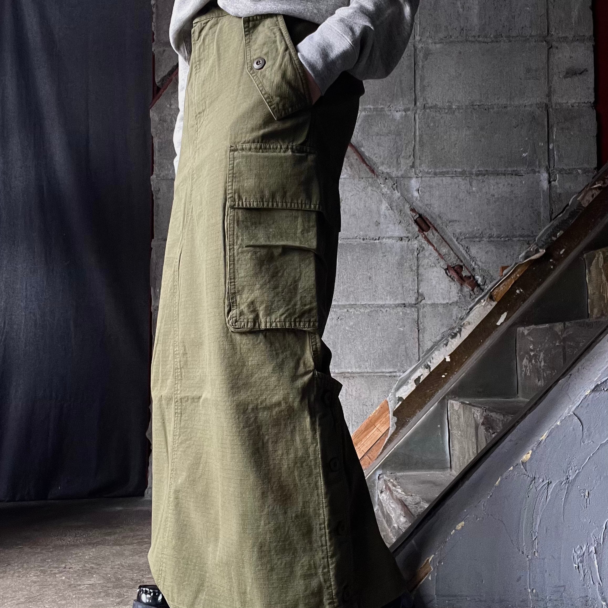 ミリタリーのオーバーパンツをスカートにリメイクしたイマージでデザイン。
