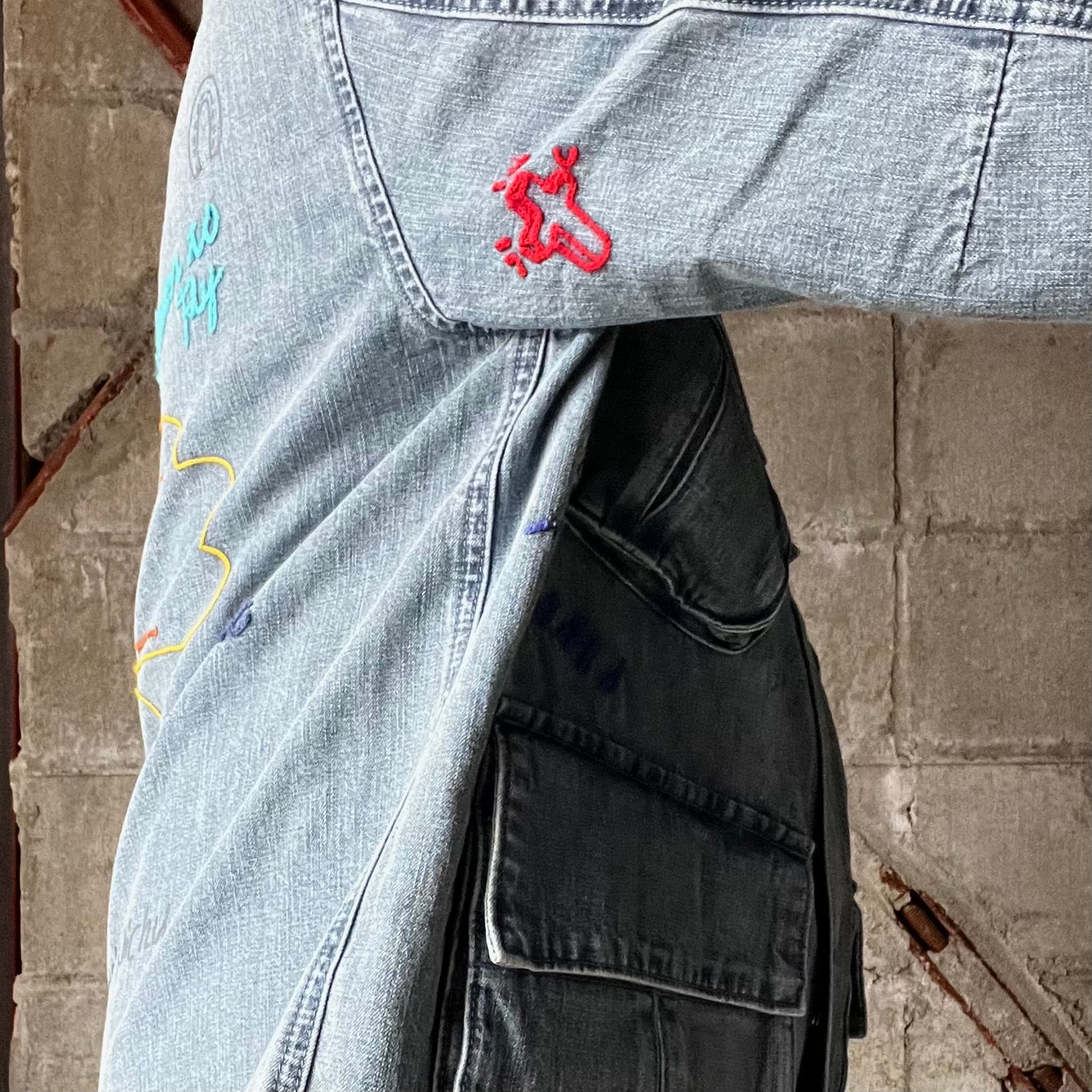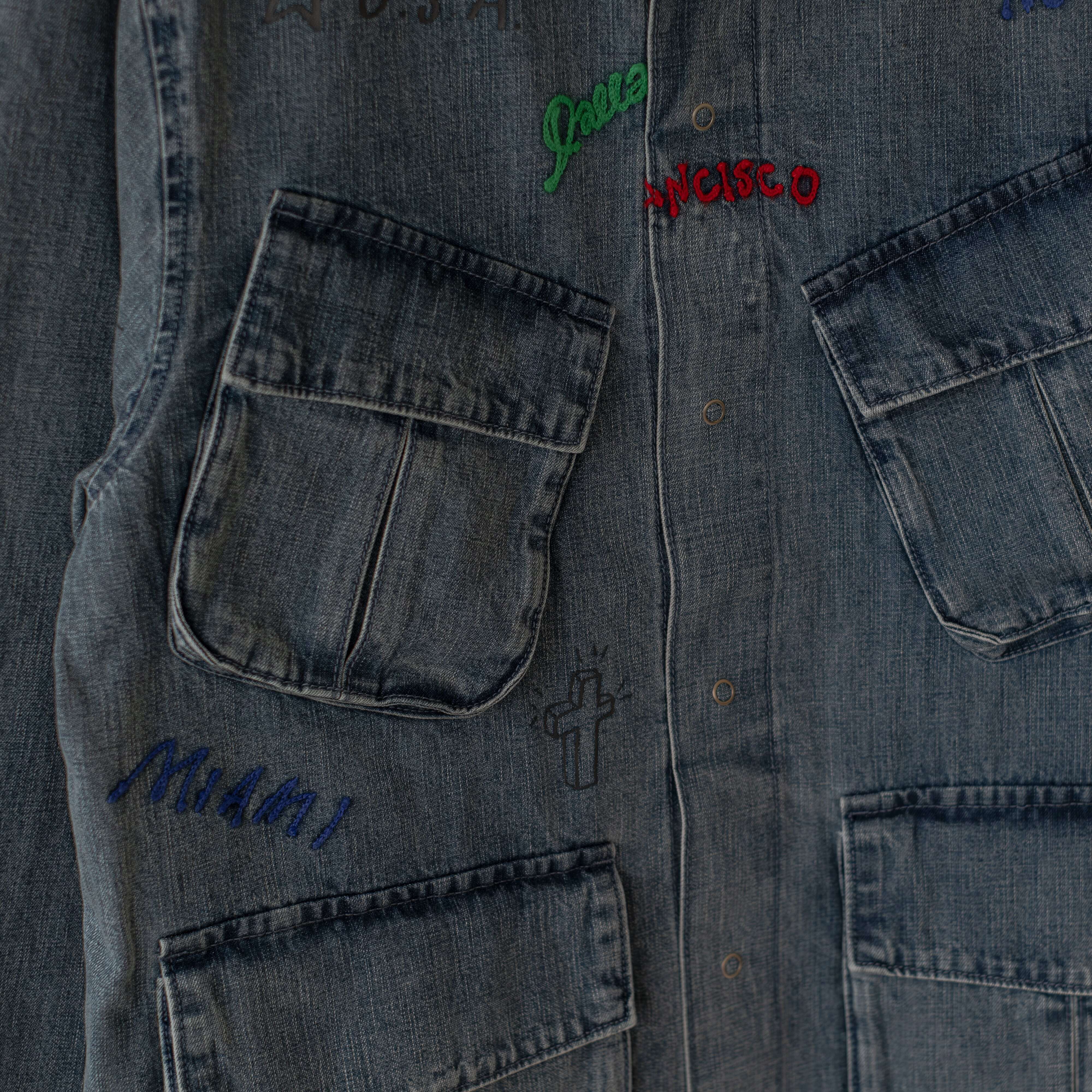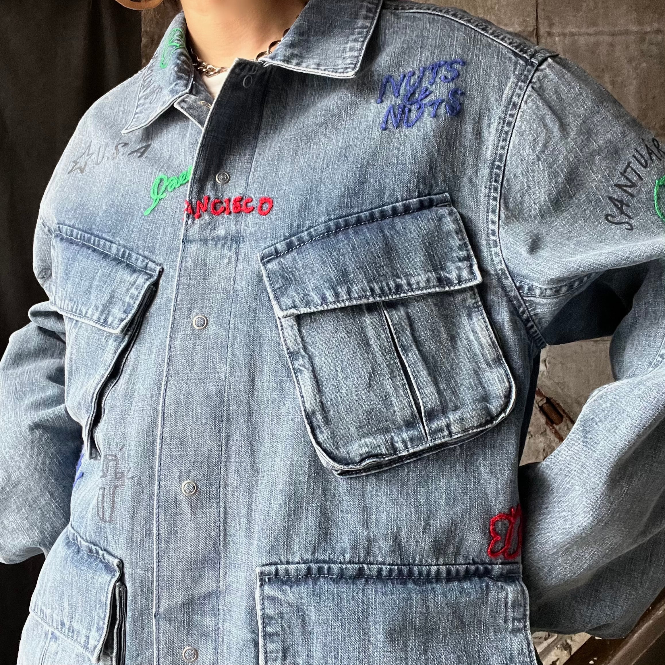 オリジナルのリメイク刺繍が特徴的なデニム素材でファティーグタイプのいいとこ取りジャケット。