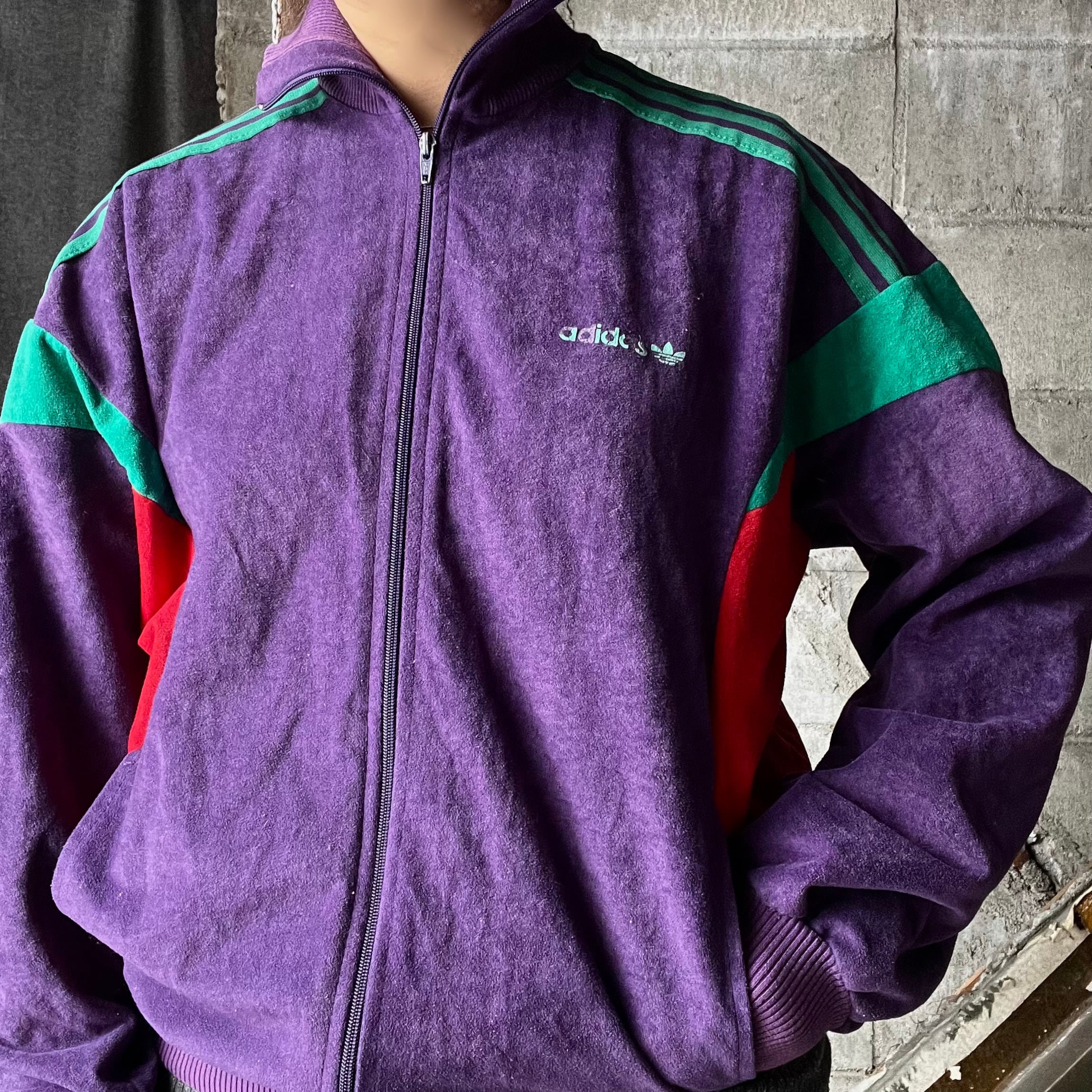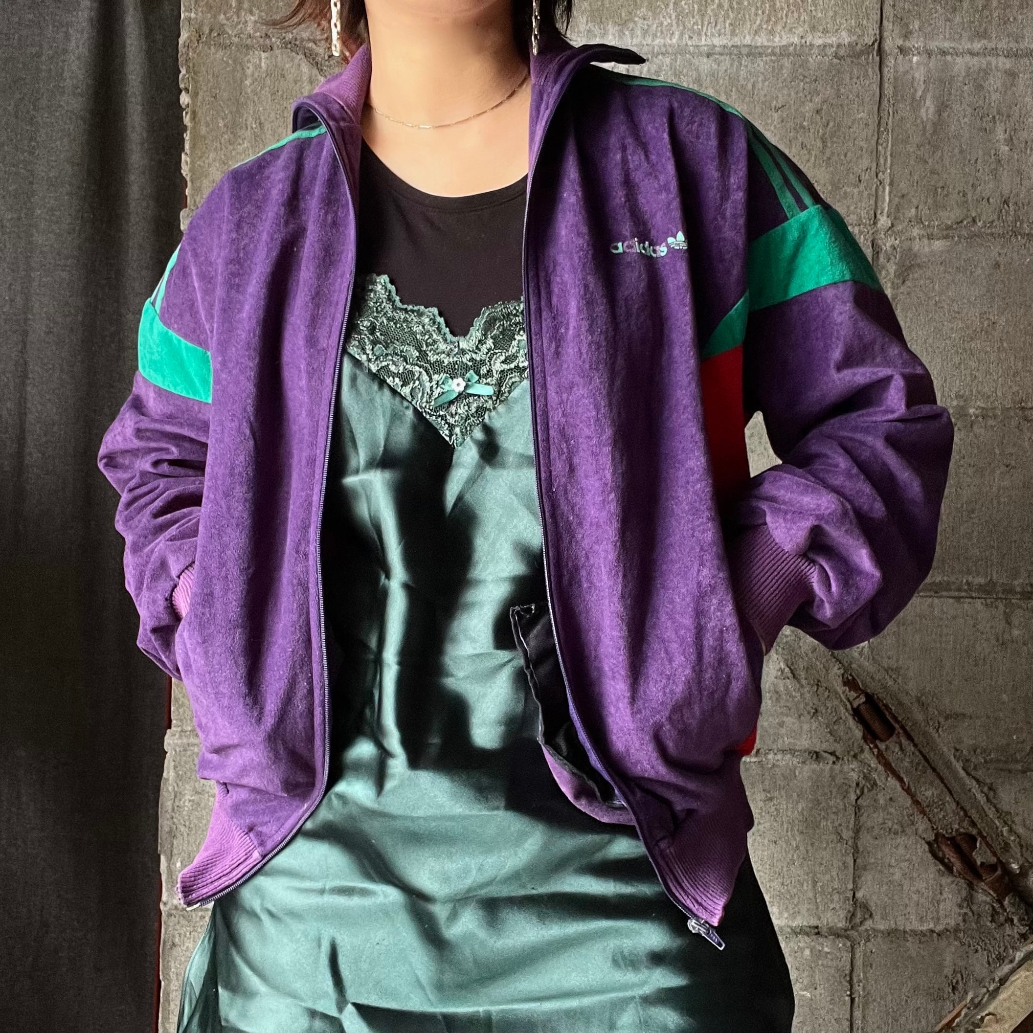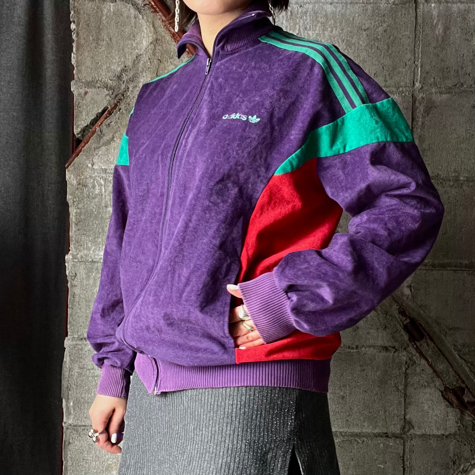 adidasのベロア素材のトラックジャケット。