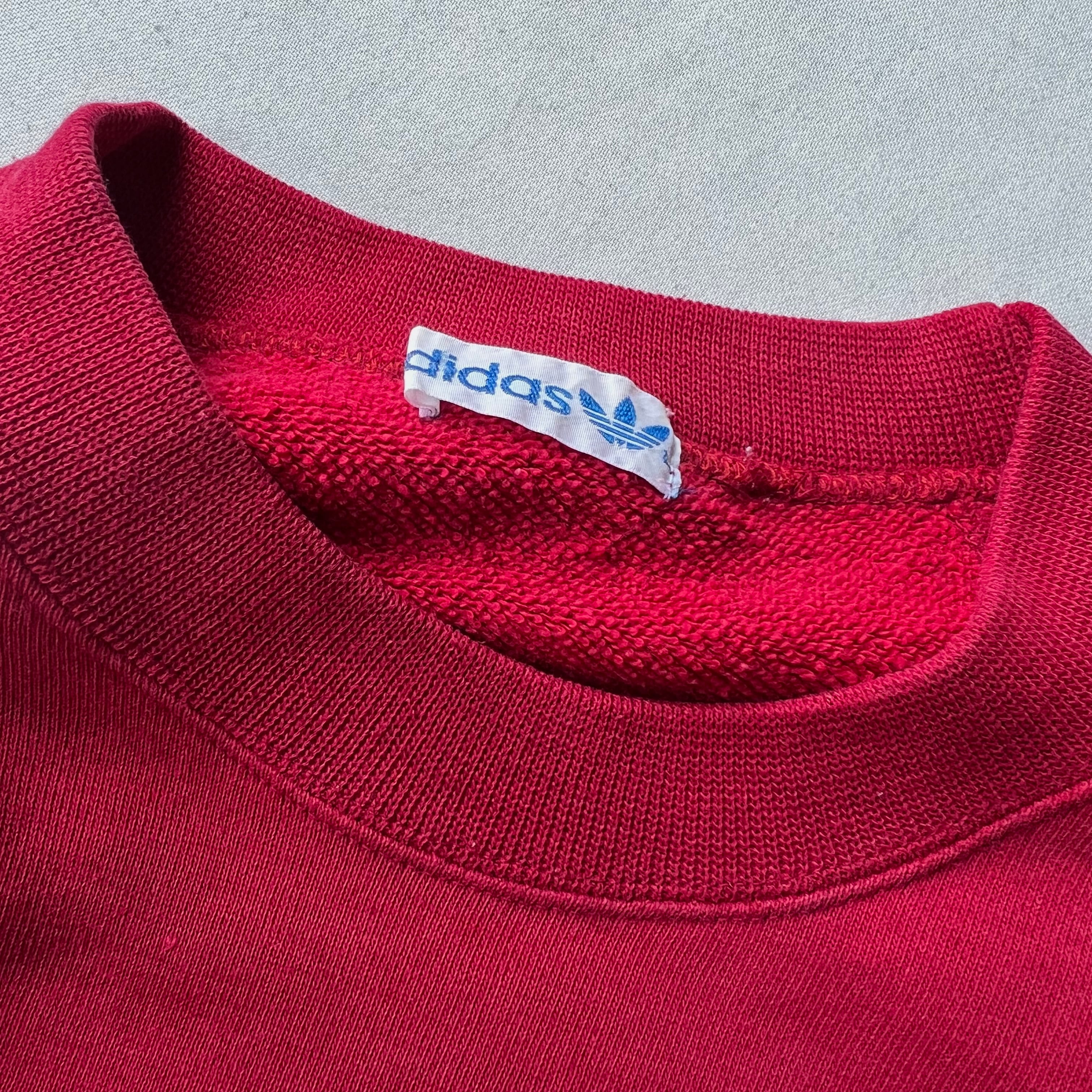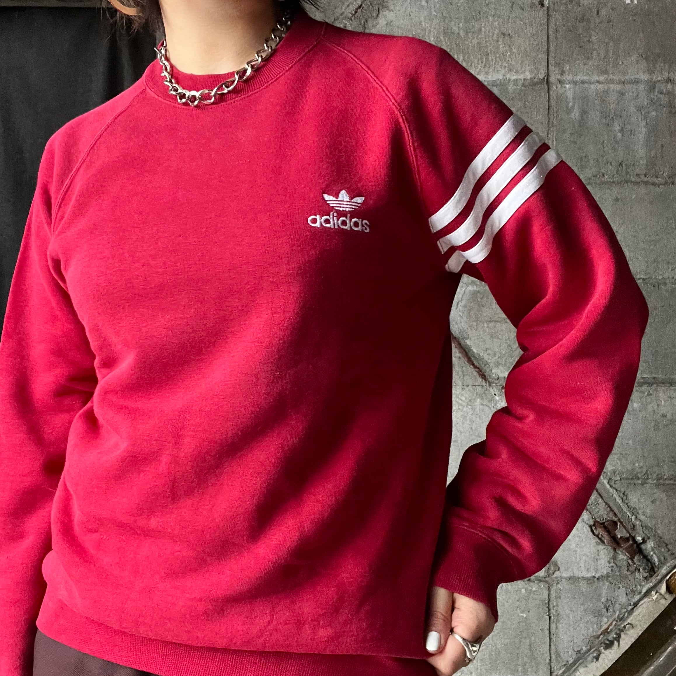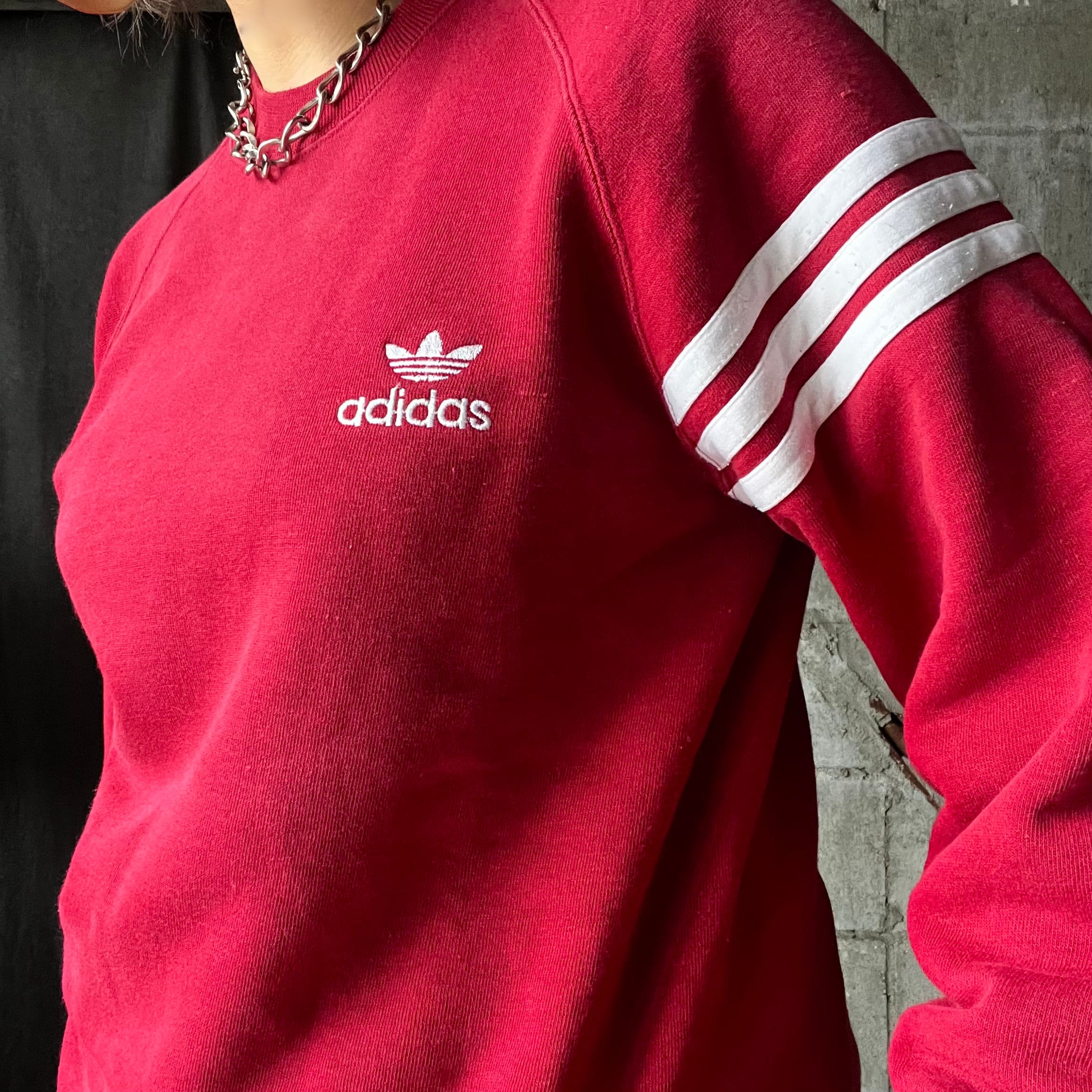 adidasのスウェットプルオーバー。胸には三つ葉刺繍。