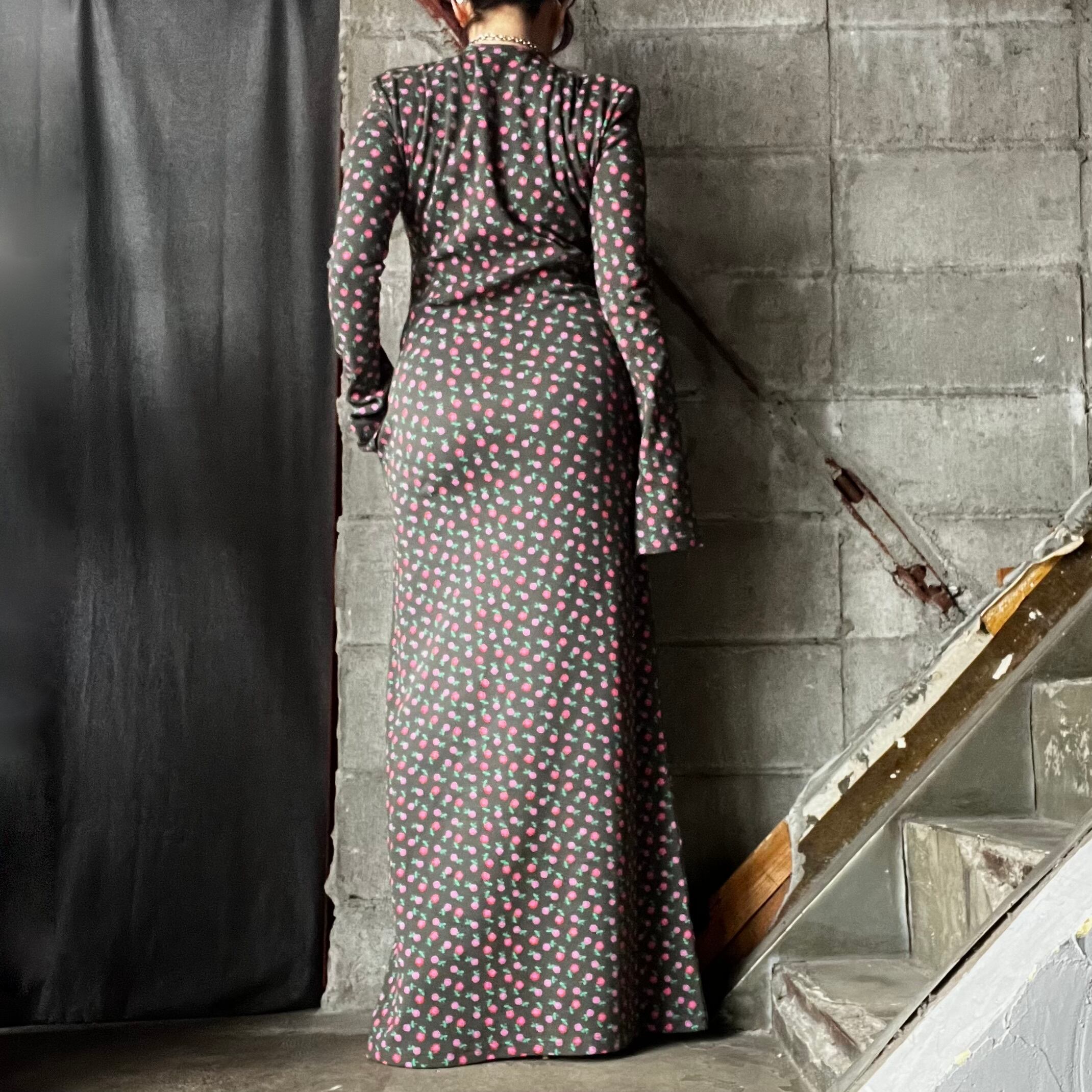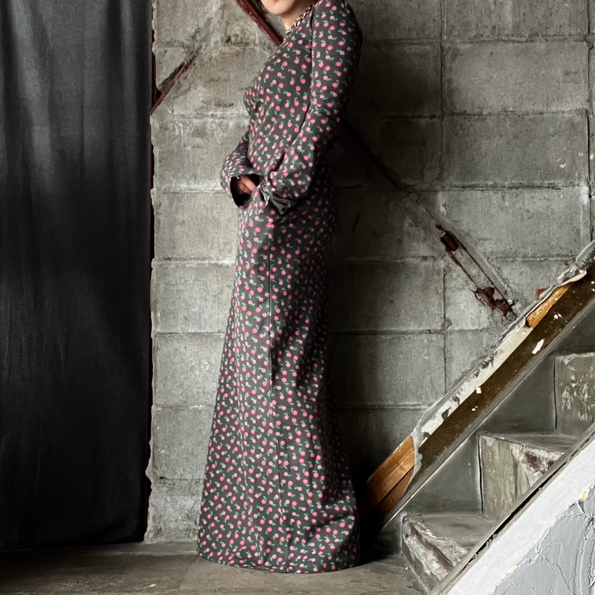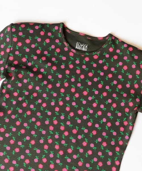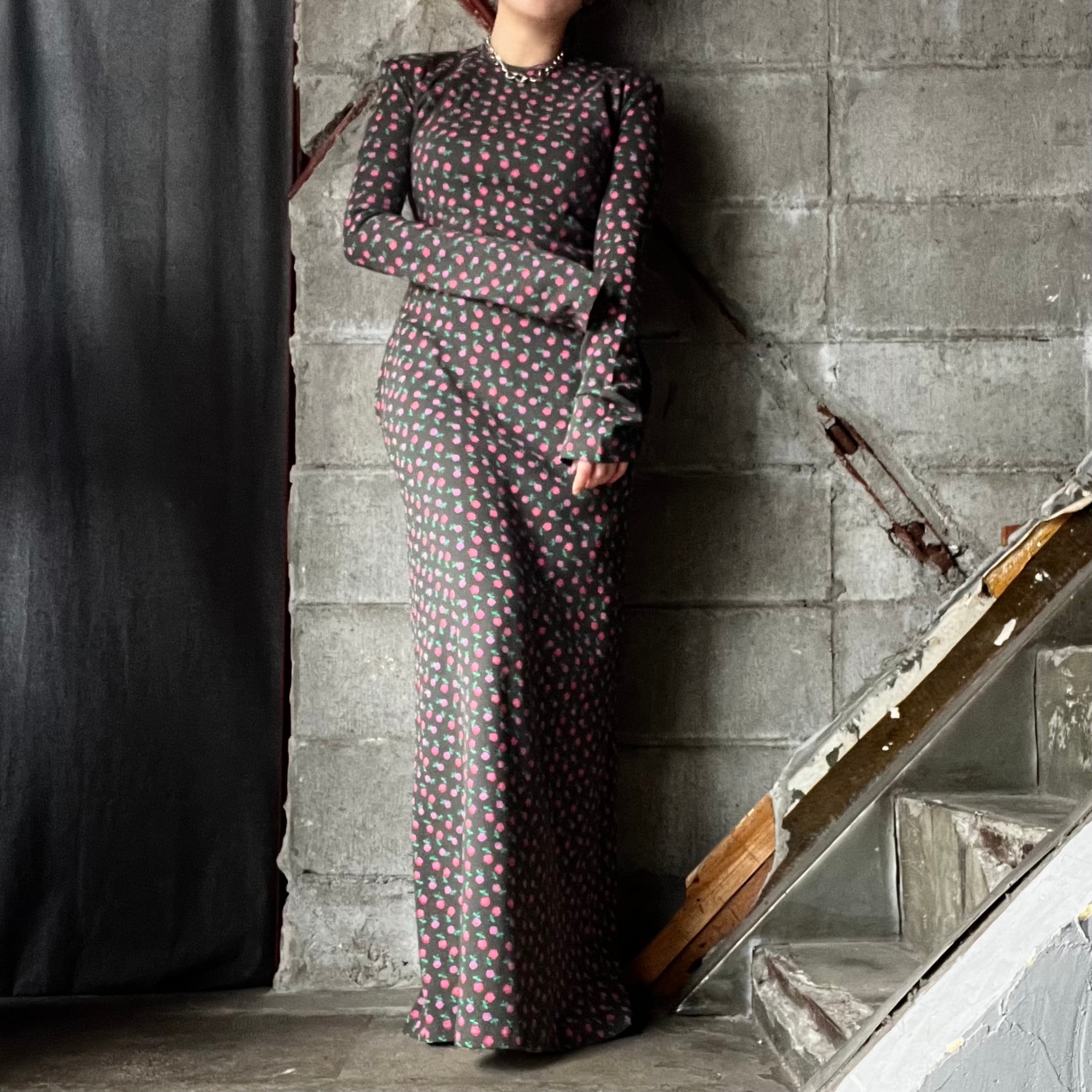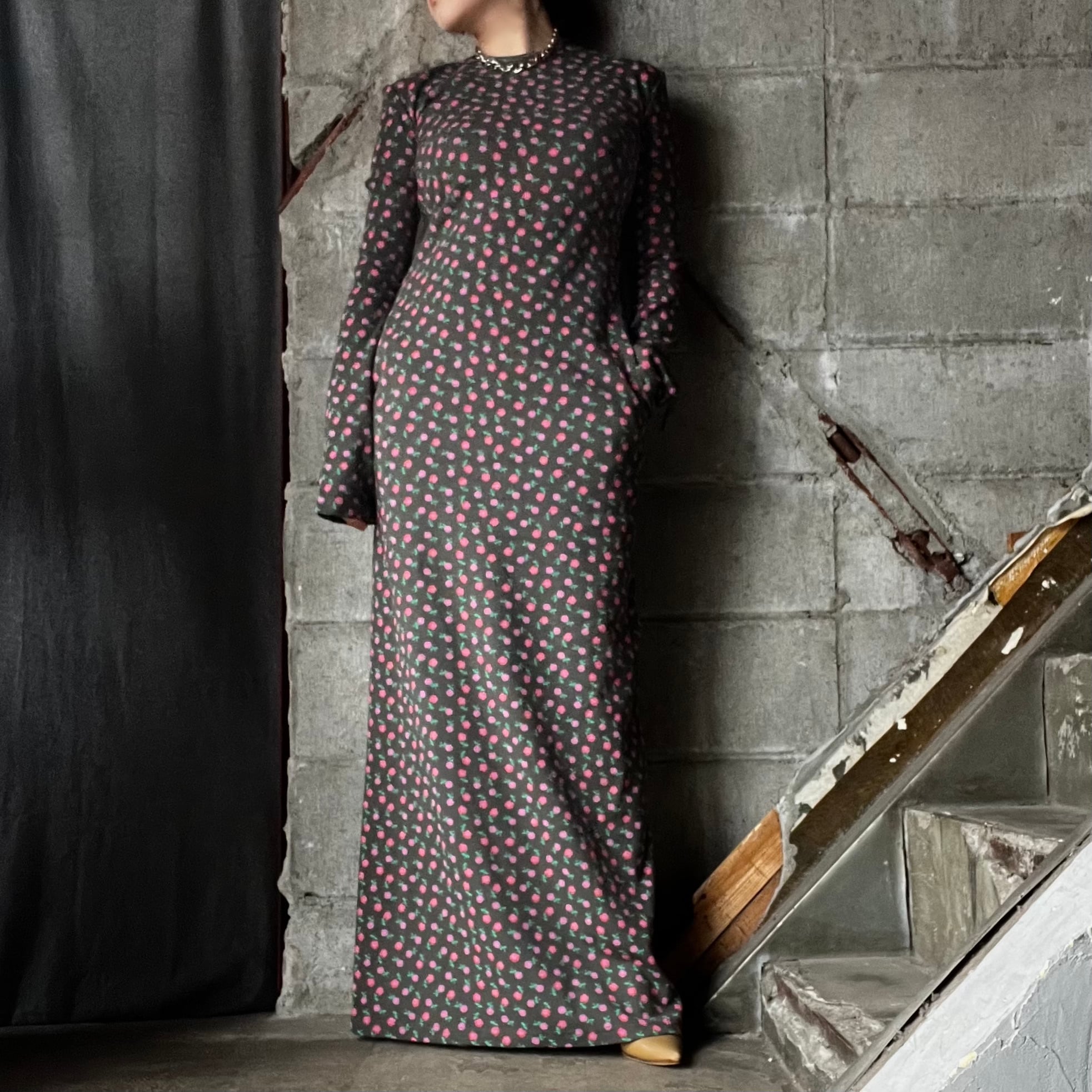 スーパー リブ 肩パッド クルーネック 長袖 カットソー ドレス ワンピース 花柄