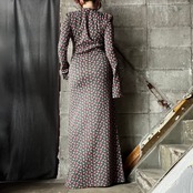 肩パッドの入った立体的なショルダーが印象的。袖はフレアで長めの仕様です。