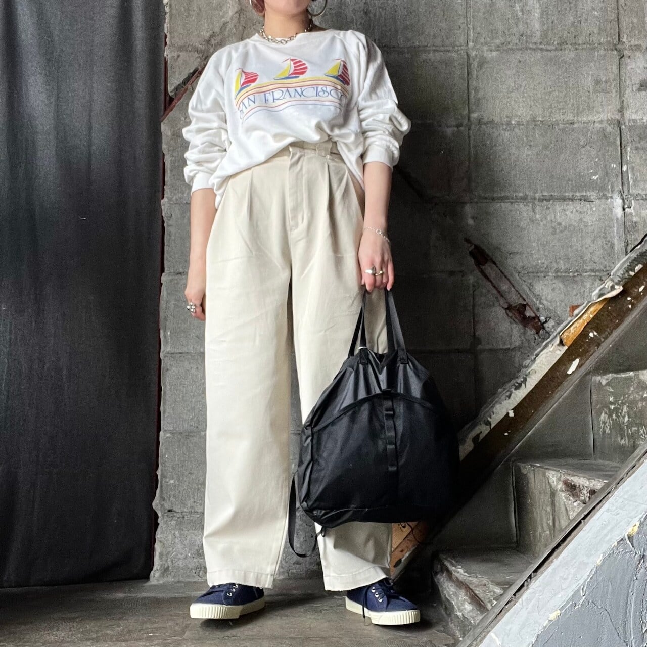 古着のスウェットで全体的にカジュアルな印象に。