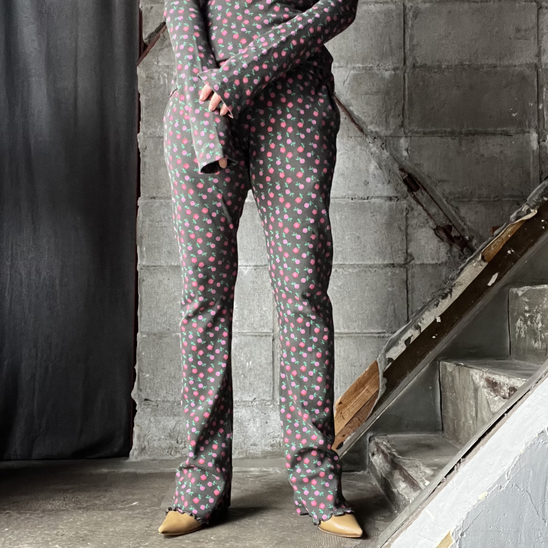 ガーリーな印象の小花柄のリブパンツ。