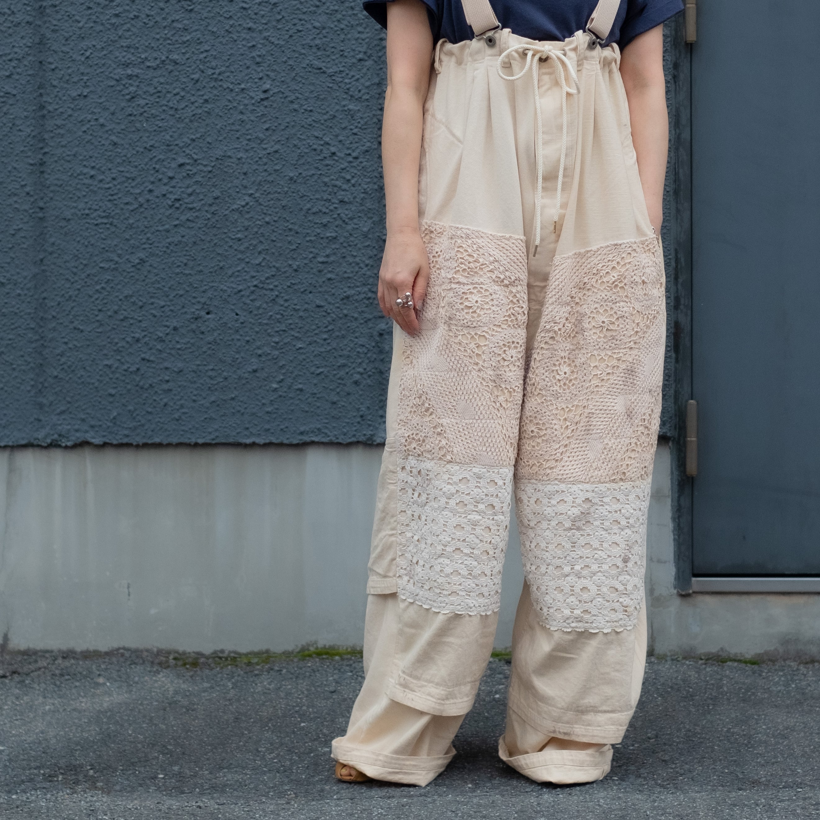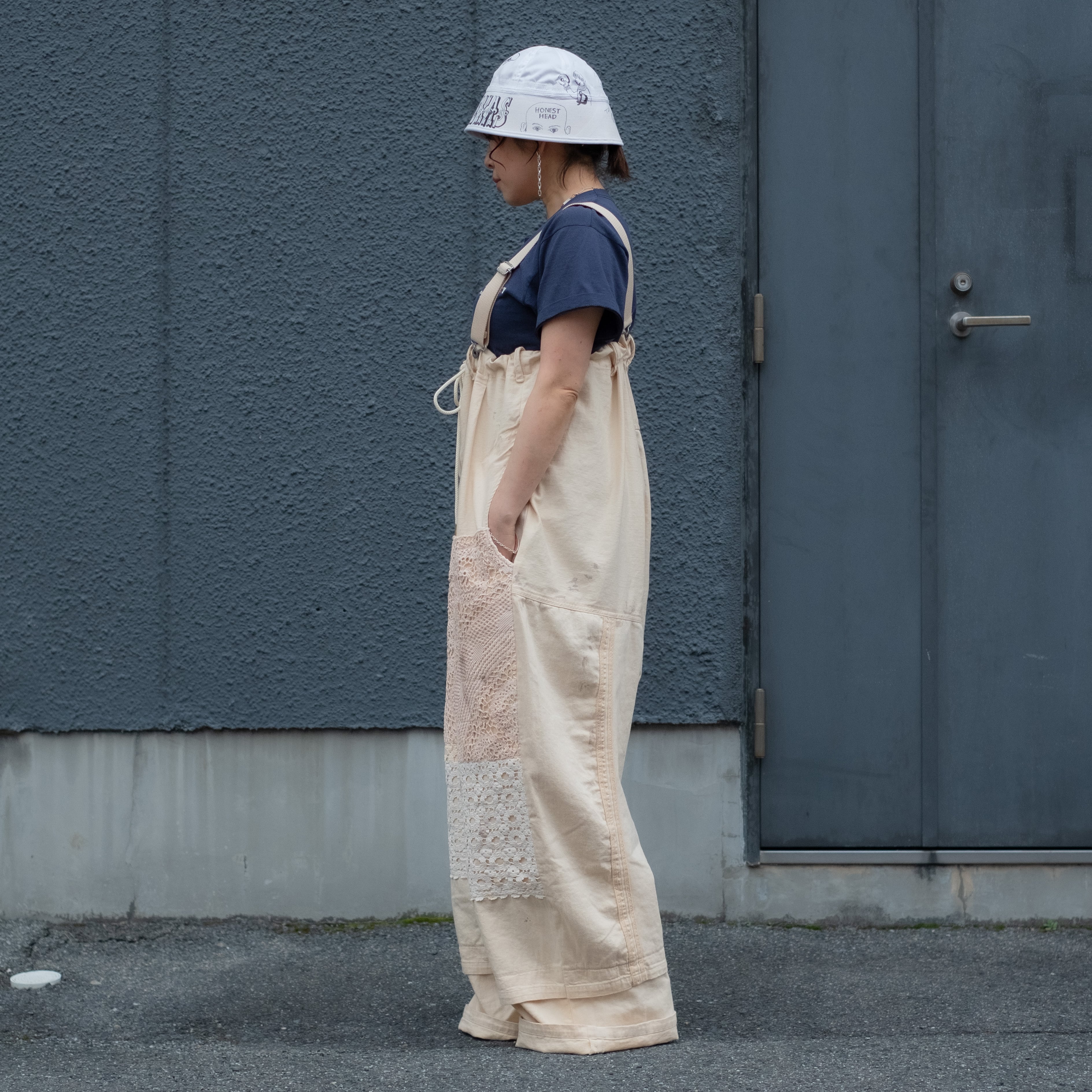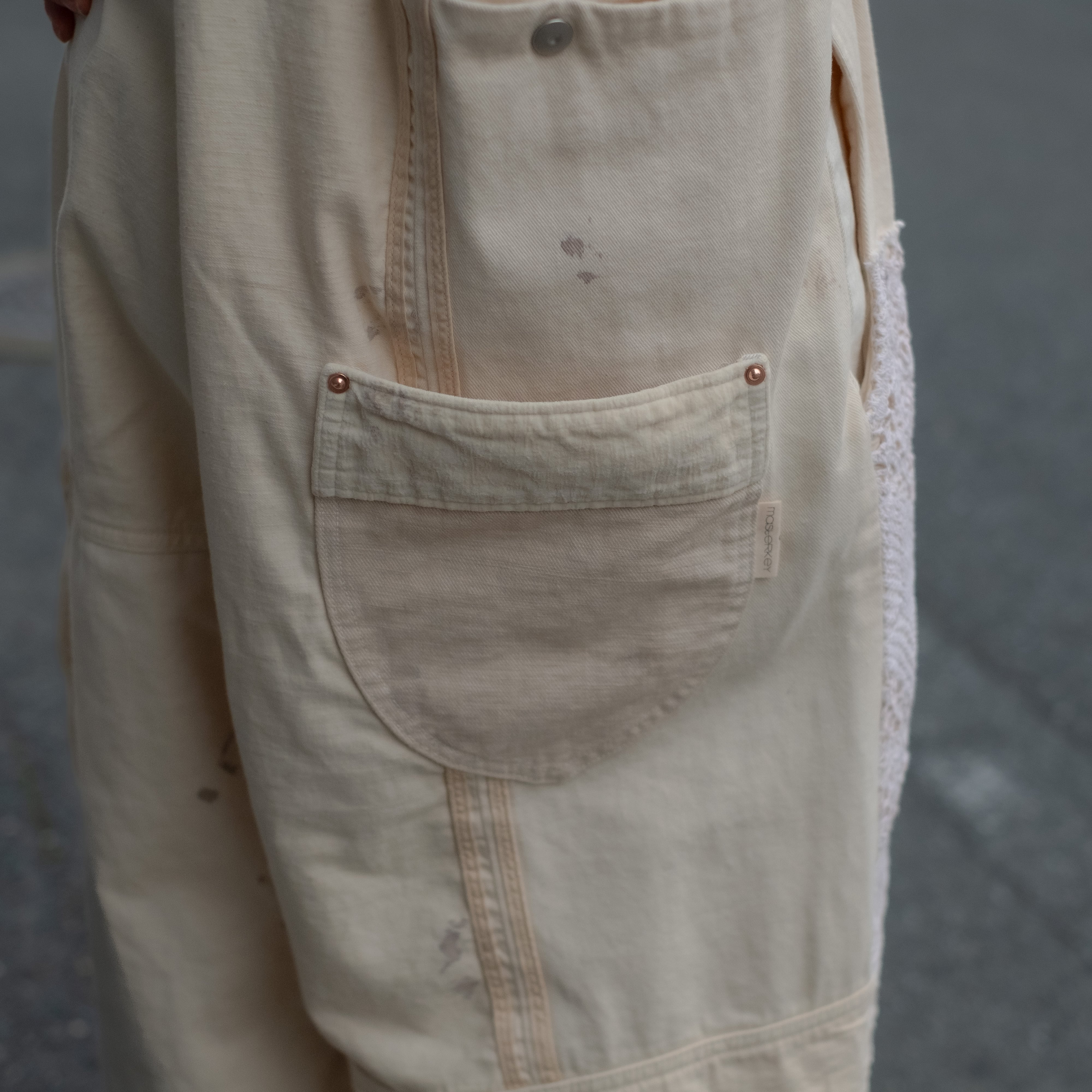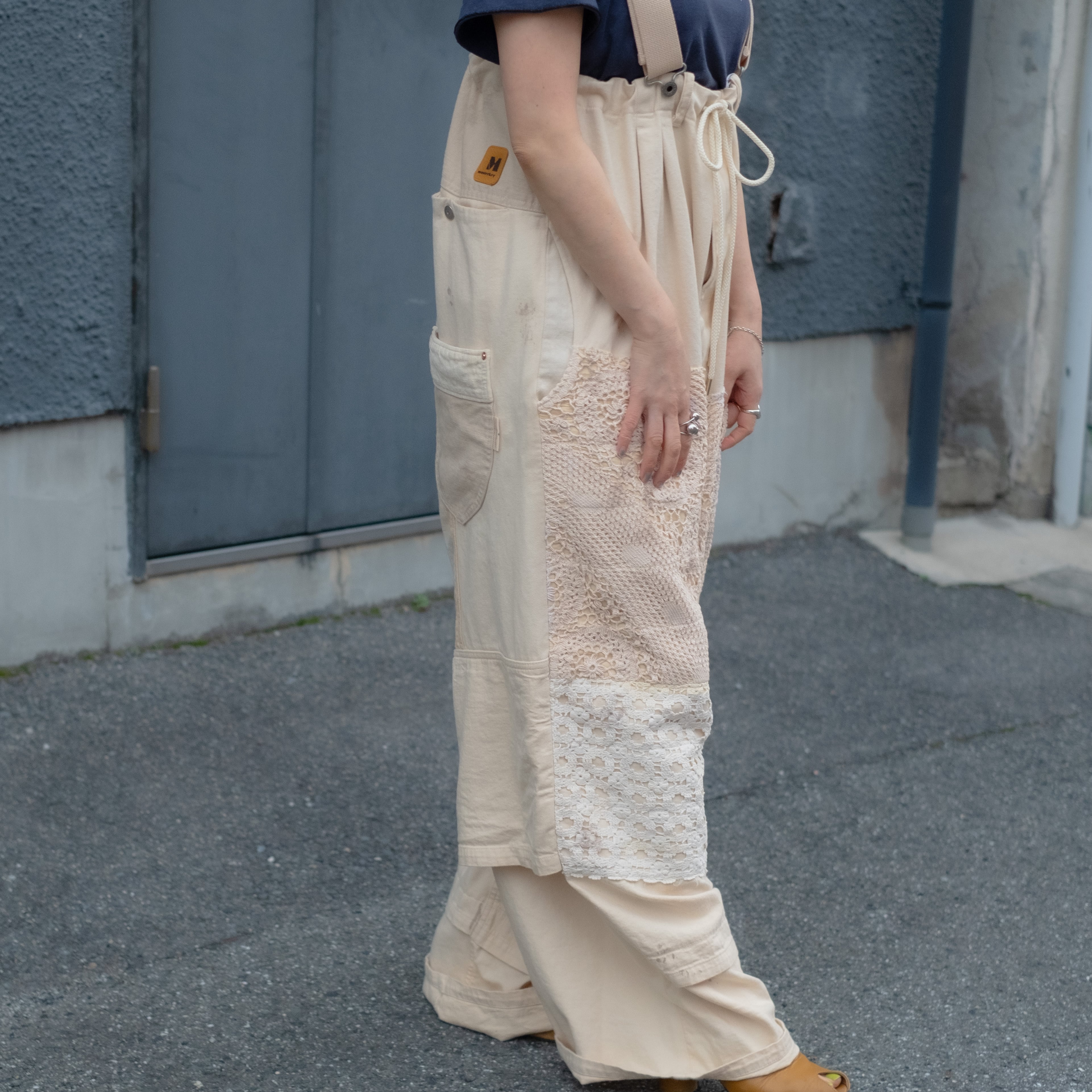 4種類の異なる生成り素材をミックスしたサロペットパンツ。