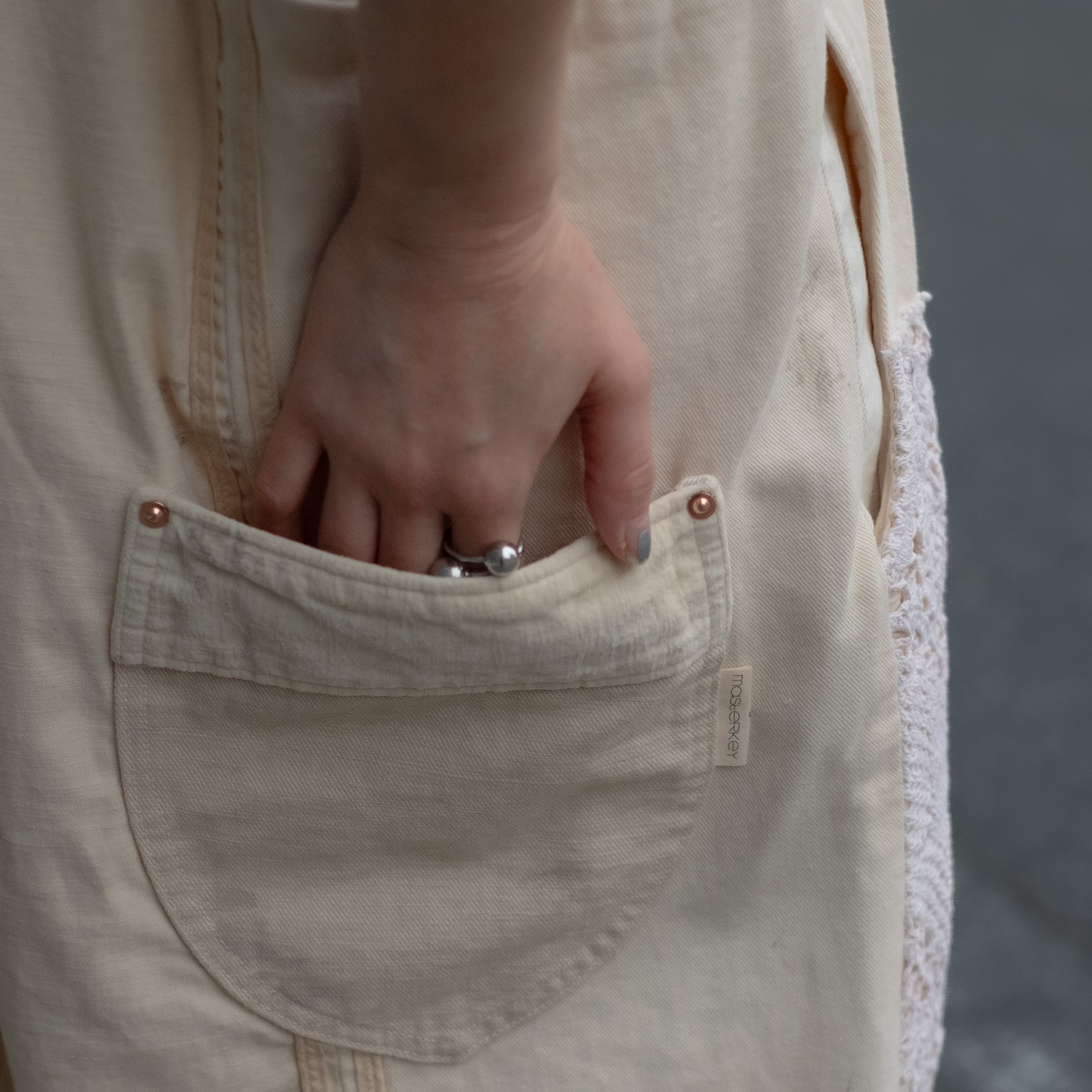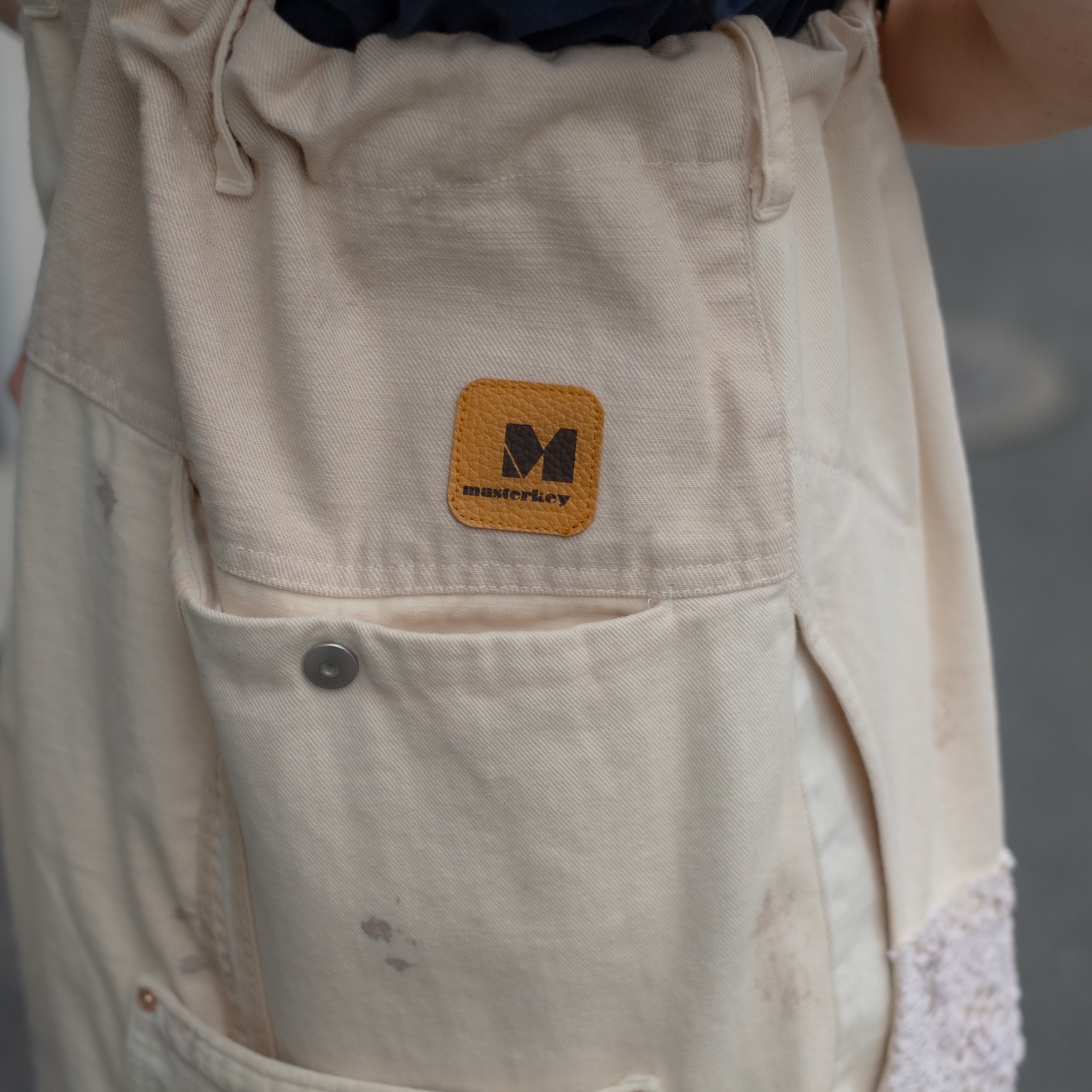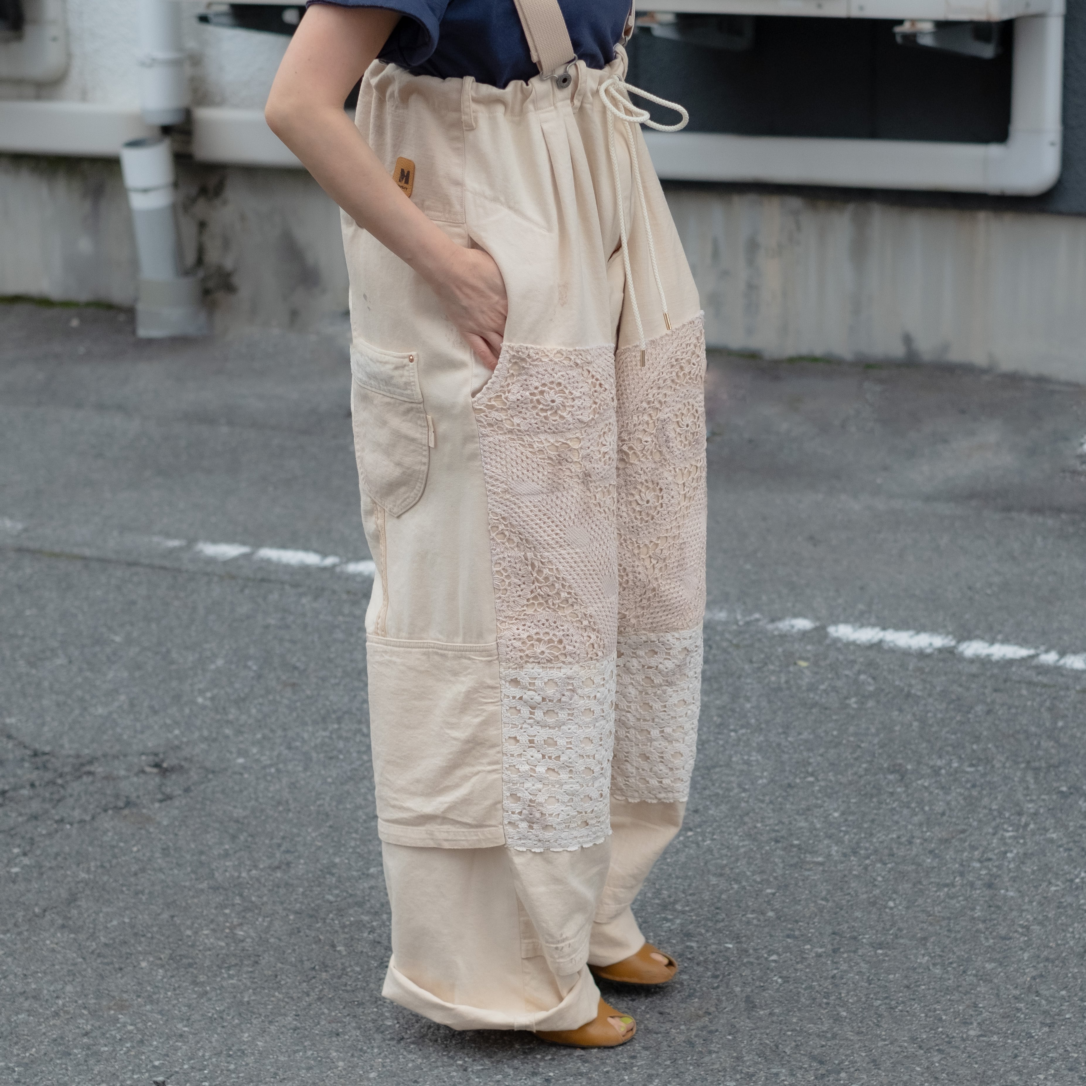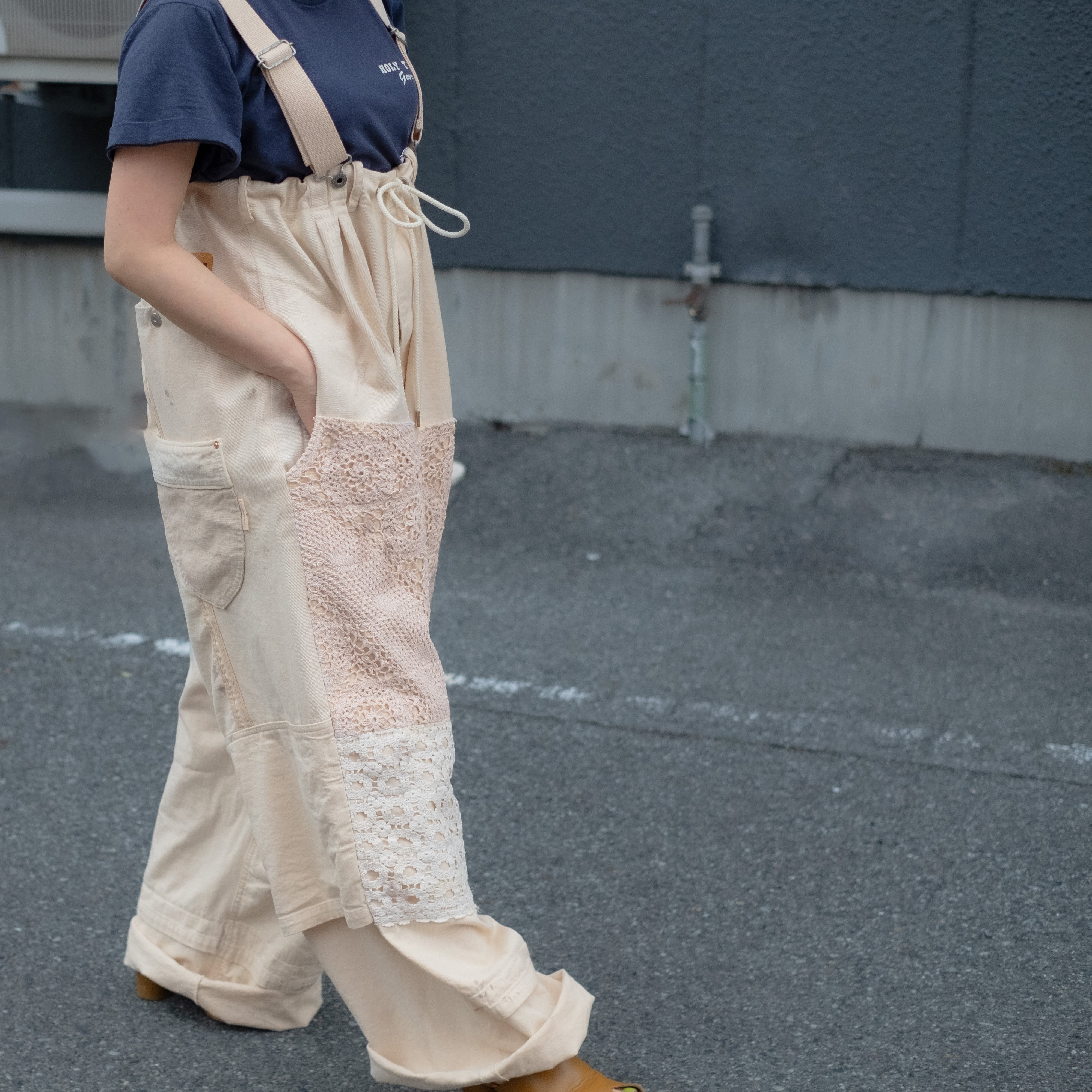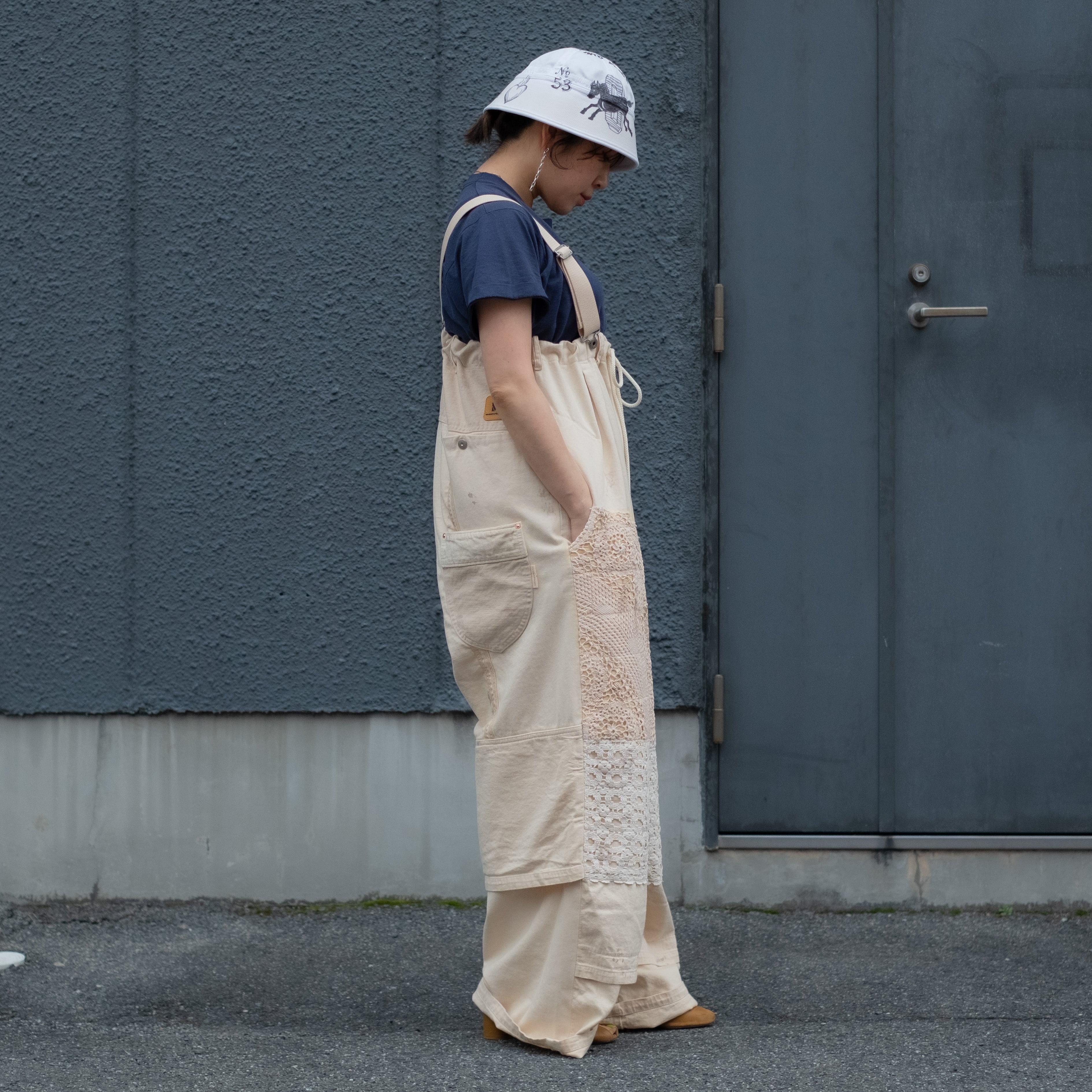 4種類の異なる生成り素材をミックスしたサロペットパンツ。