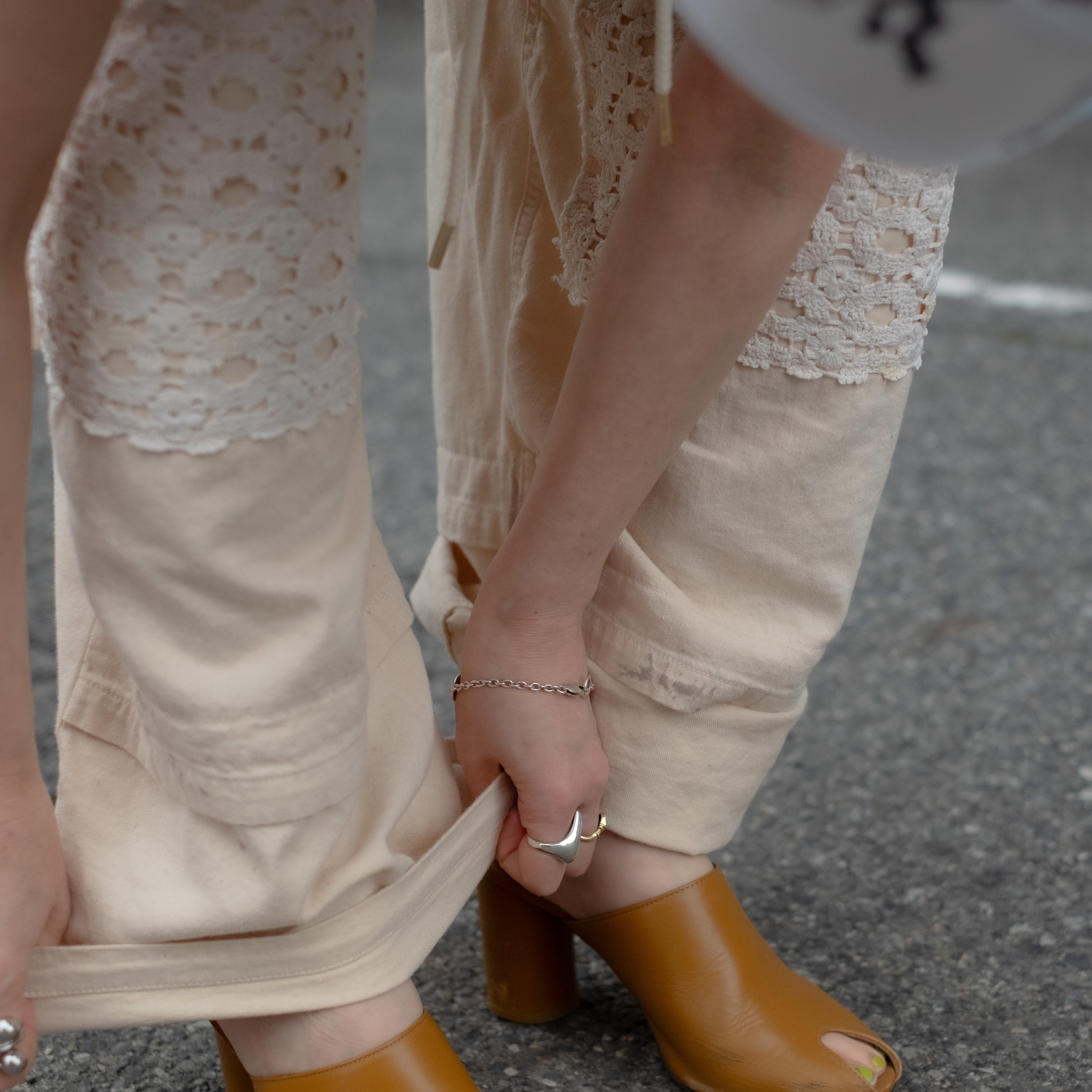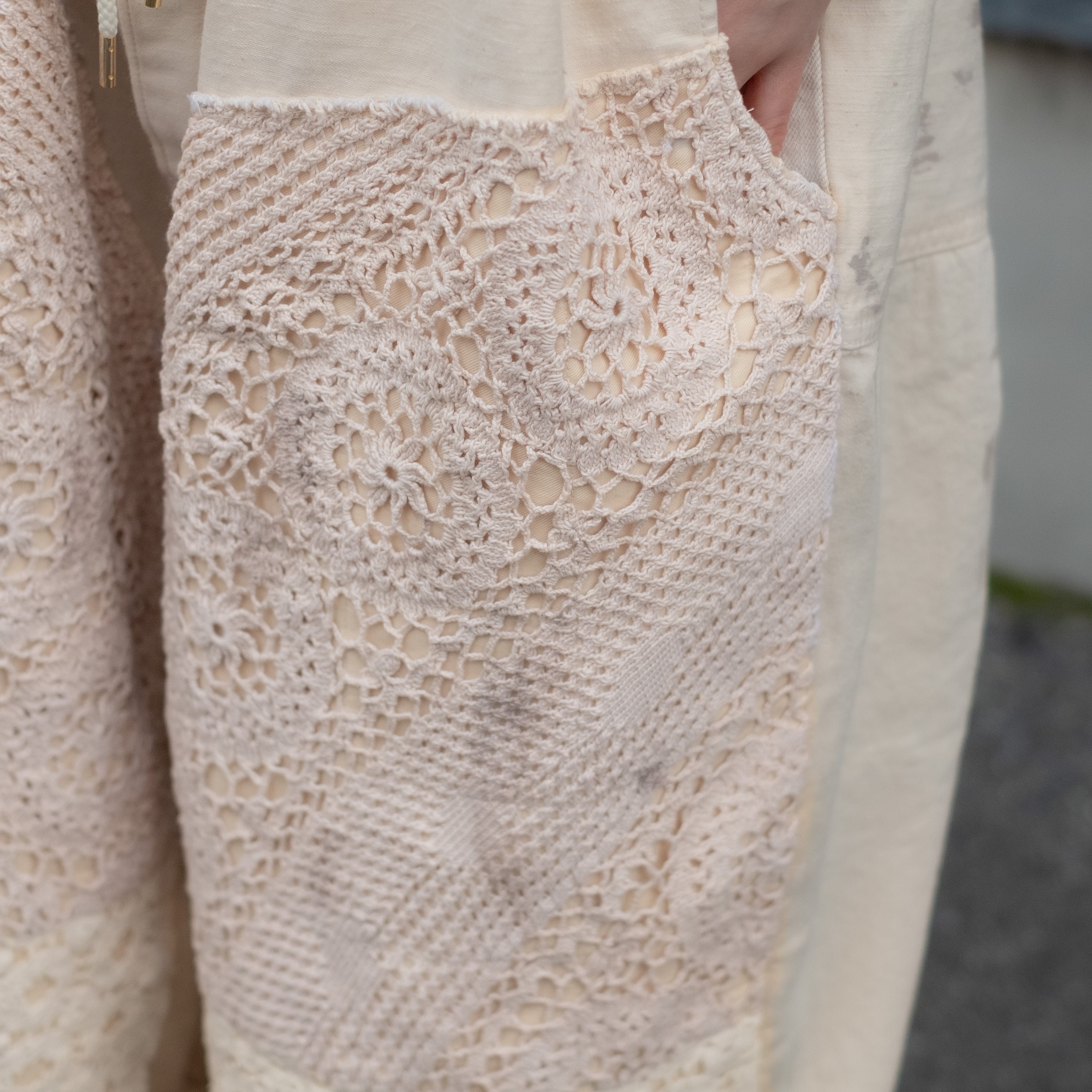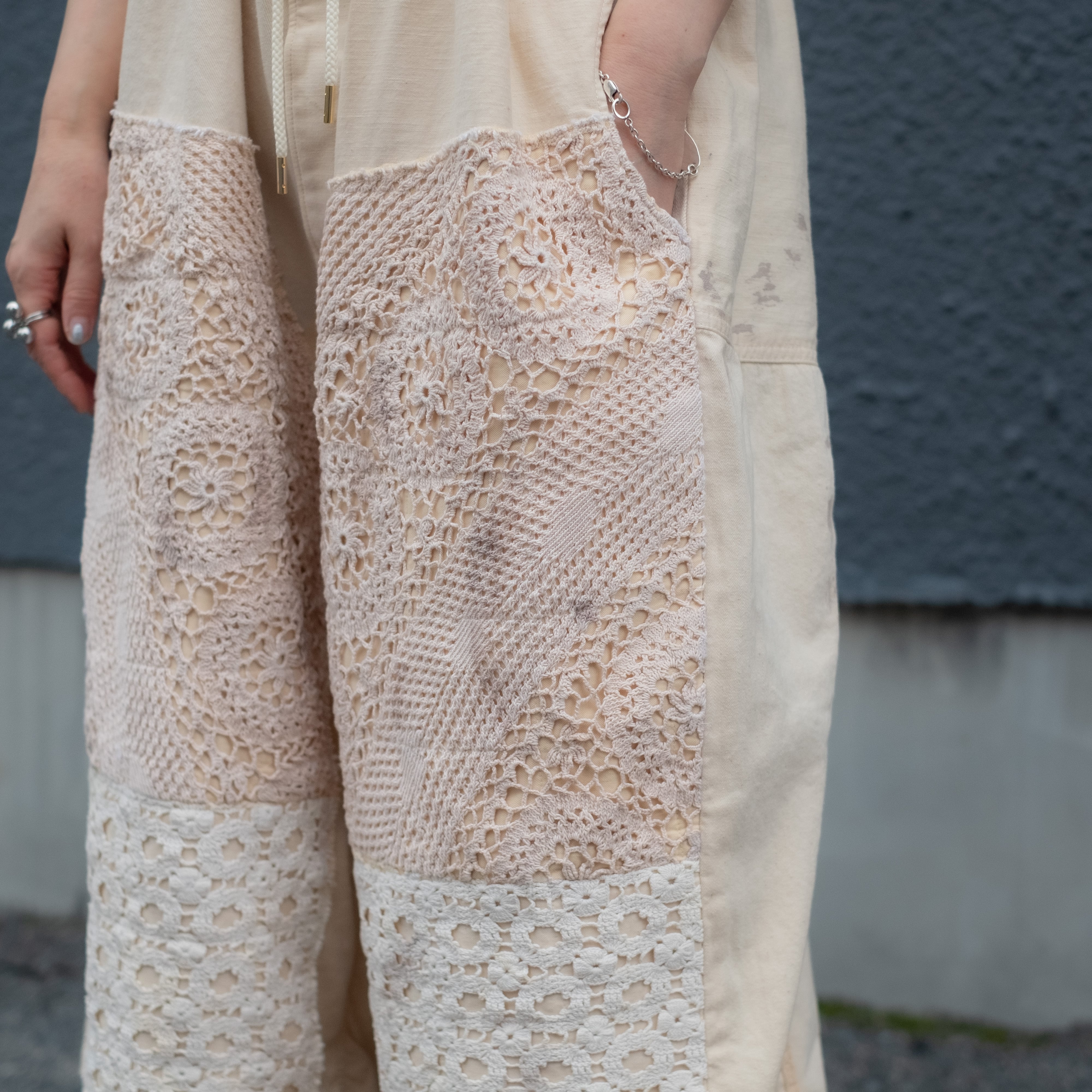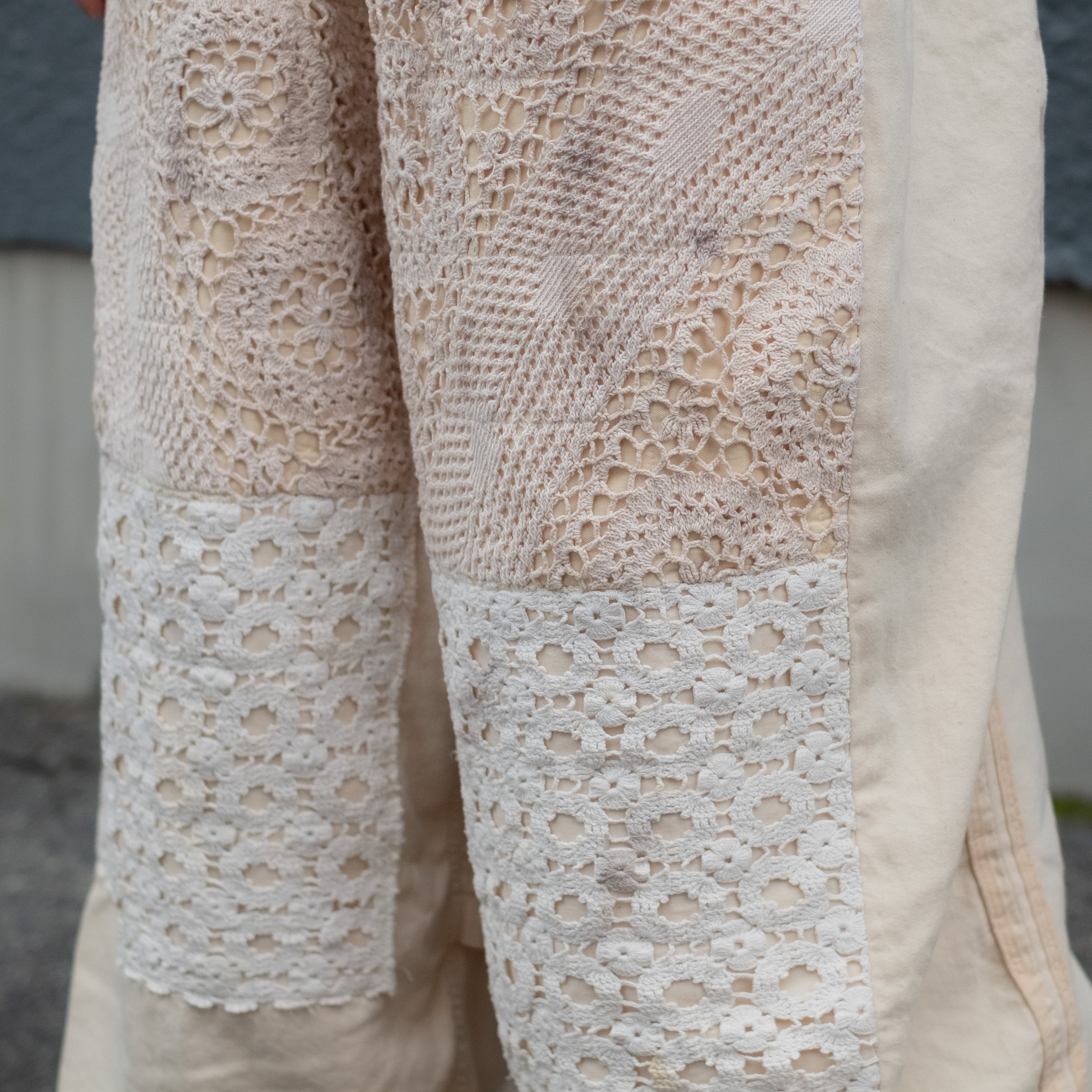 年代の古いレースを配した迫力あるダブルニーデザインが着こなしのアクセントに。