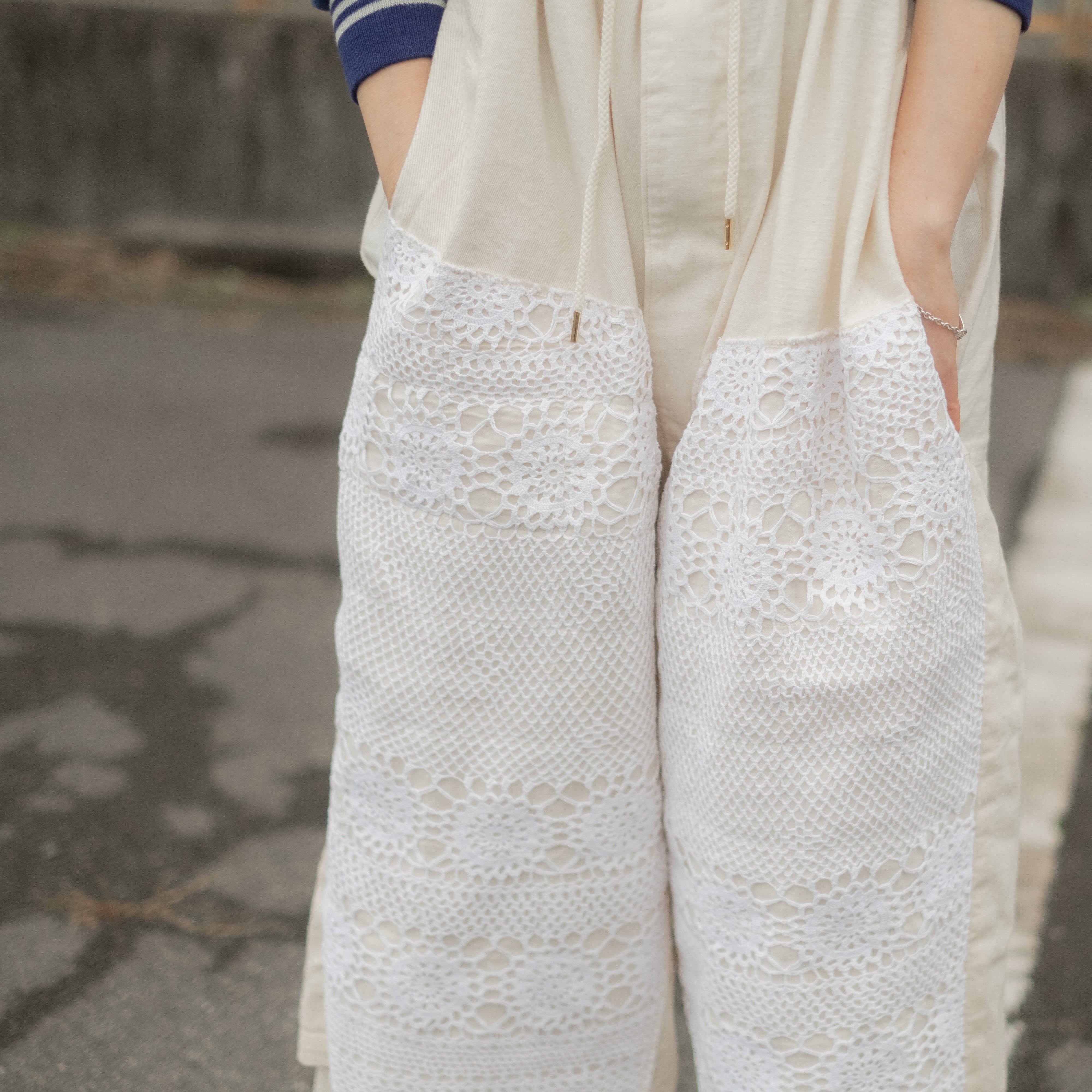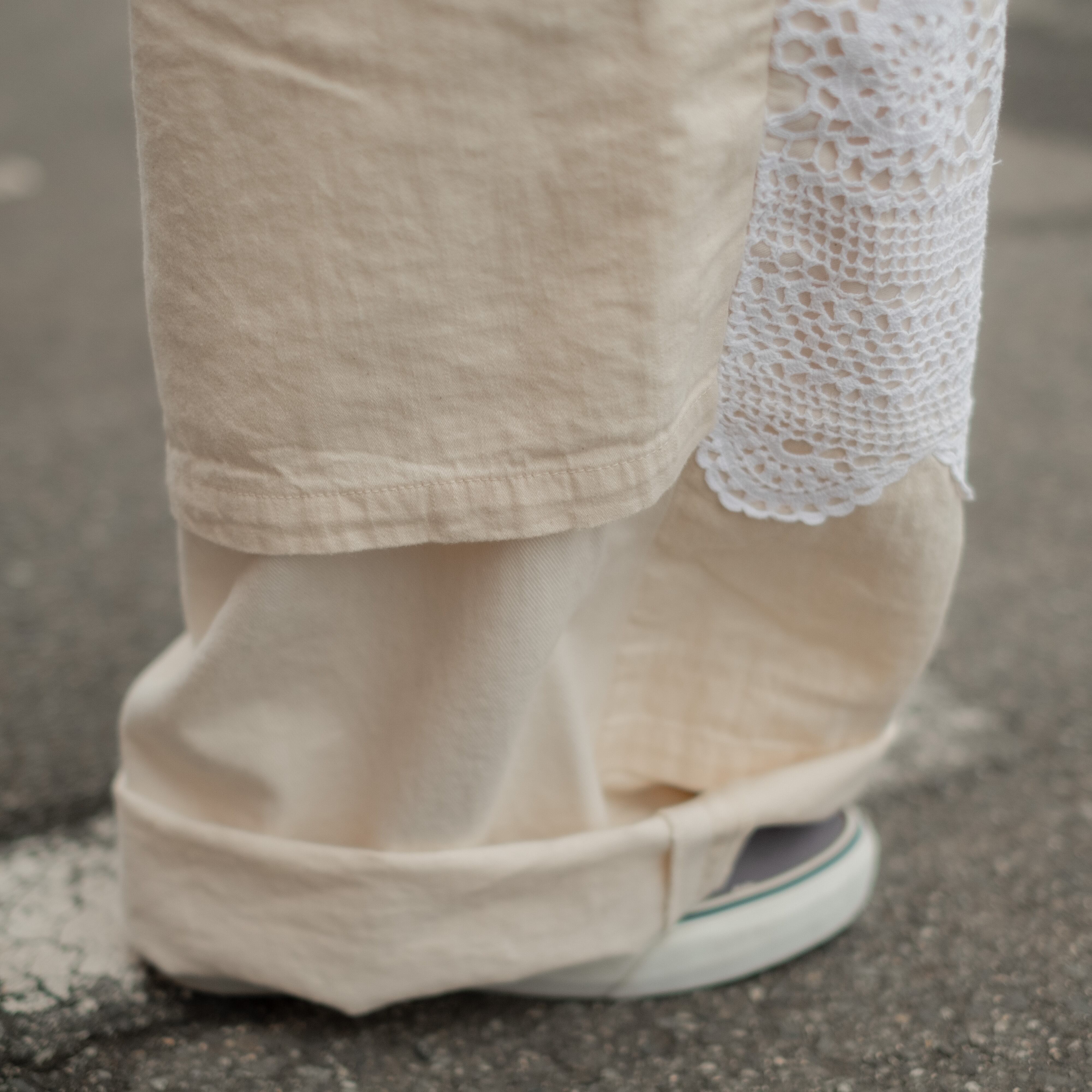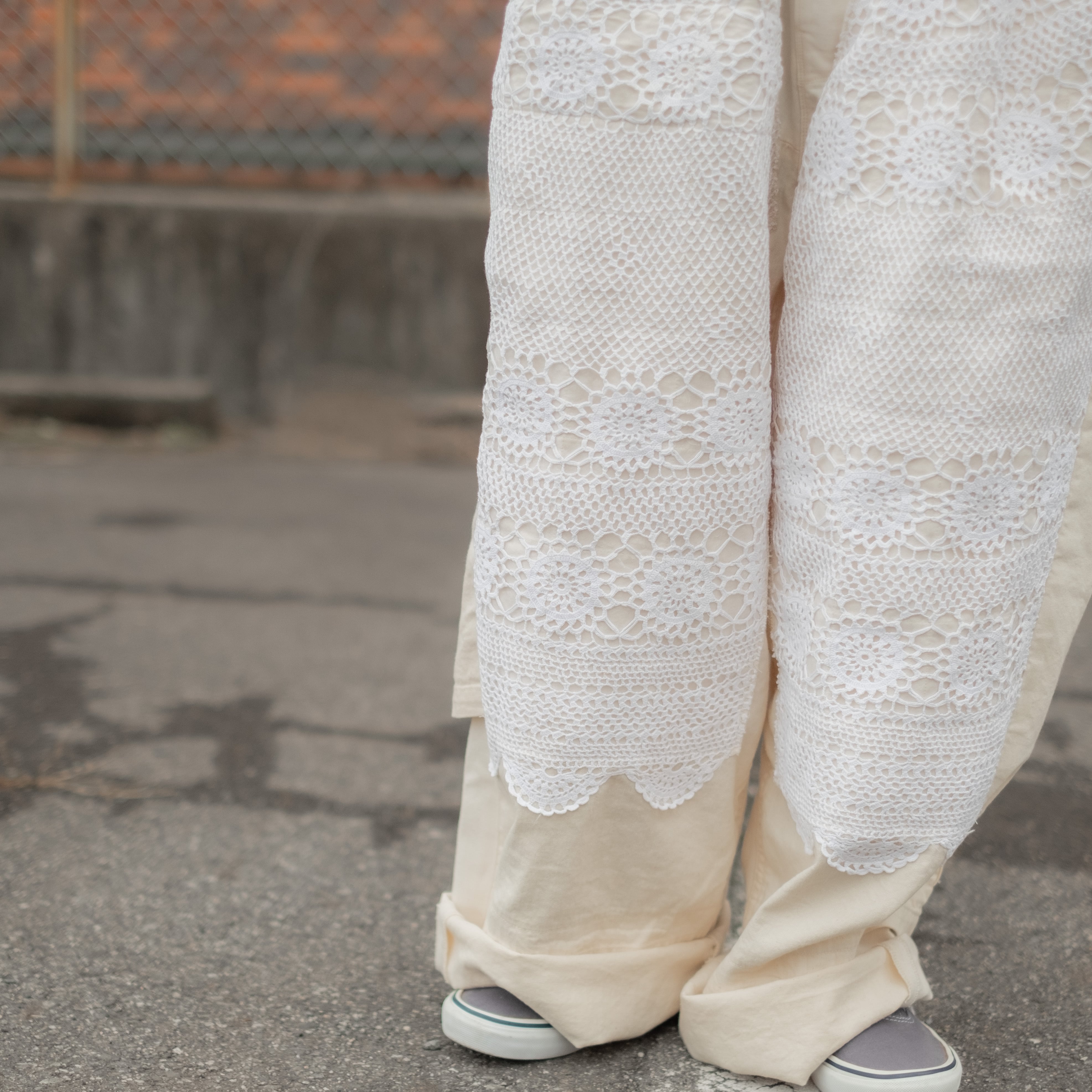 デザインの大きな特徴はフロント膝(ダブルニー部分)にビンテージレースを使用する事で無骨でワークなイメージでは無く、POPで柔らかい中性的な雰囲気に仕上がっています。