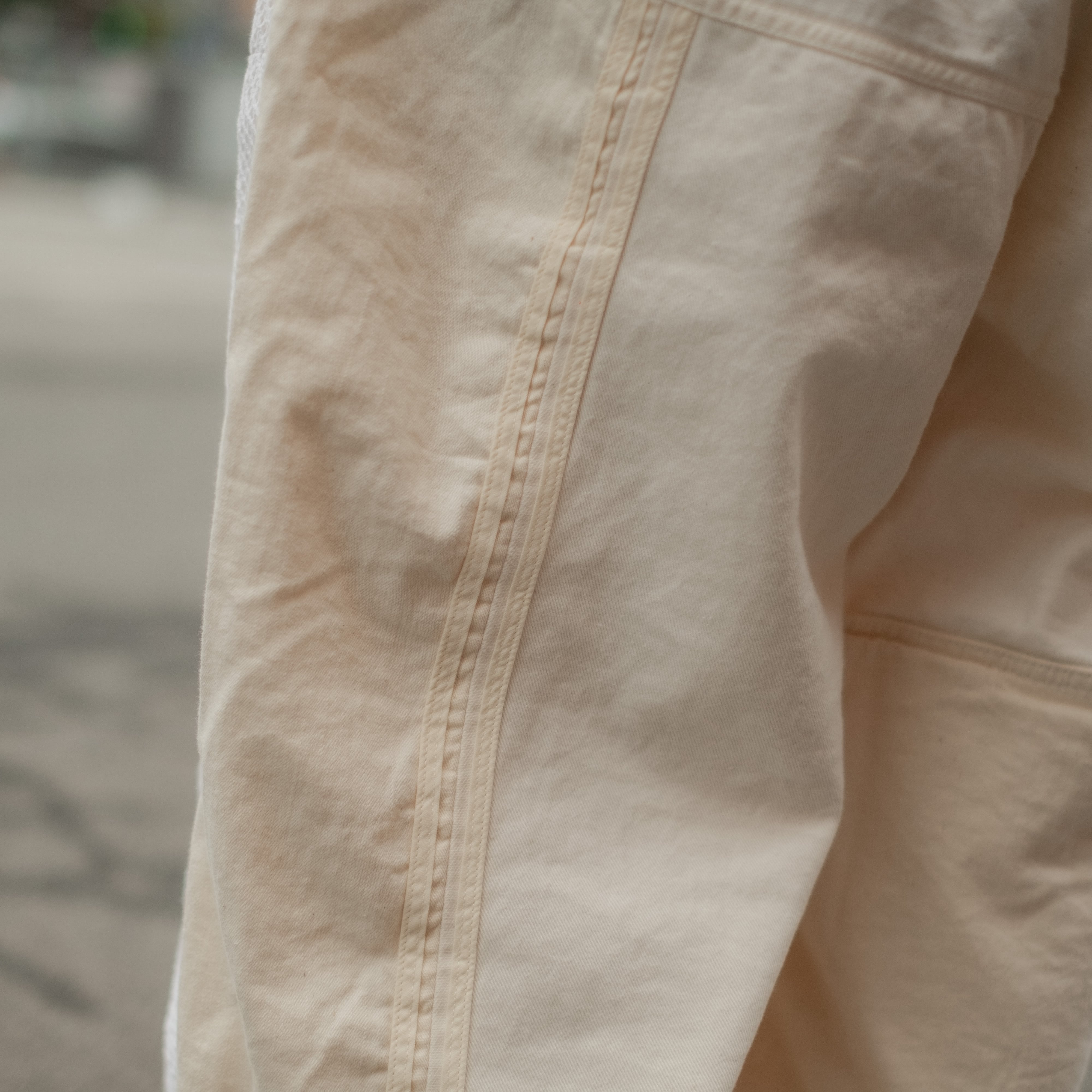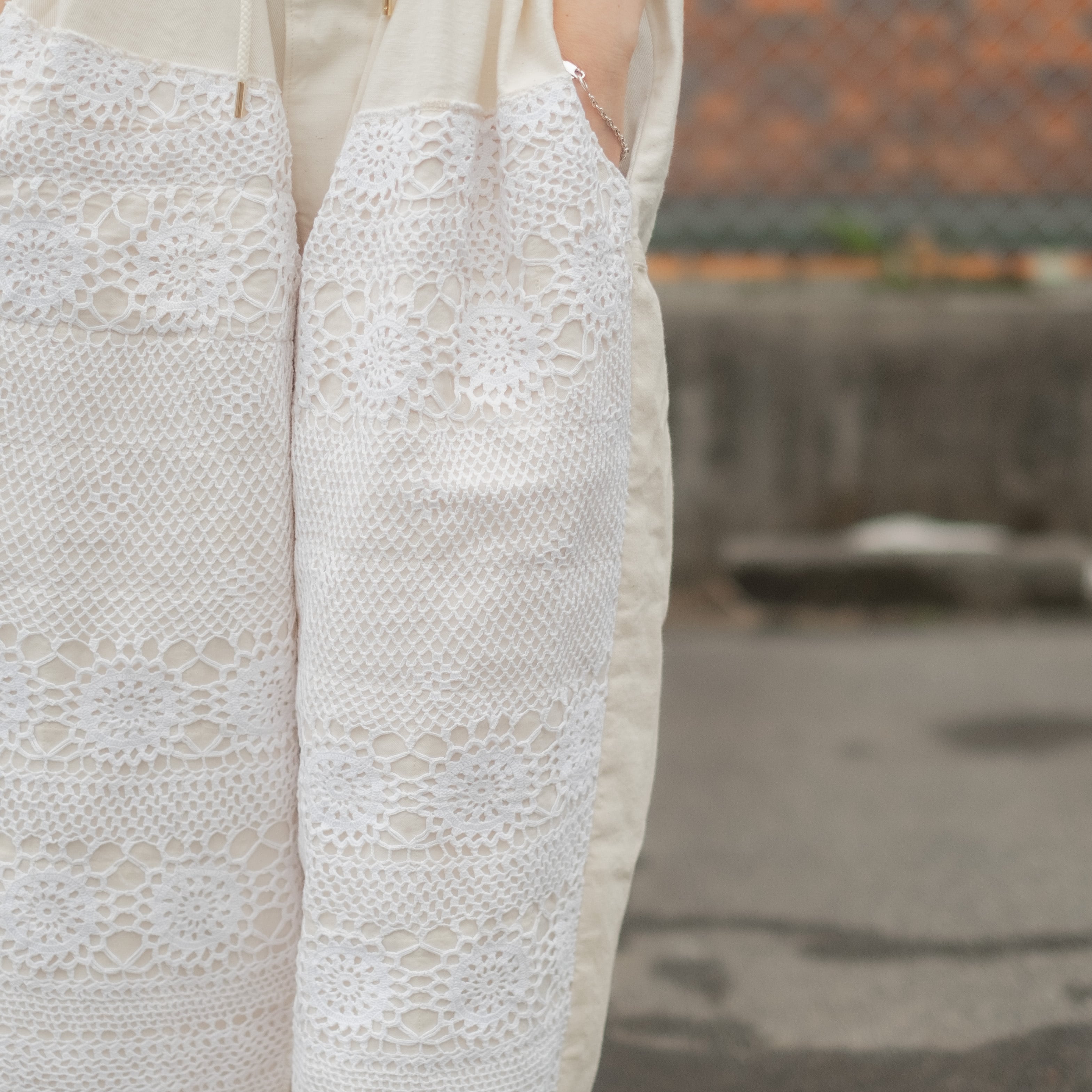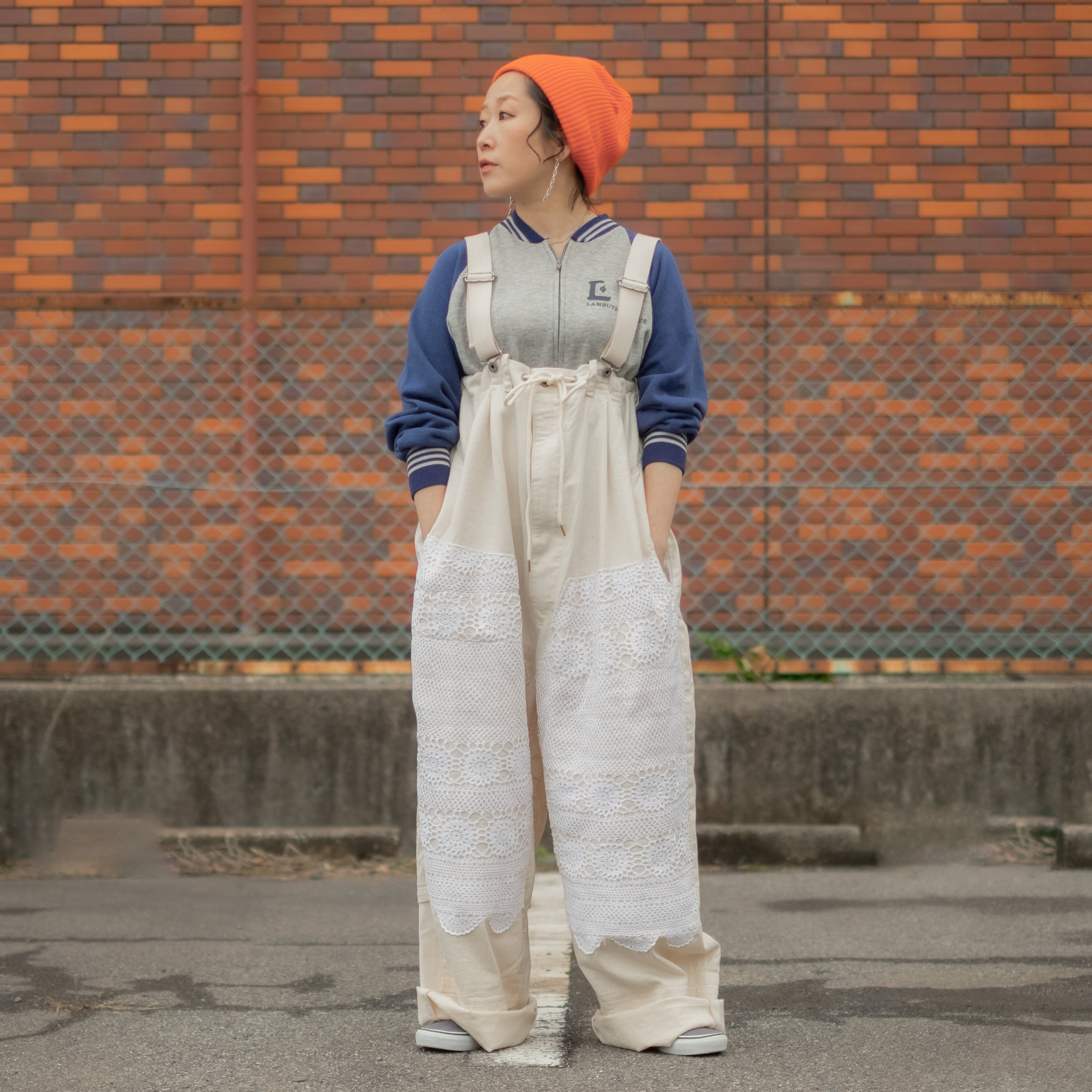 デザインの大きな特徴はフロント膝(ダブルニー部分)にビンテージレースを使用する事で無骨でワークなイメージでは無く、POPで柔らかい中性的な雰囲気に仕上がっています。