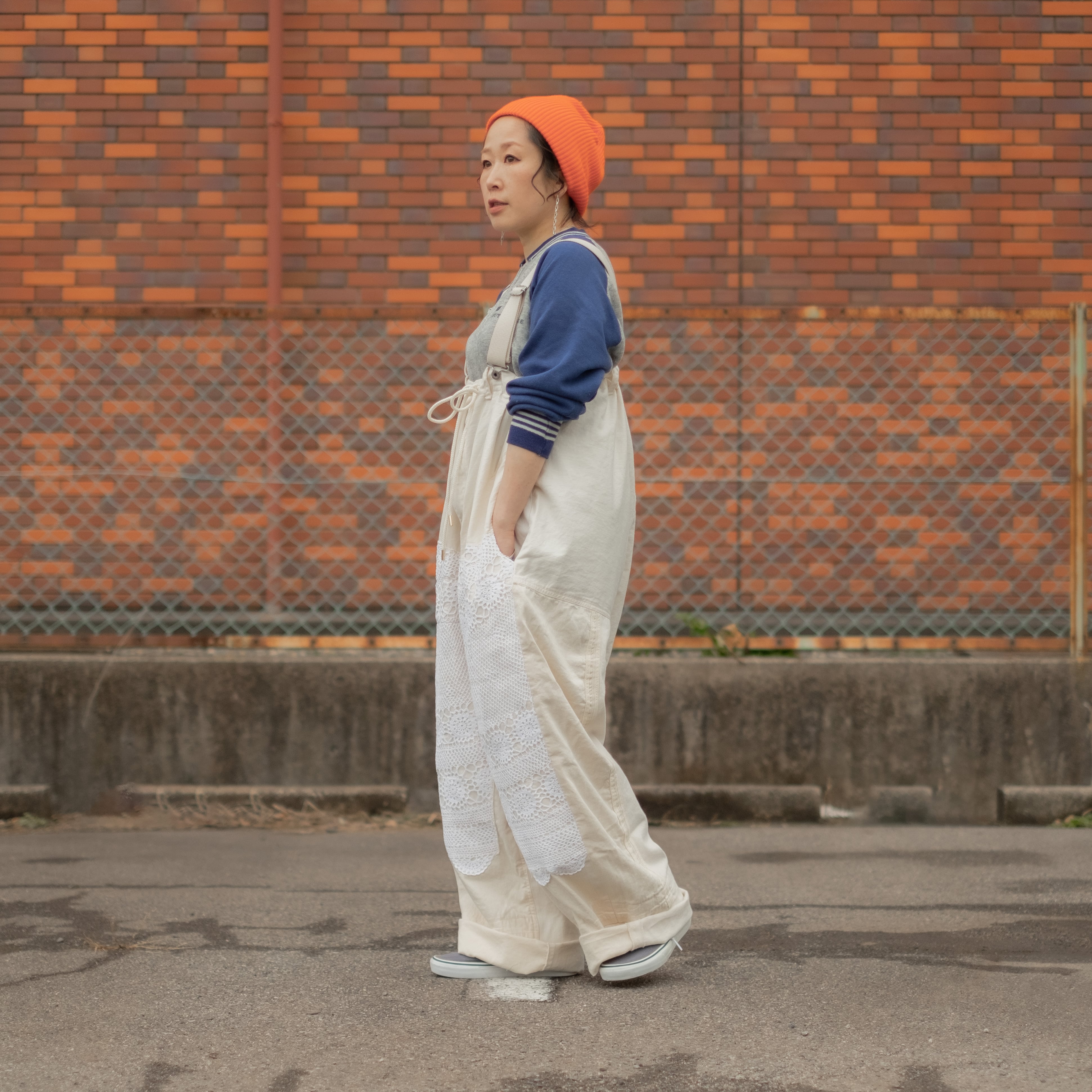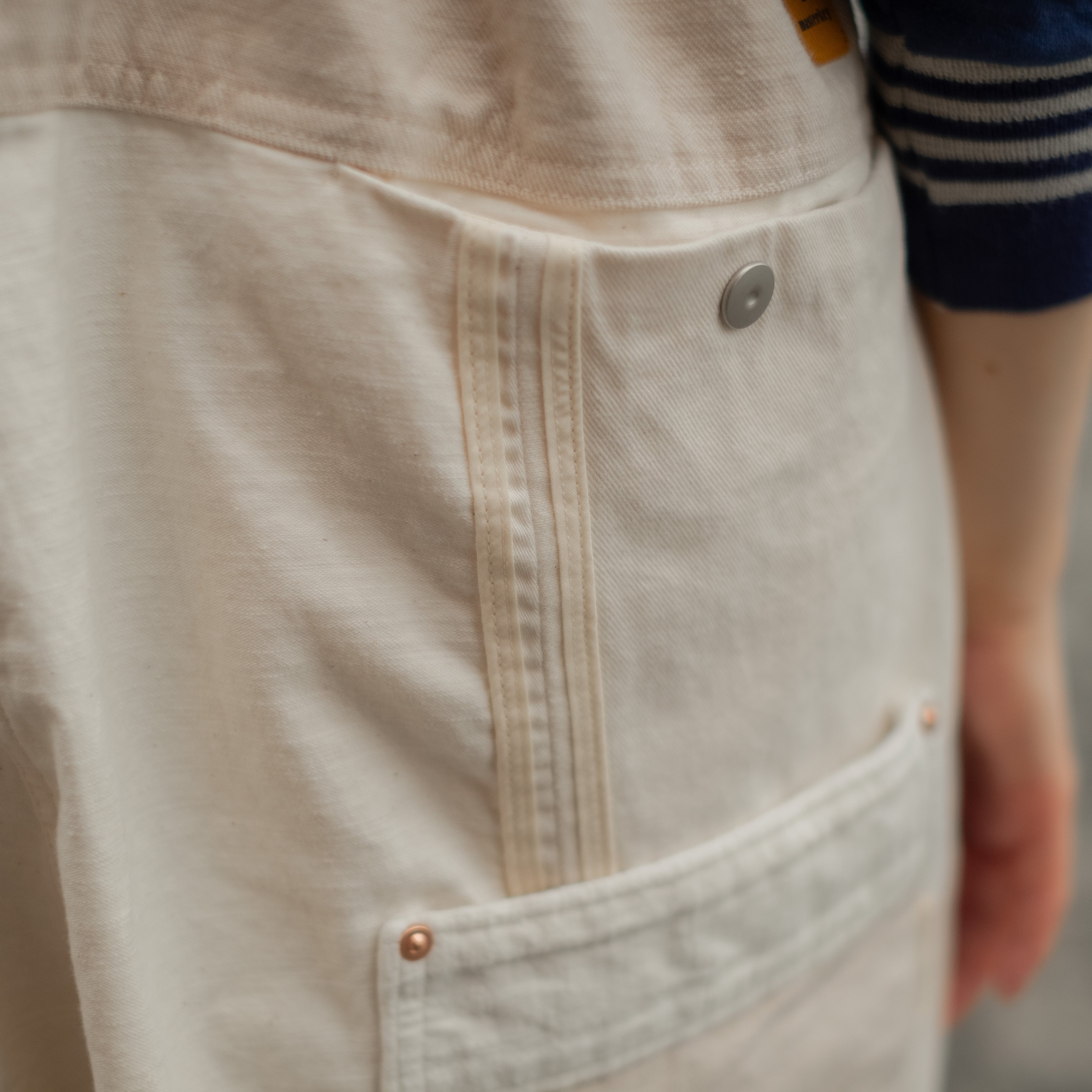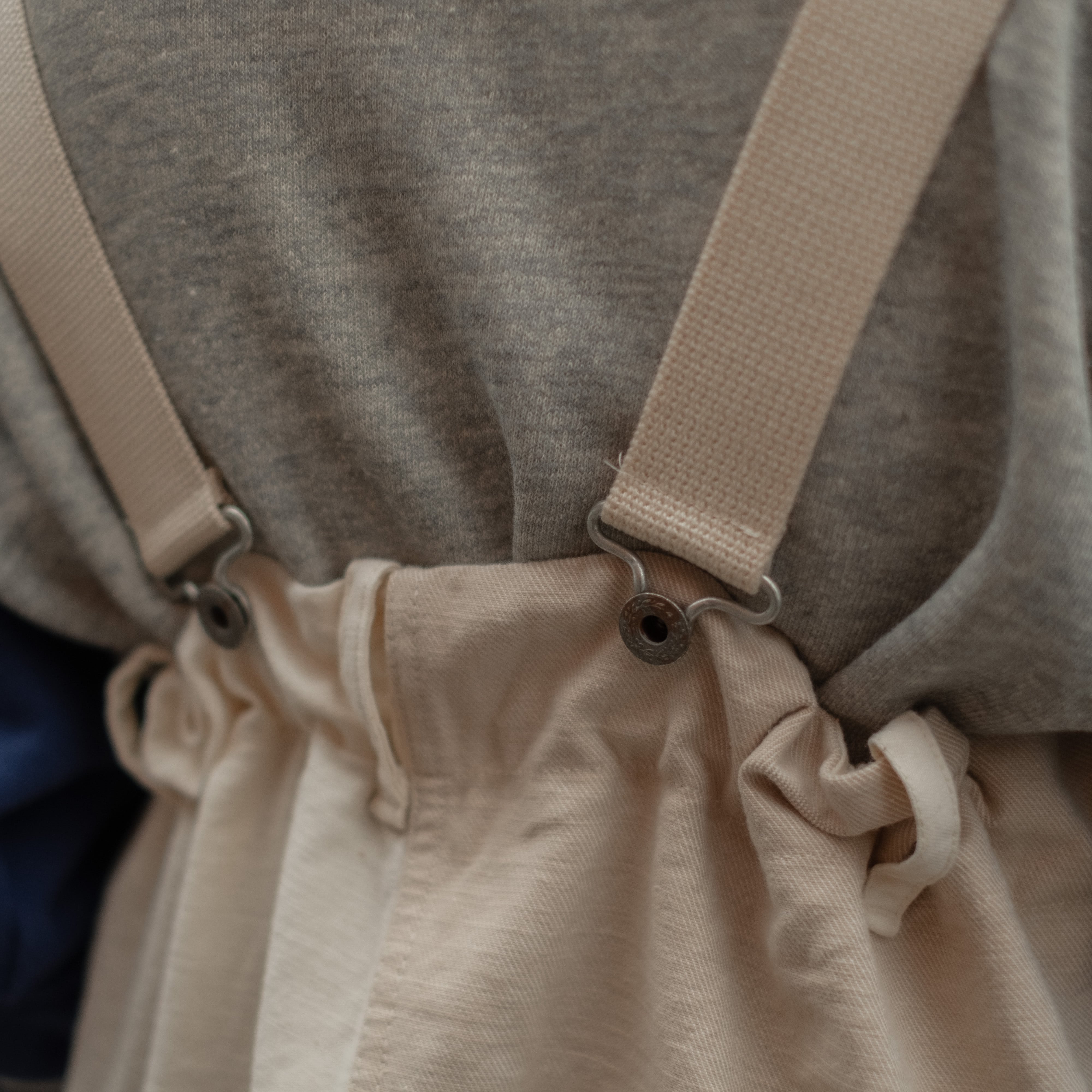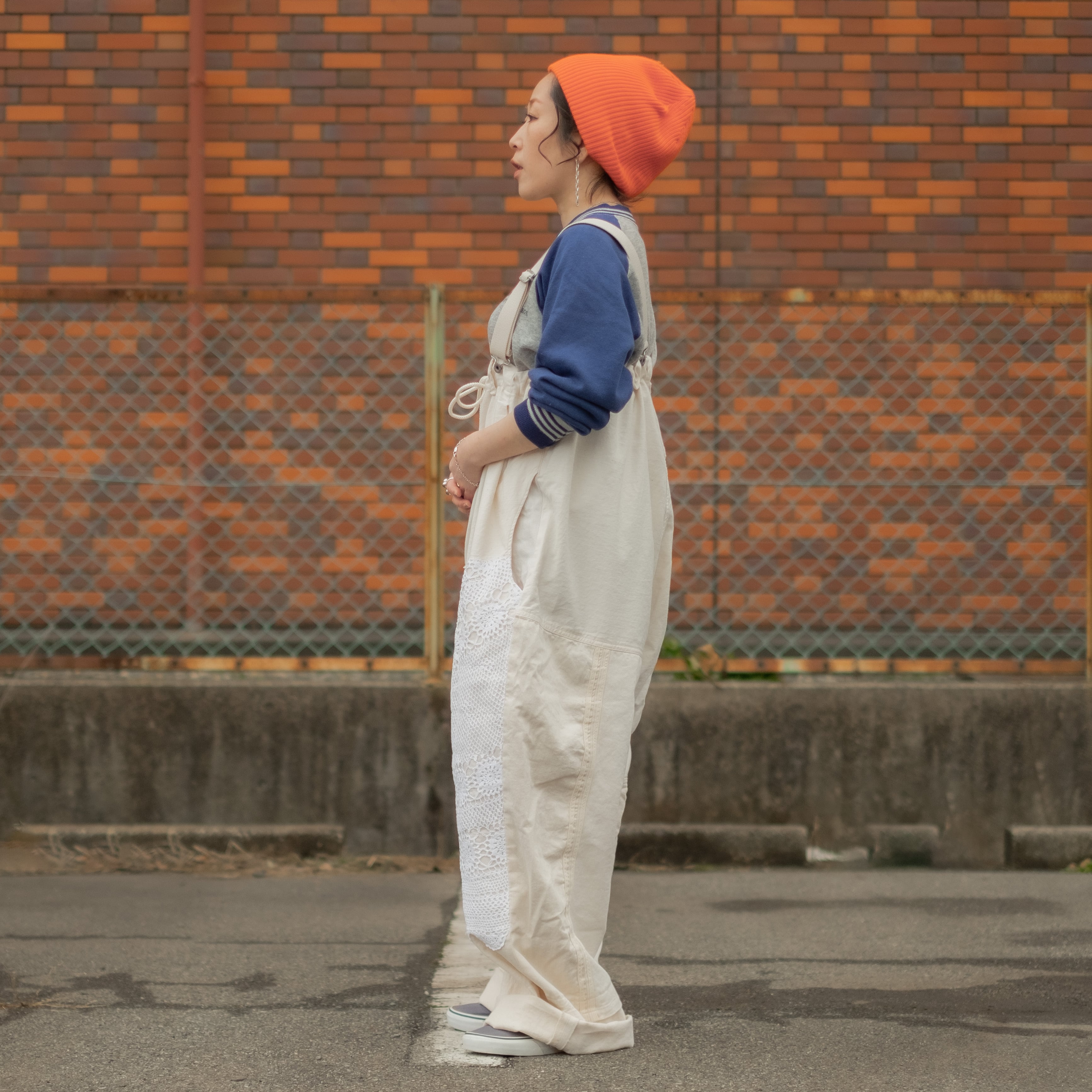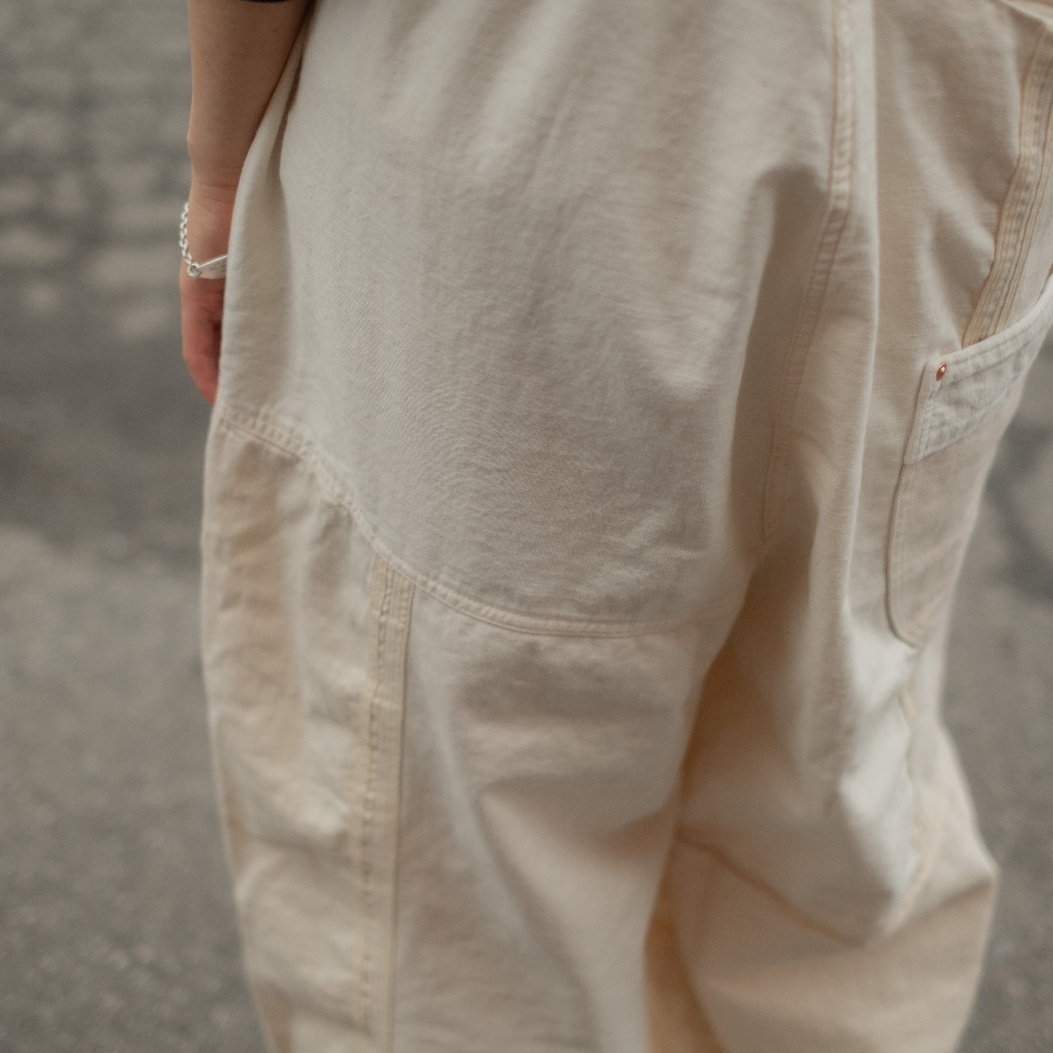 4種類の生成り素材をミックスして制作したサロペットパンツ。