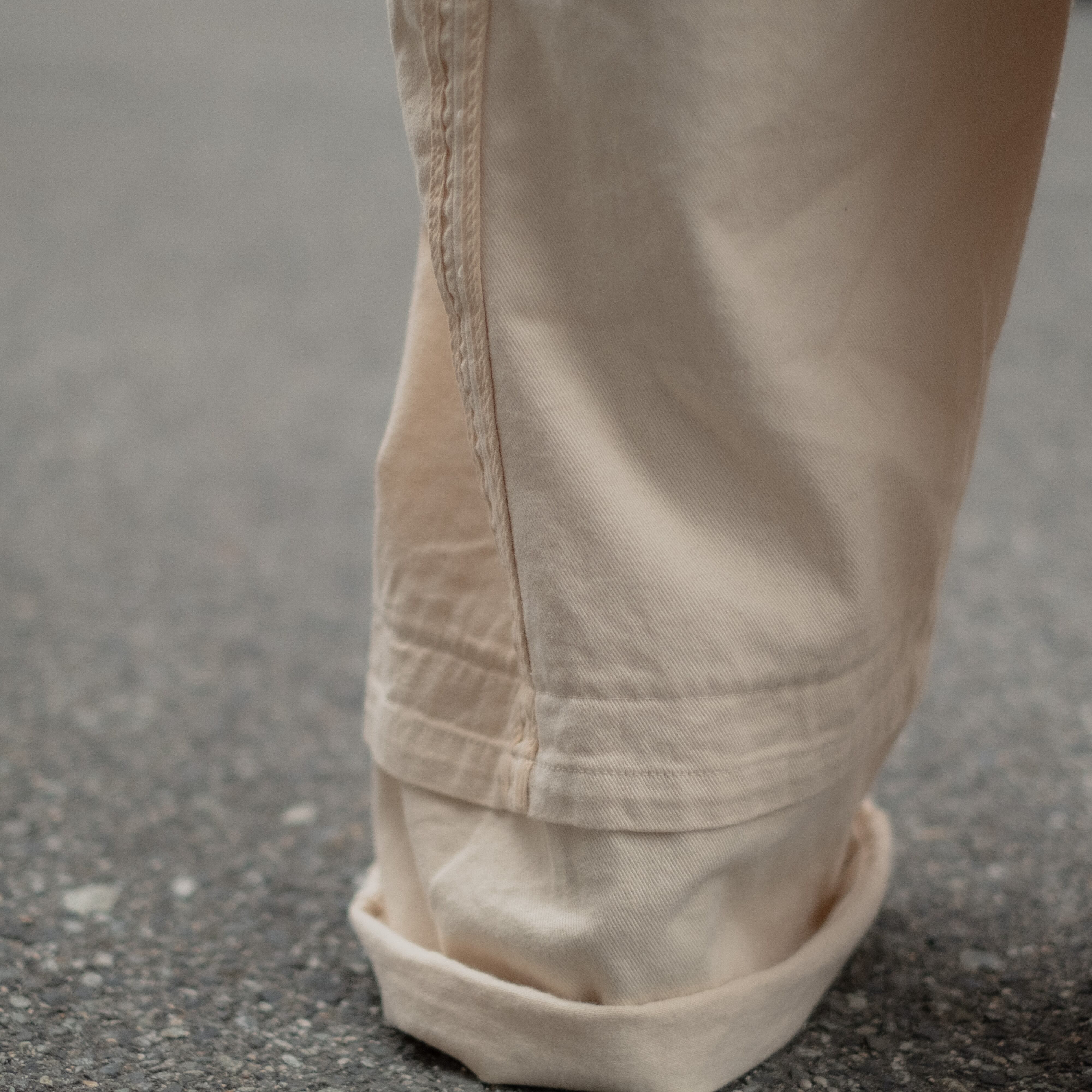 また、岡山県の児島にて製品後に改めて薄くベージュ色に染め、特殊な汚し加工+エイジング加工を施しています。