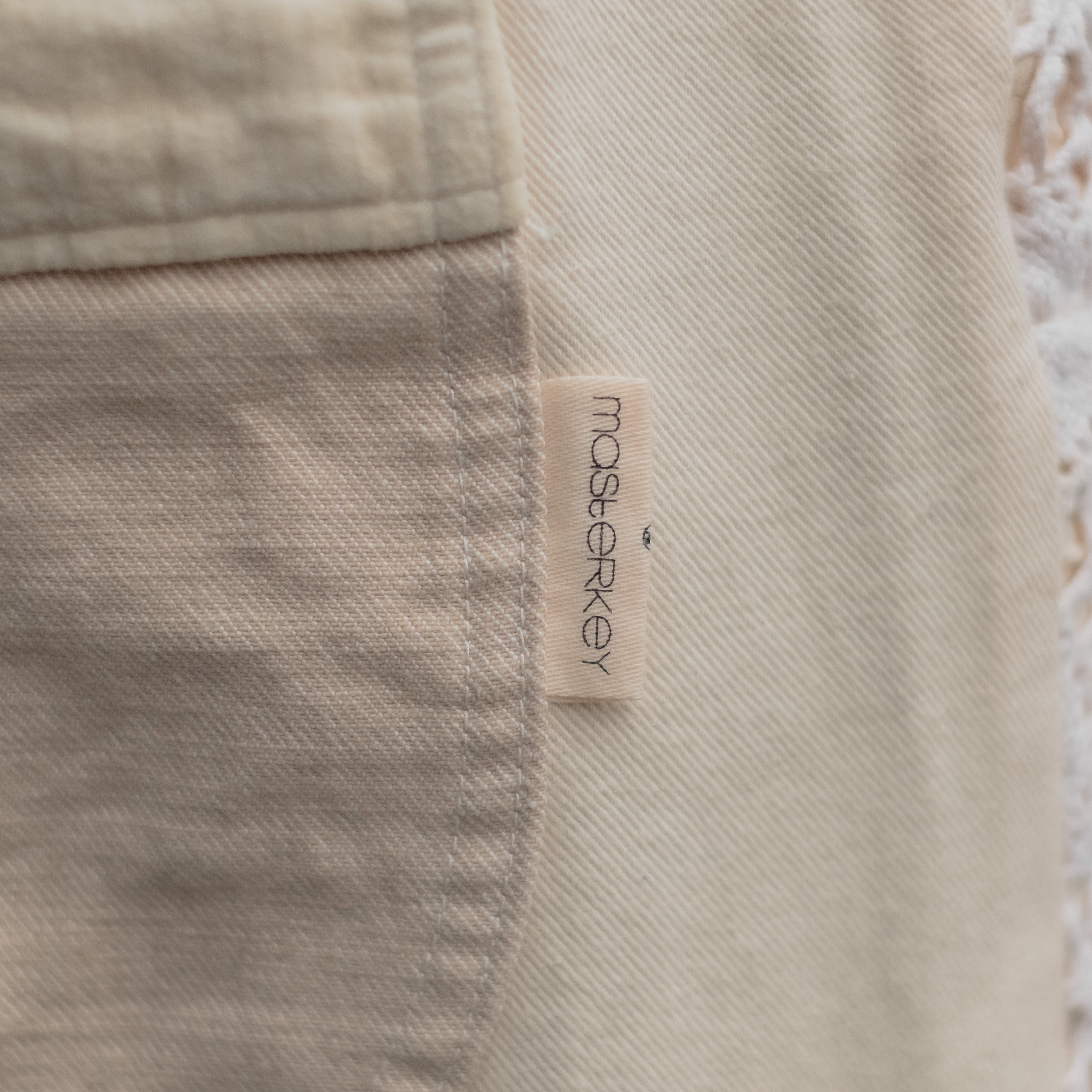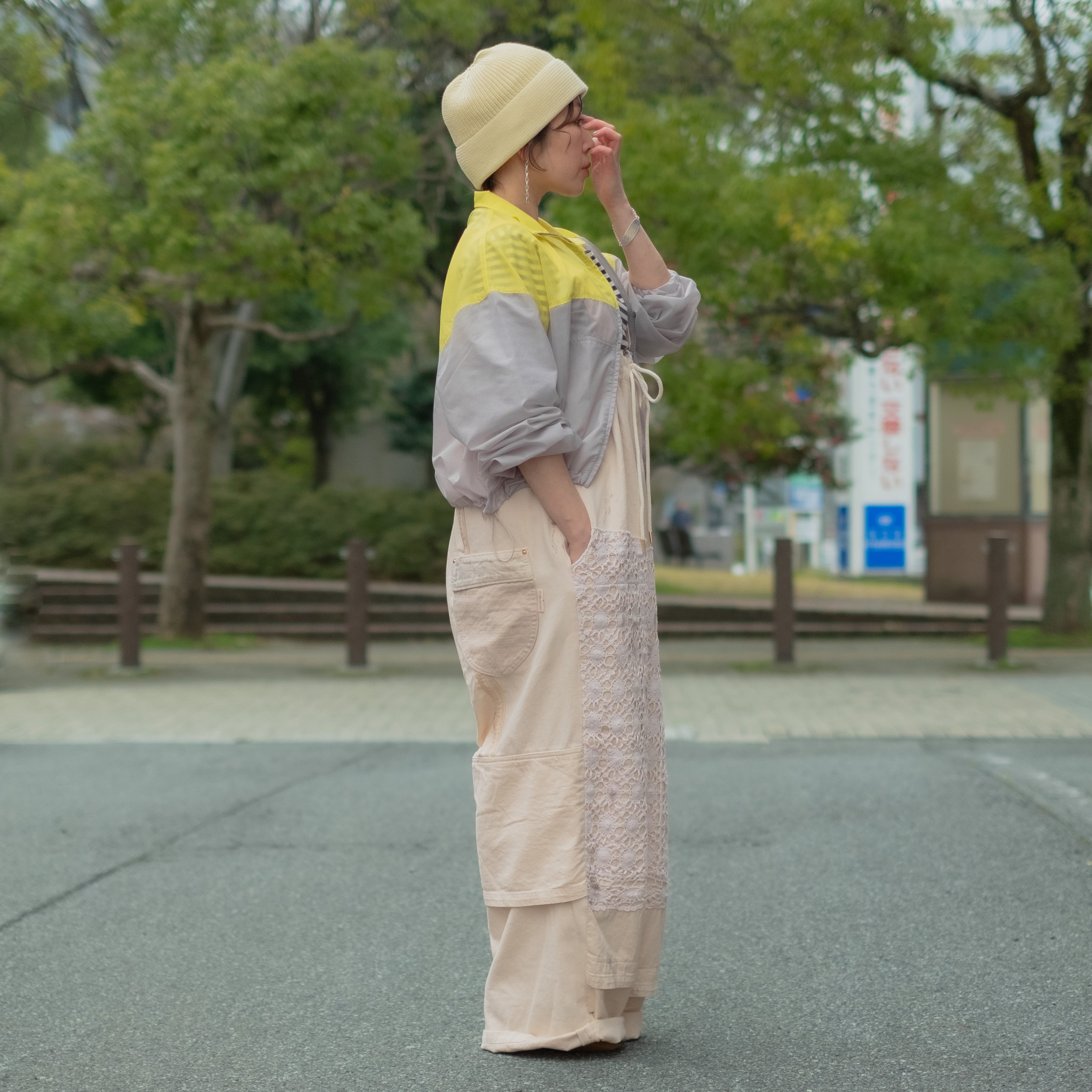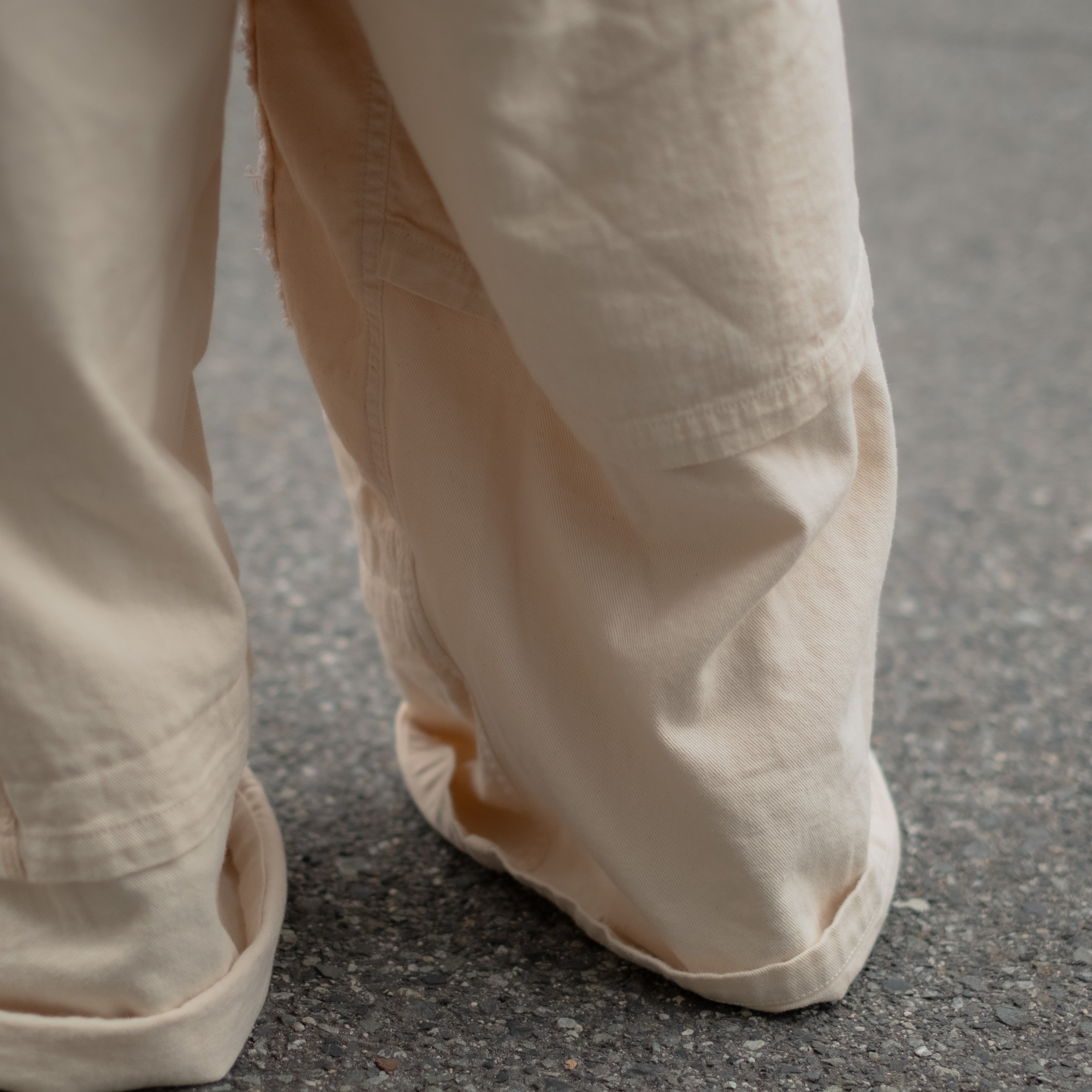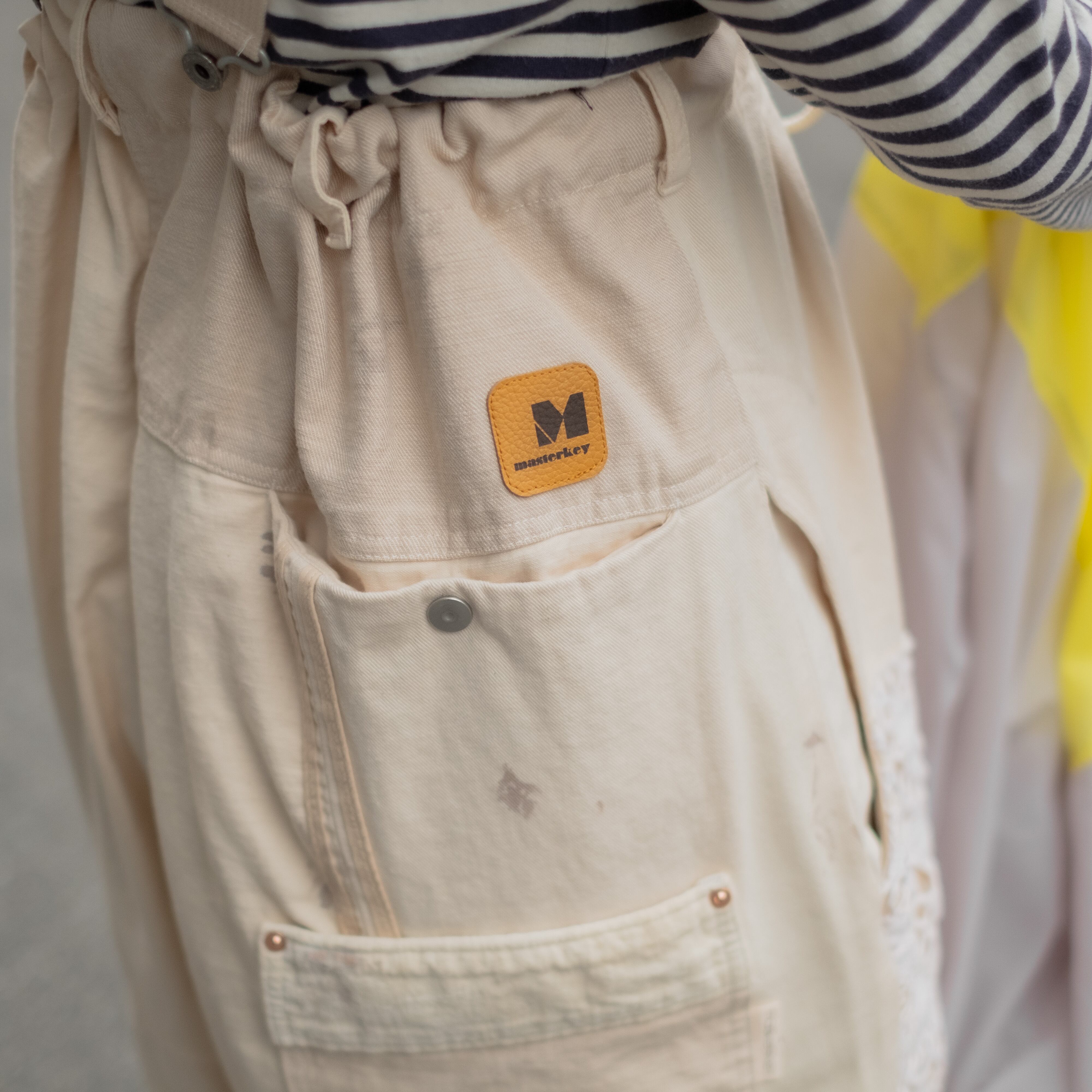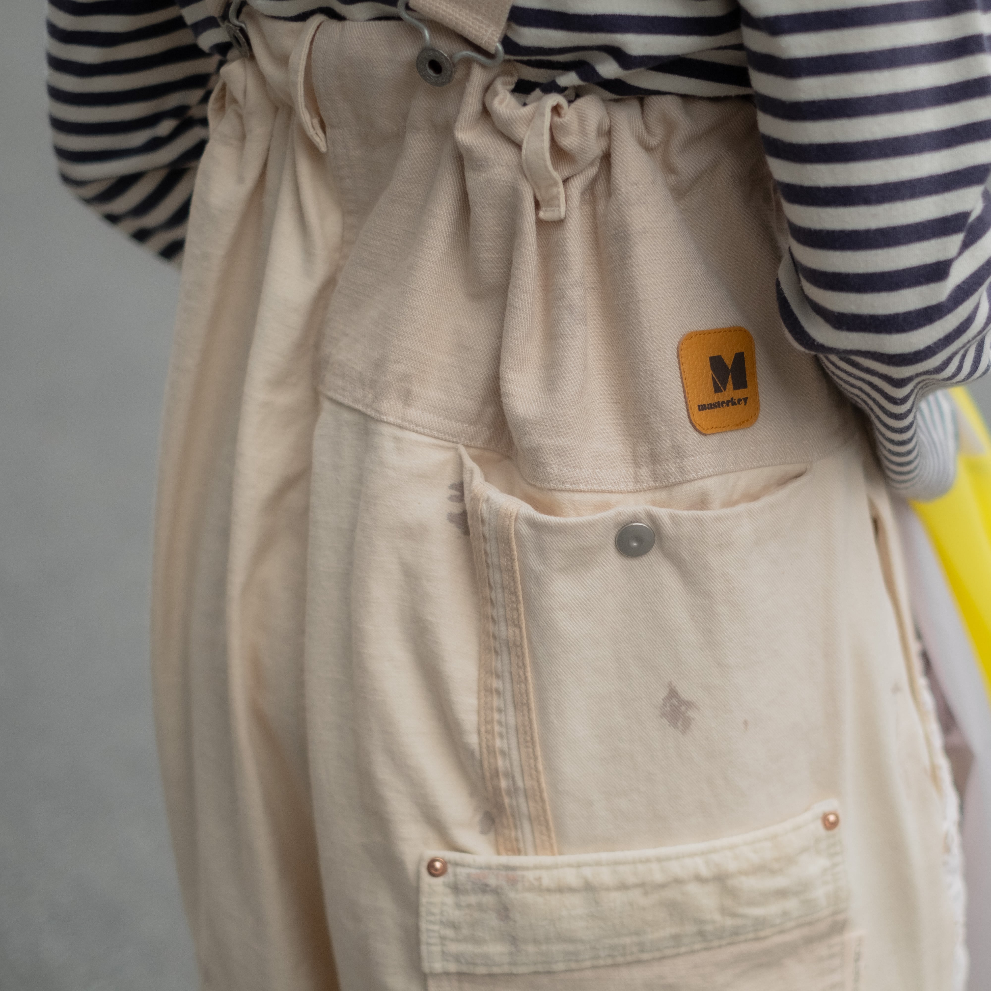 4種類の異なる生成り素材をミックスしたサロペットパンツ。