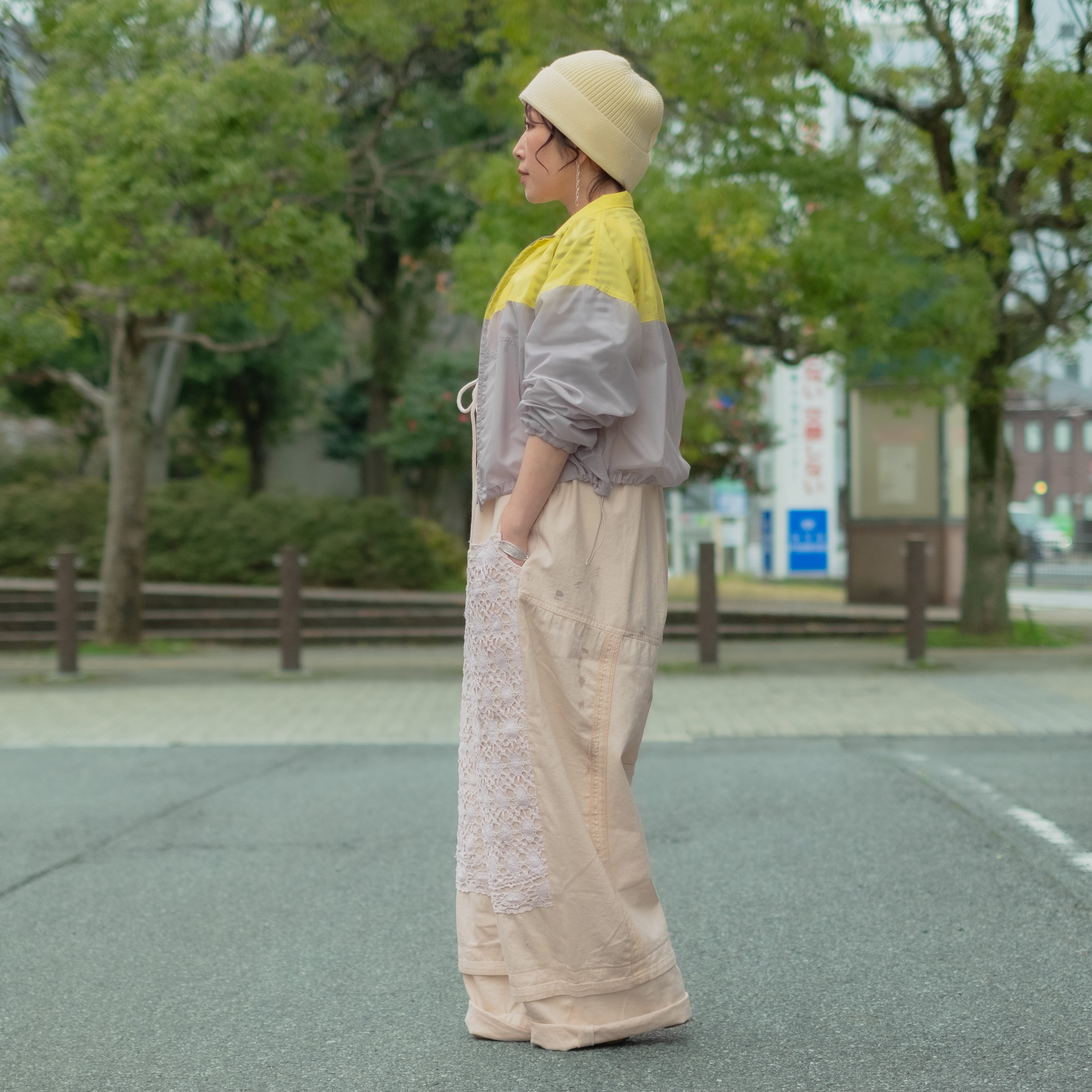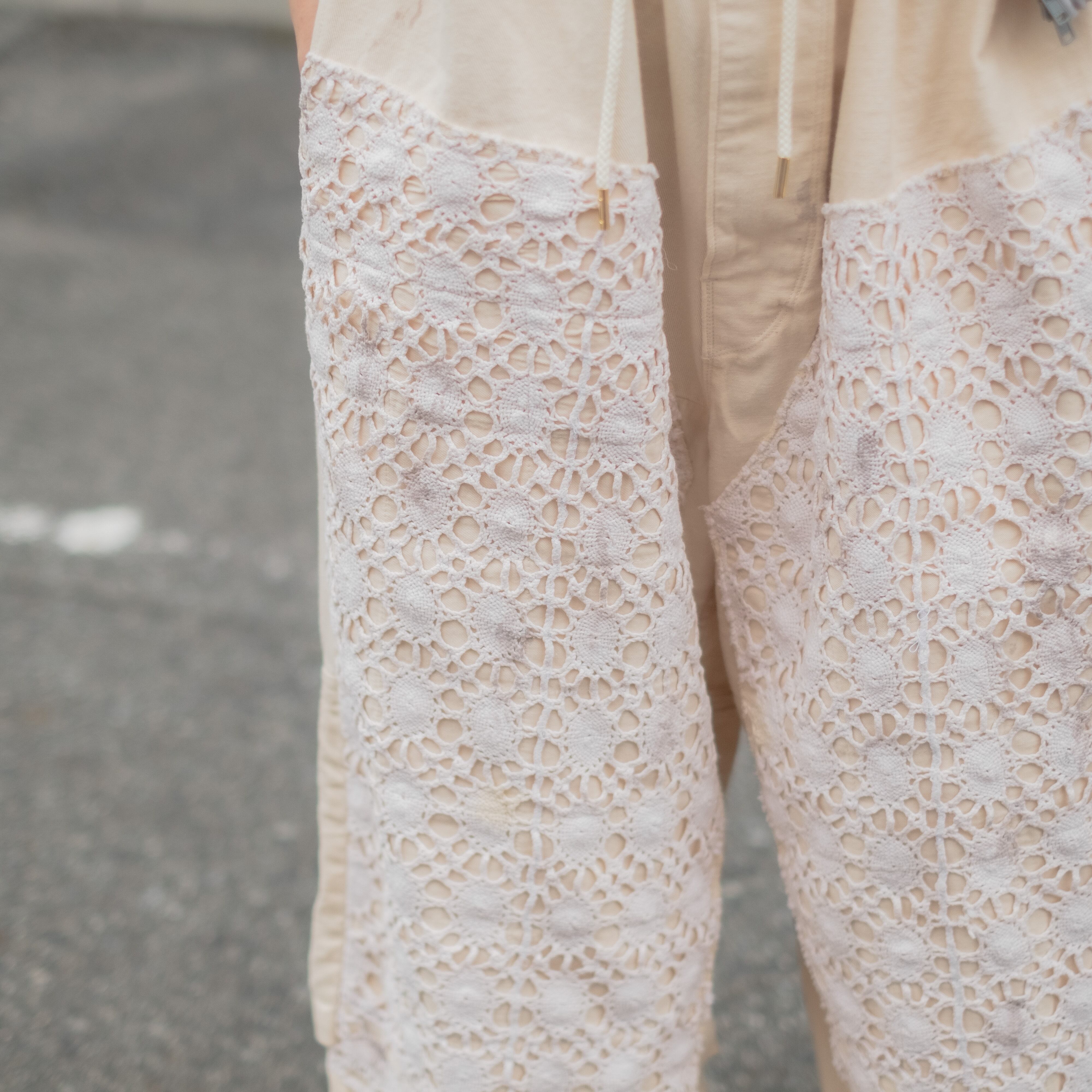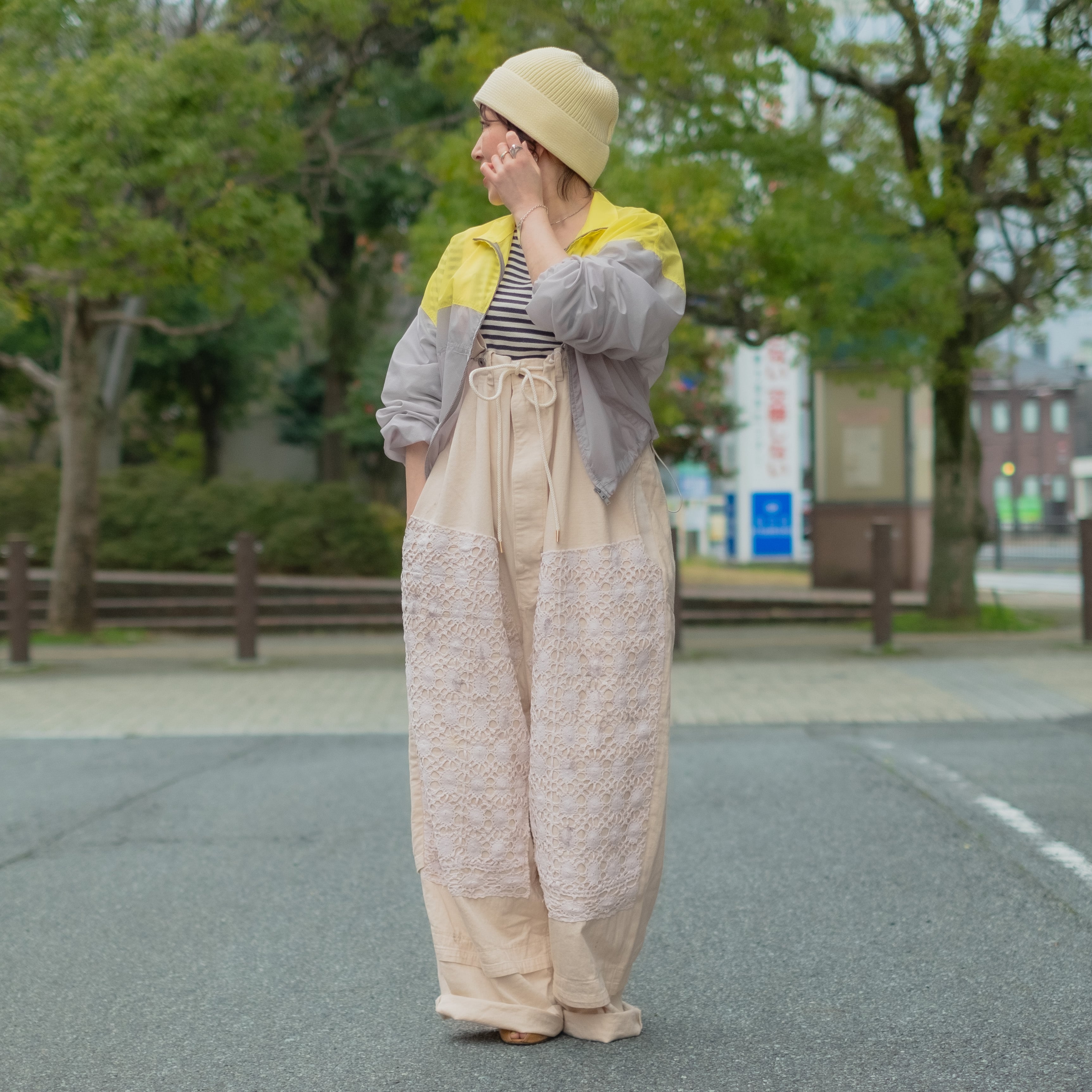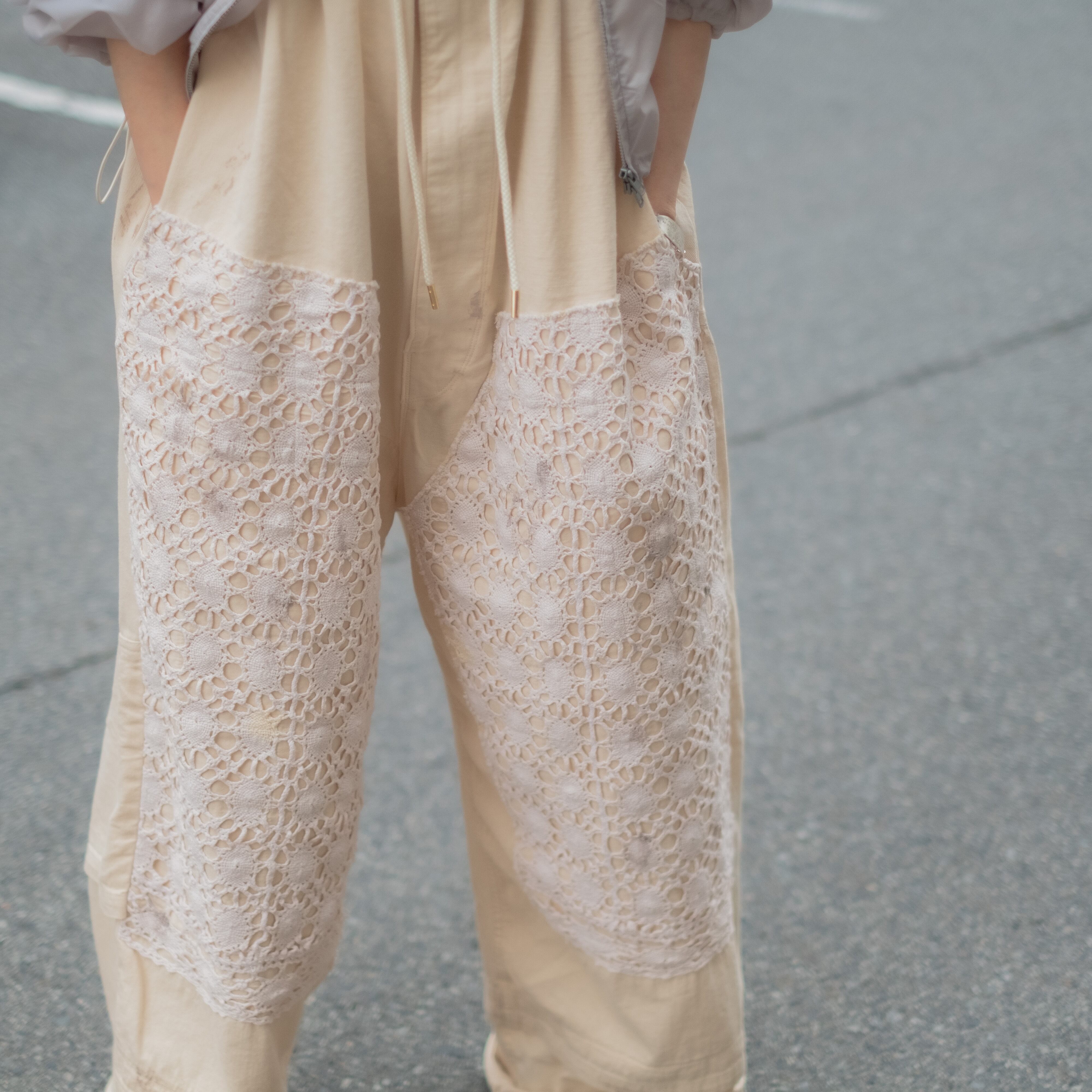 年代の古いレースを配した迫力あるダブルニーデザインが着こなしのアクセントに。