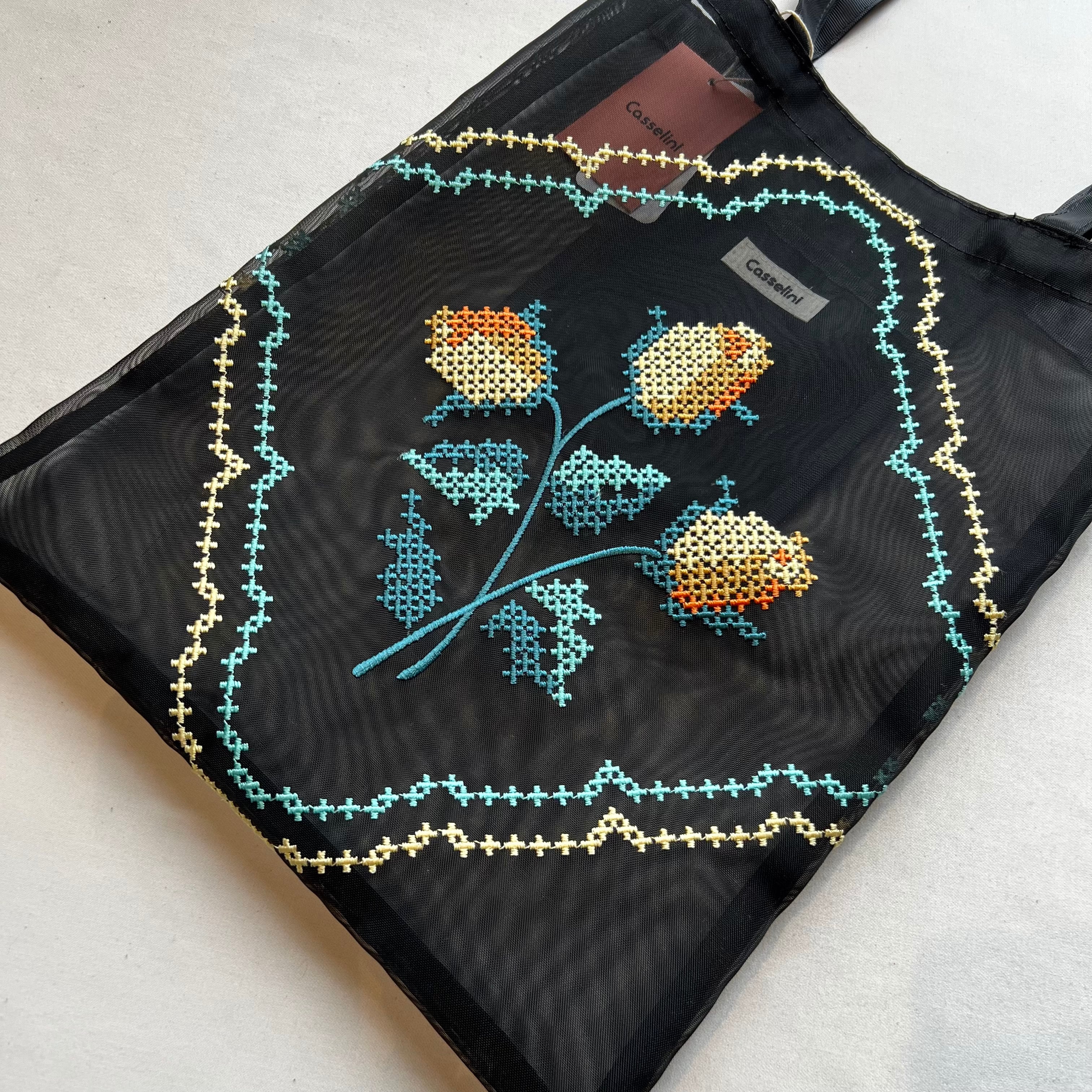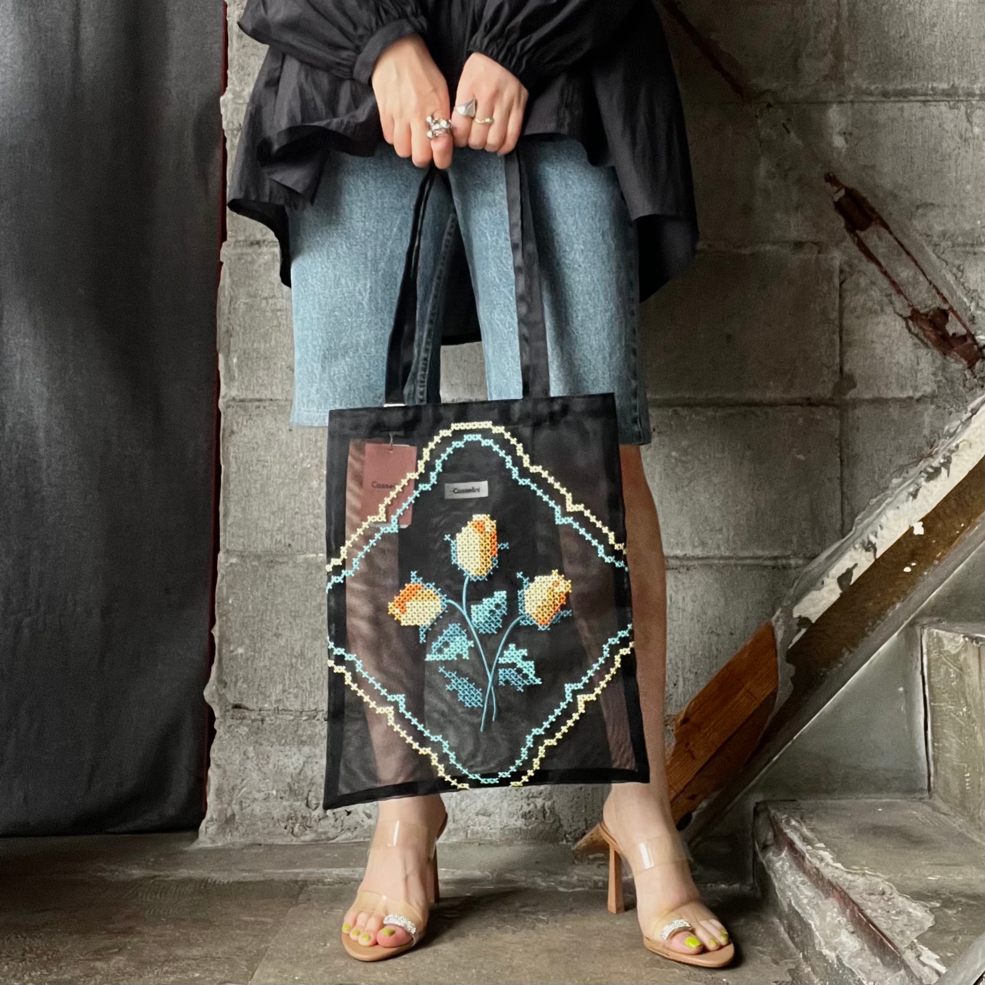 ヴィンテージ感のあるクロスステッチ刺繍と、軽やかで透け感のあるチュール素材が絶妙な相性のトートバッグ。