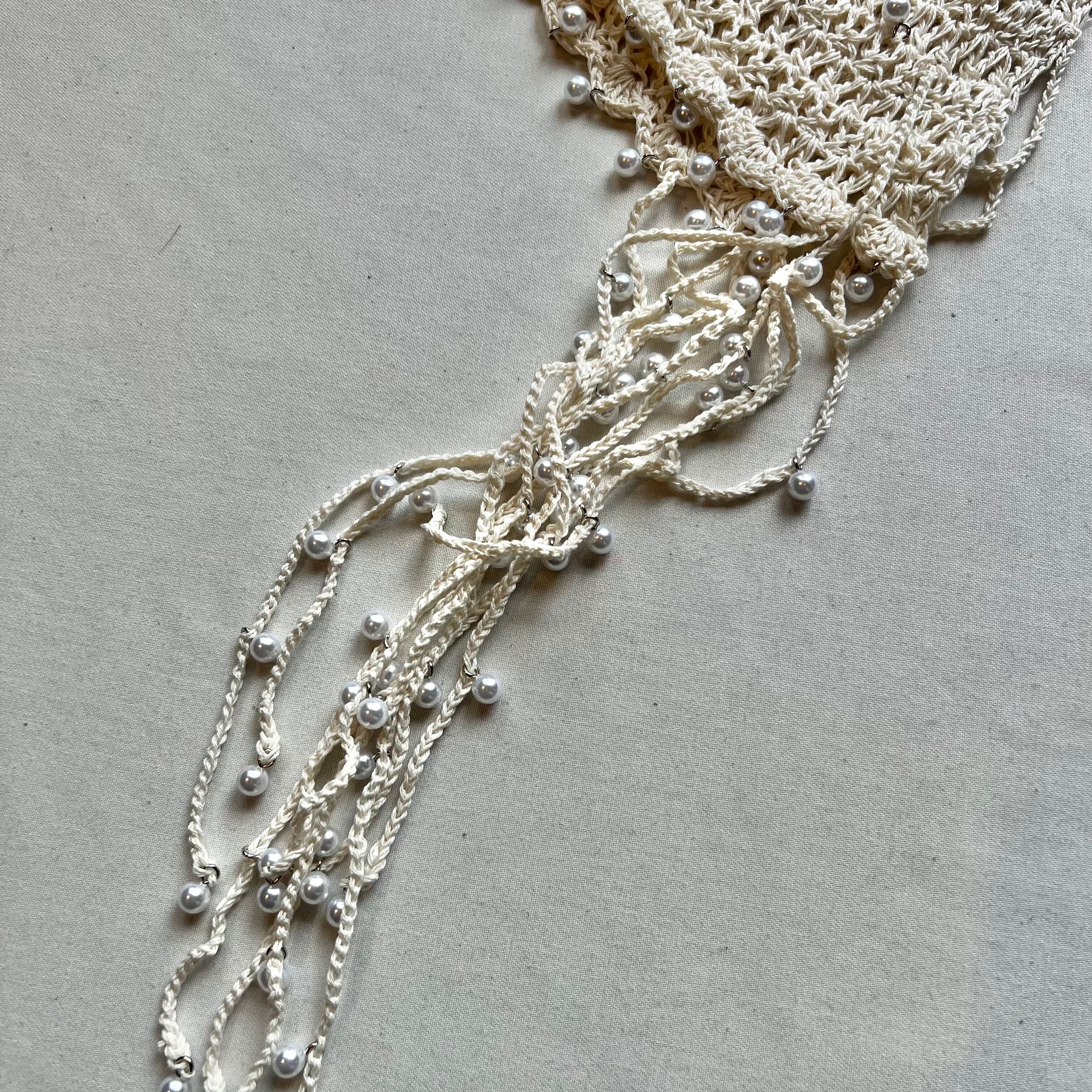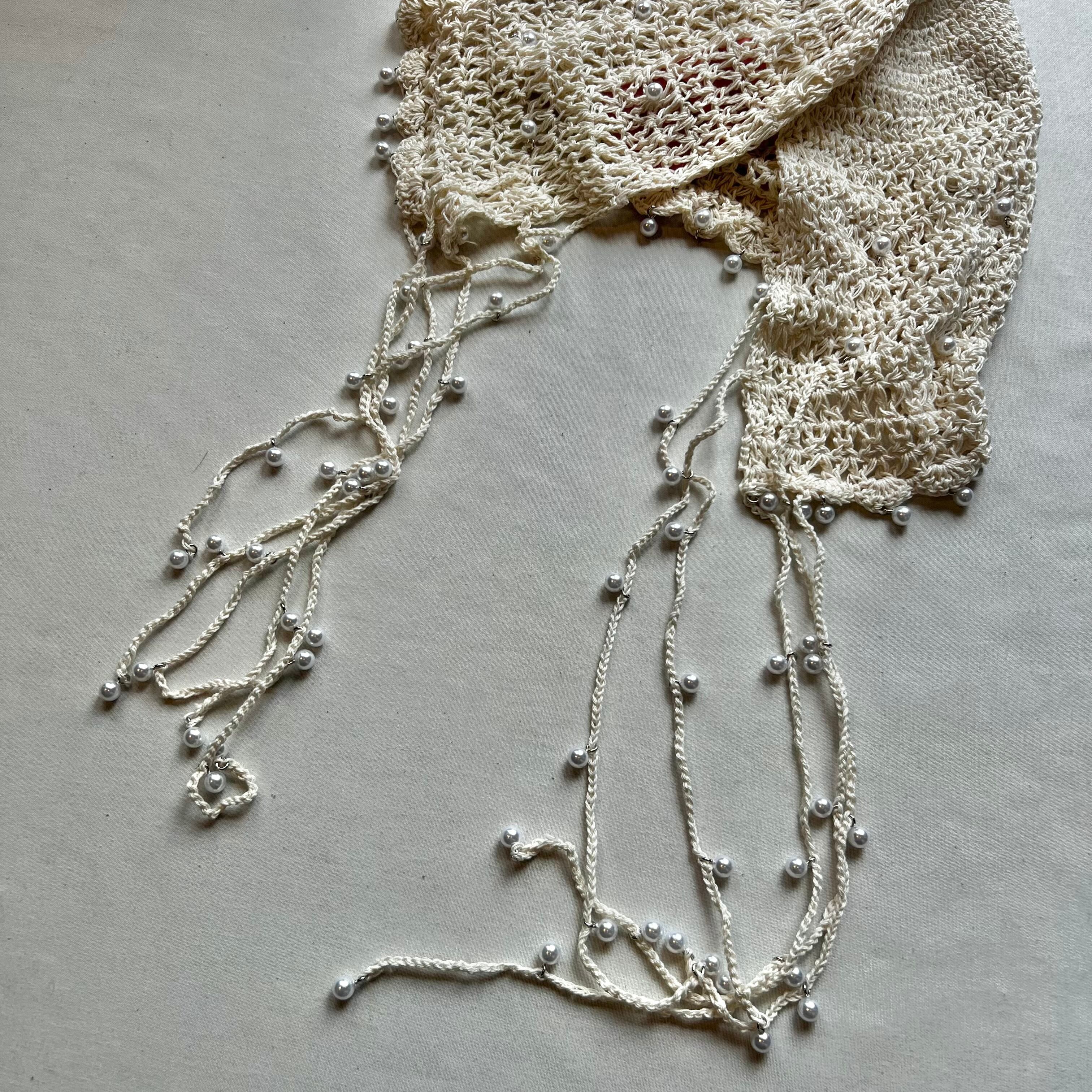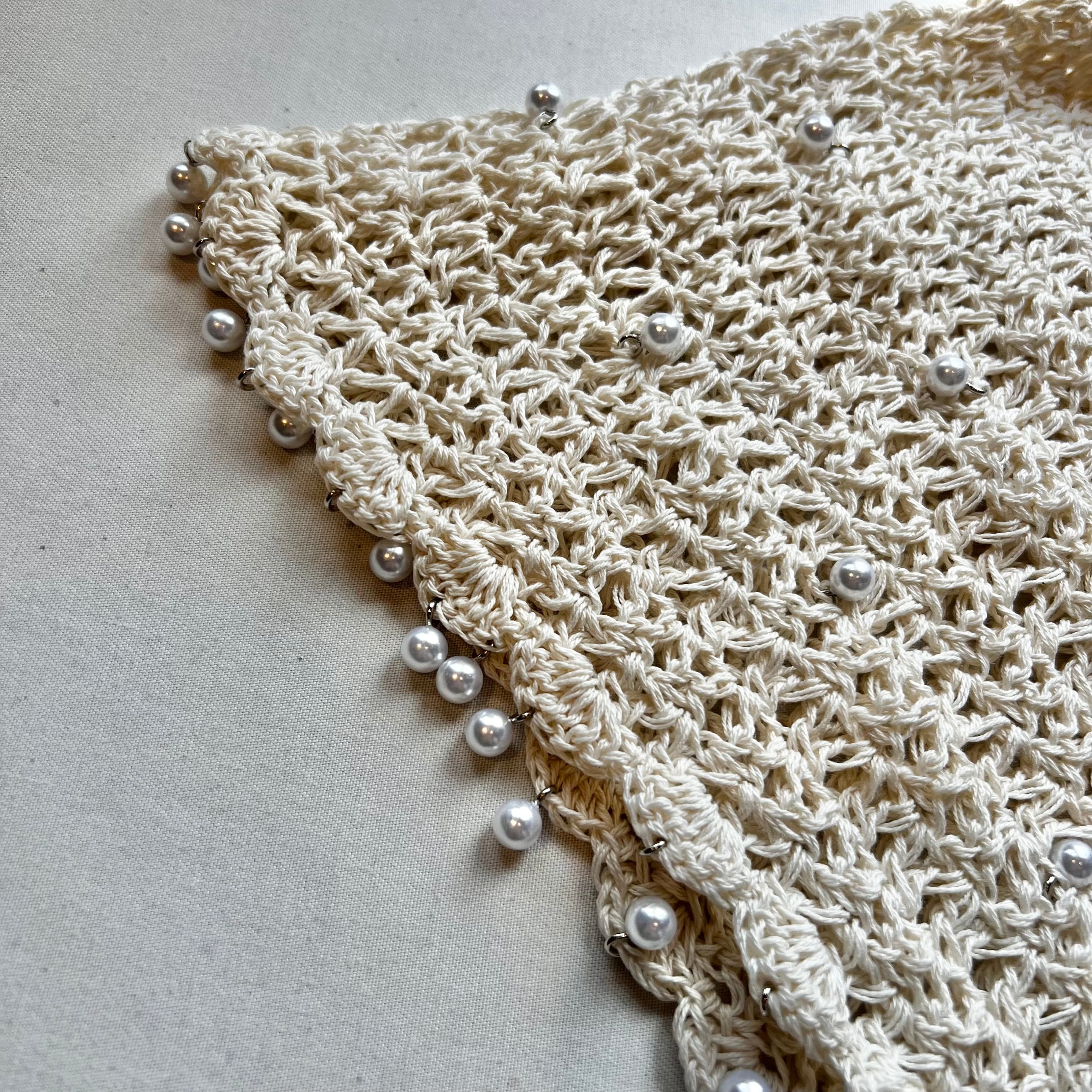 夏らしい透かし編みの本体に、一つ一つ金具でビーズを付けたアートピースのようなアイテムです。