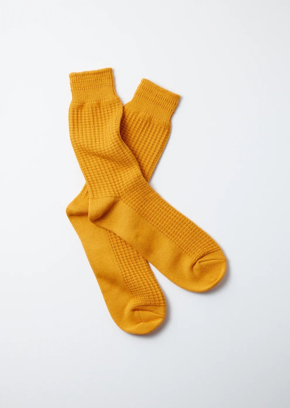時間と効率が最優先される現代の靴下づくりの流れに反し、あえてコンピュータ化されていない旧式の編み機を使い、古き良きオーセンティックな肉厚のワッフル素材をイメージして編み立てたソックス。