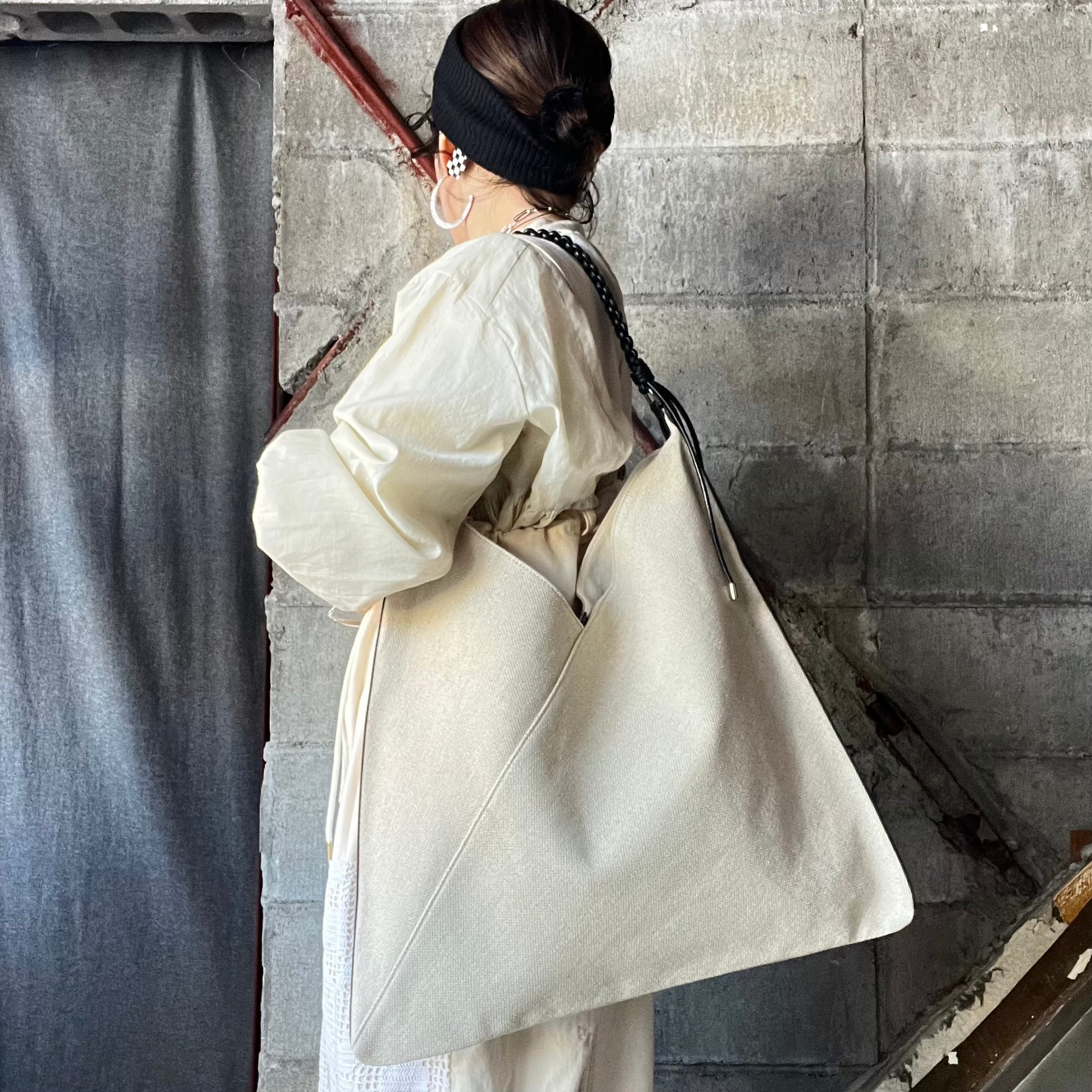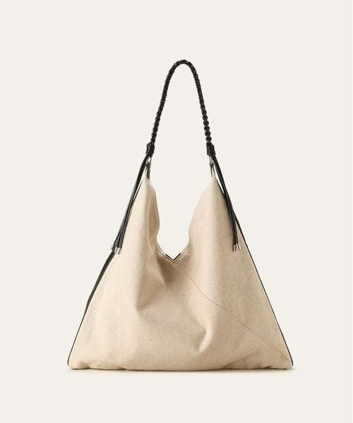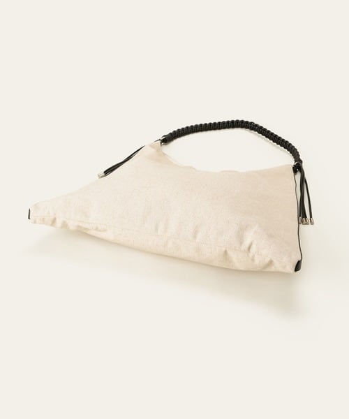 トライアングルシルエットに編み込んだハンドルがモードな雰囲気をプラス。
