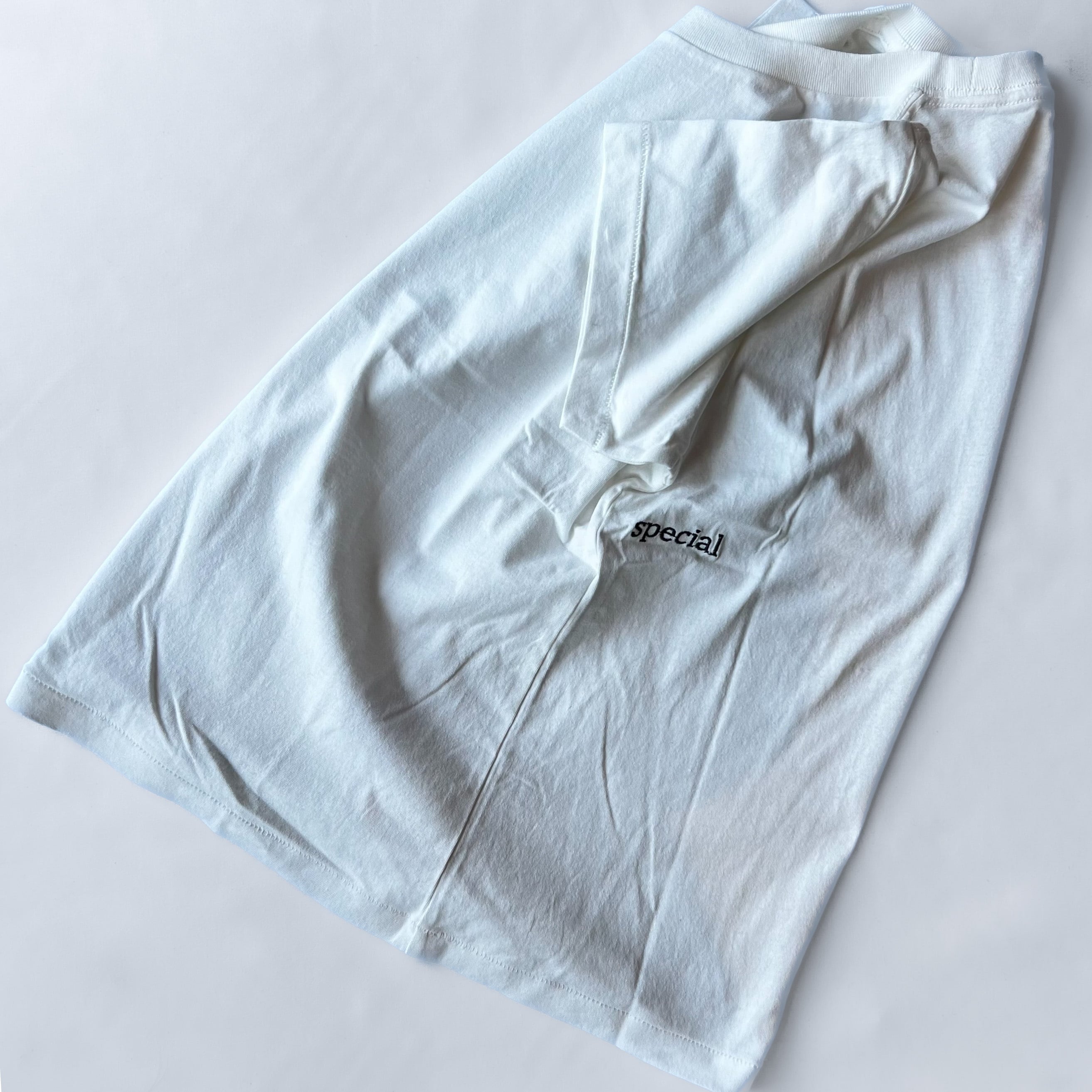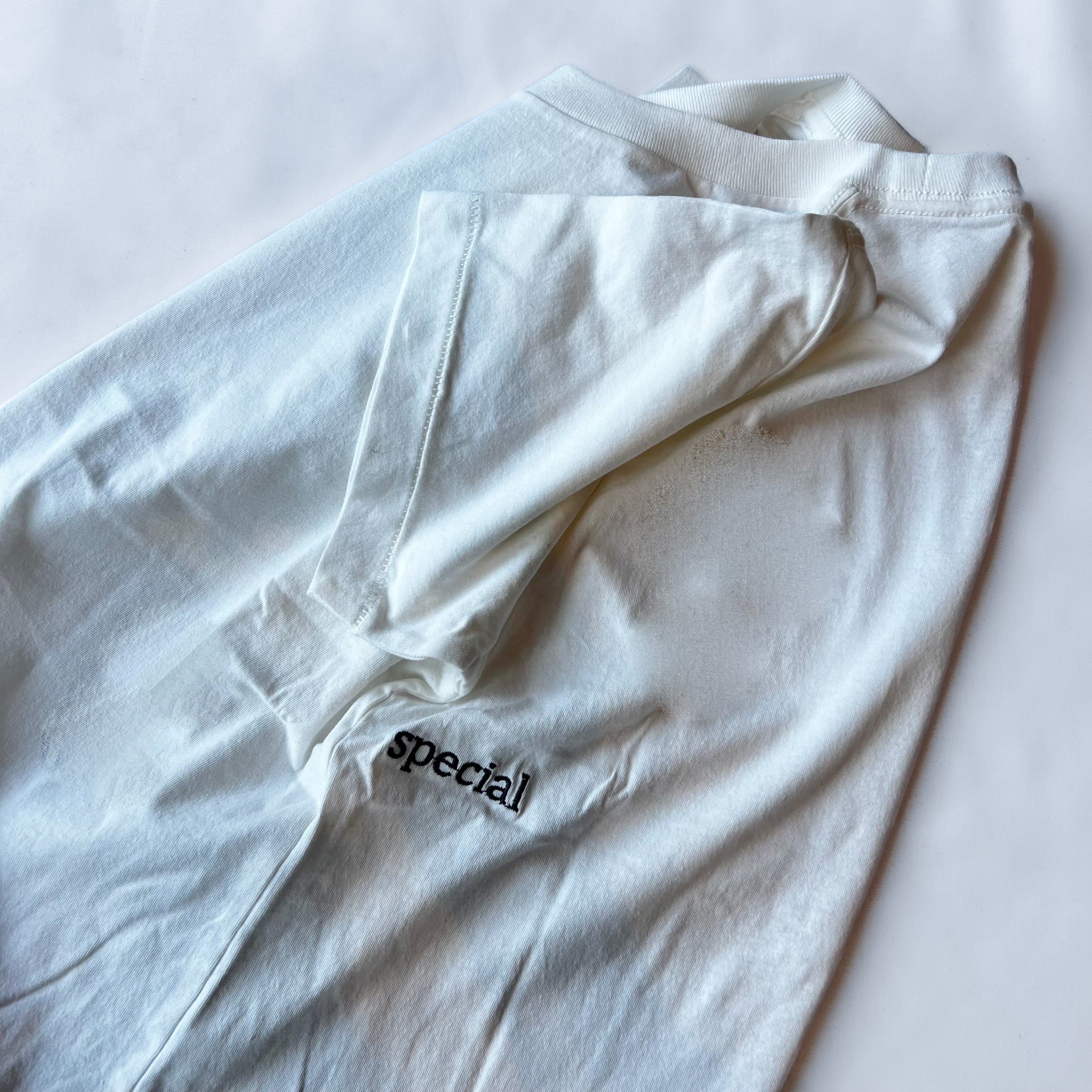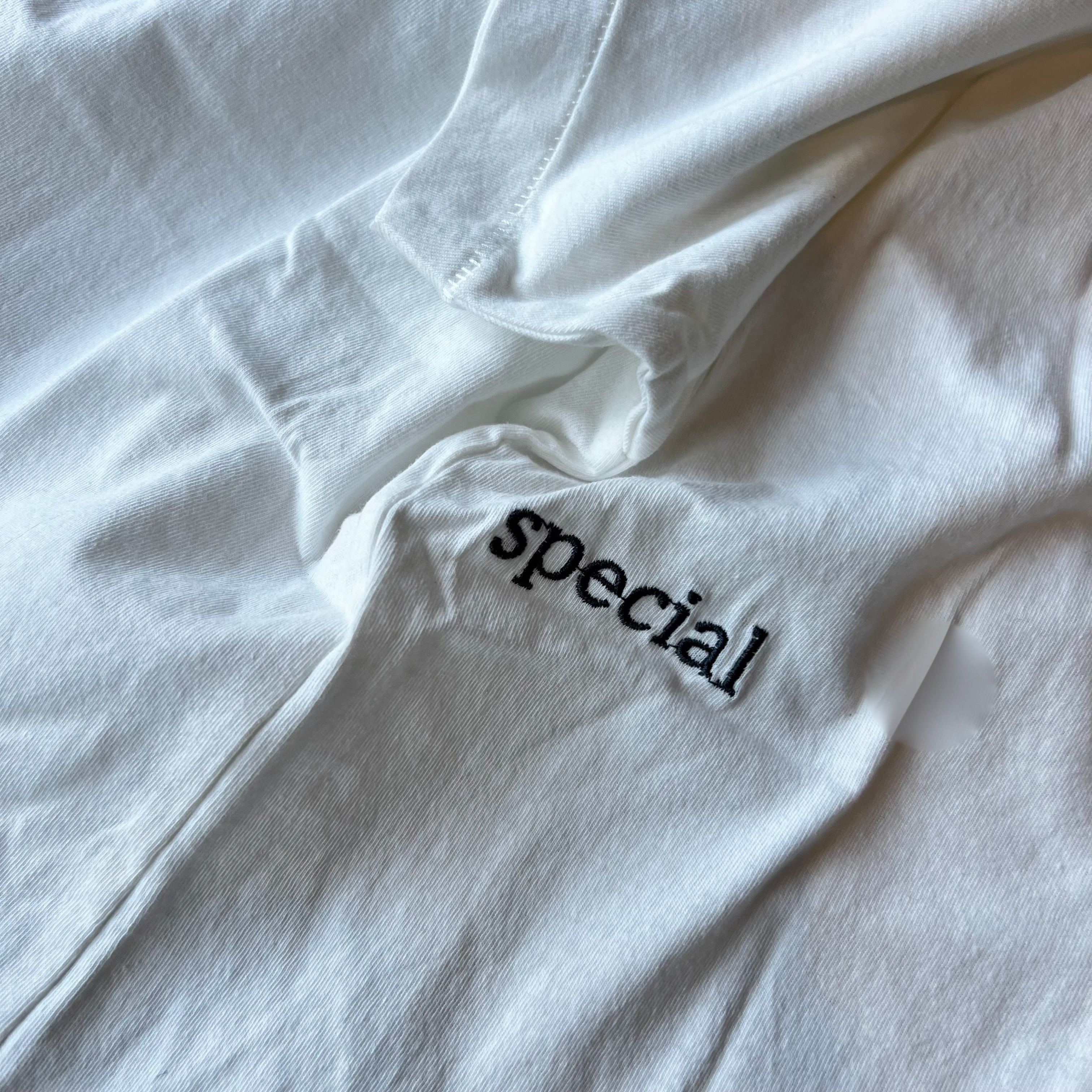 左脇に施した「special」の刺繍もさりげないポイント。腕を動かしたときや、後ろ姿からふと覗く、大人の遊び心を添えました。