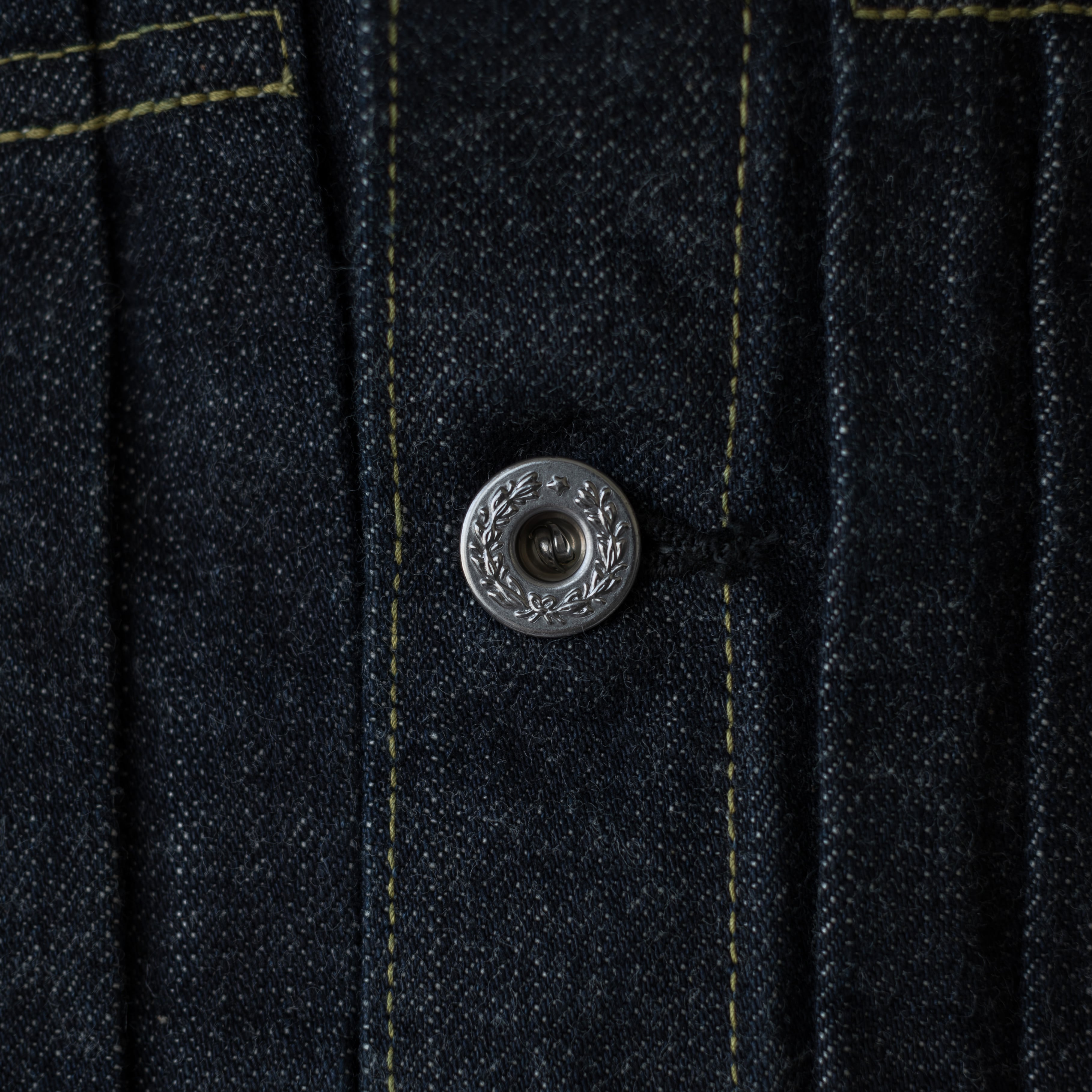月桂樹のスチール釦や刻印無しの銅リベット、百合の紋章入りのバックルなどディテールを盛り込んでいます。