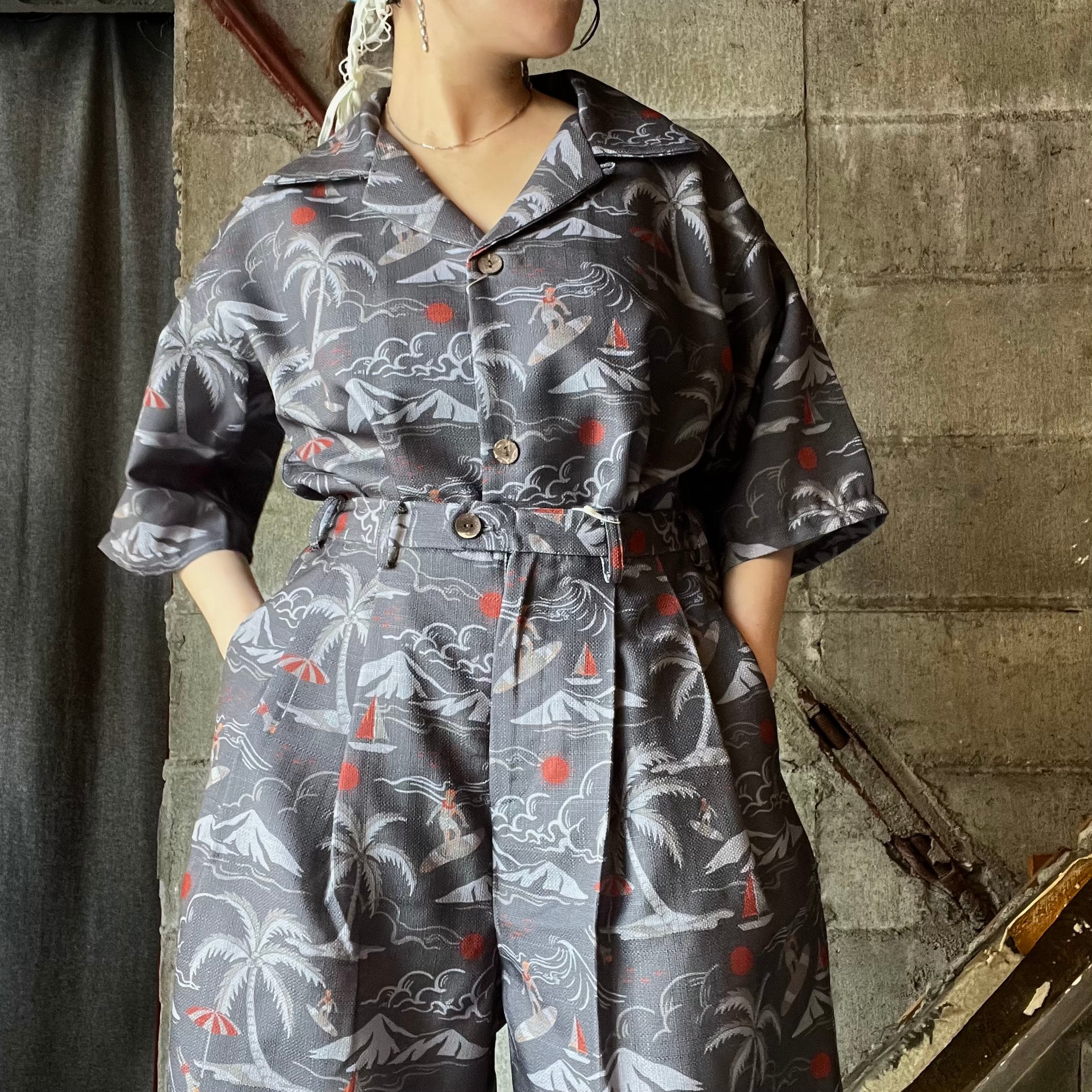 開襟仕様なのでアロハシャツのような装い。