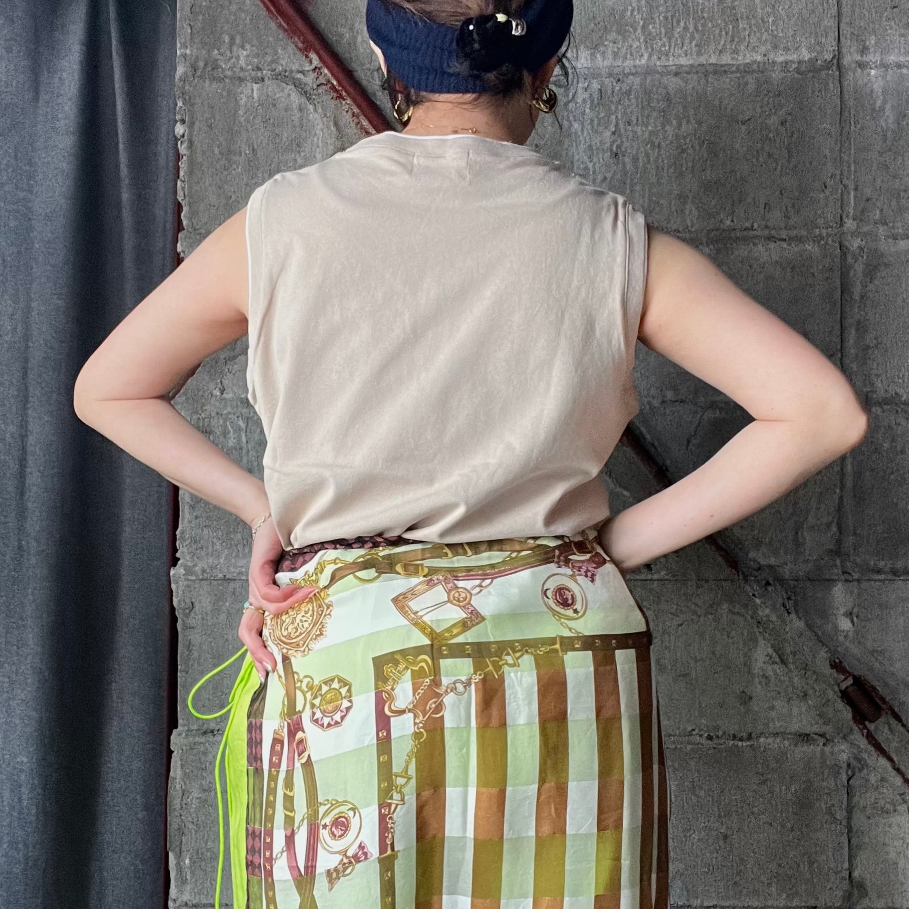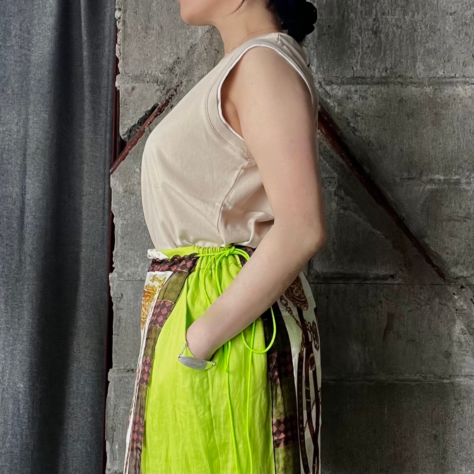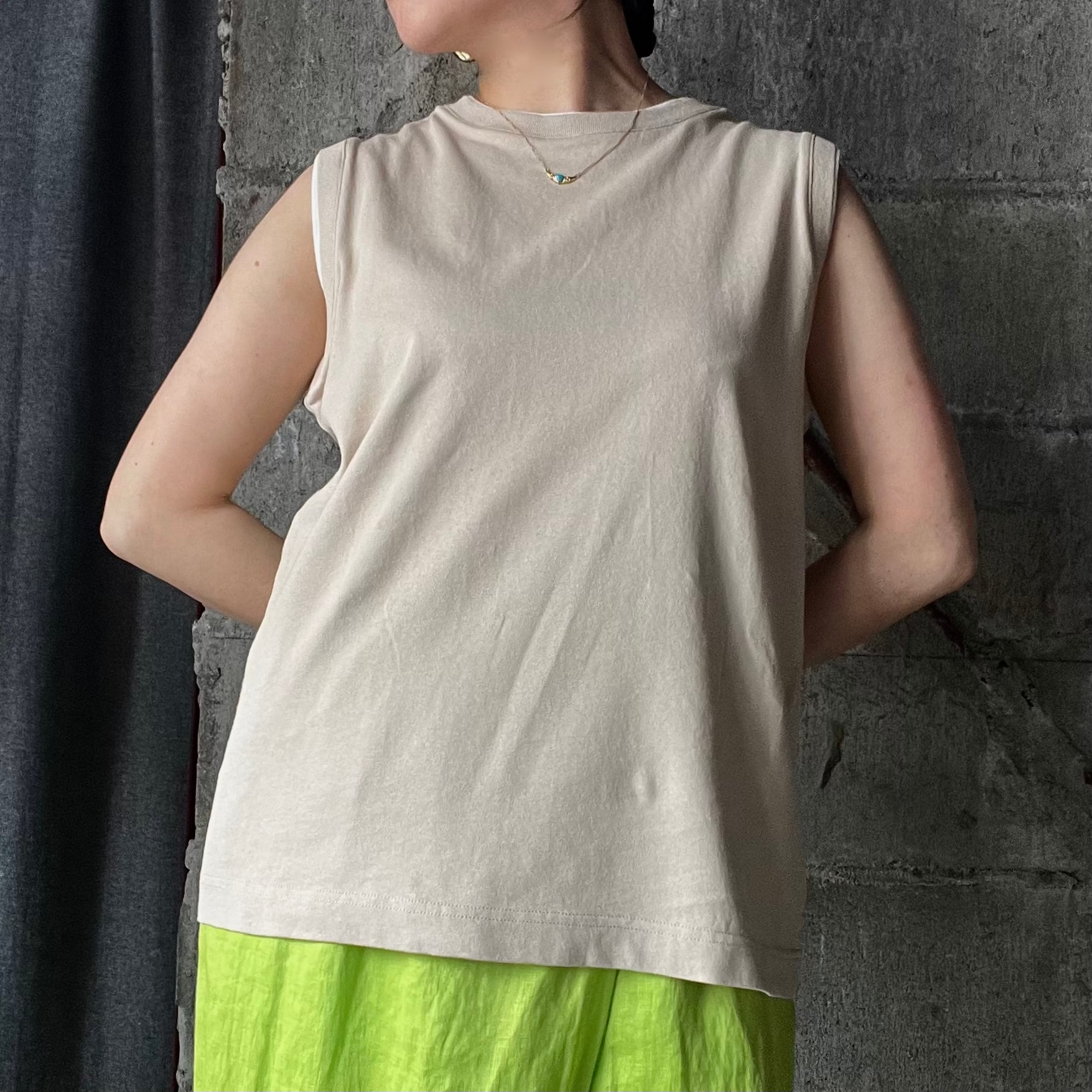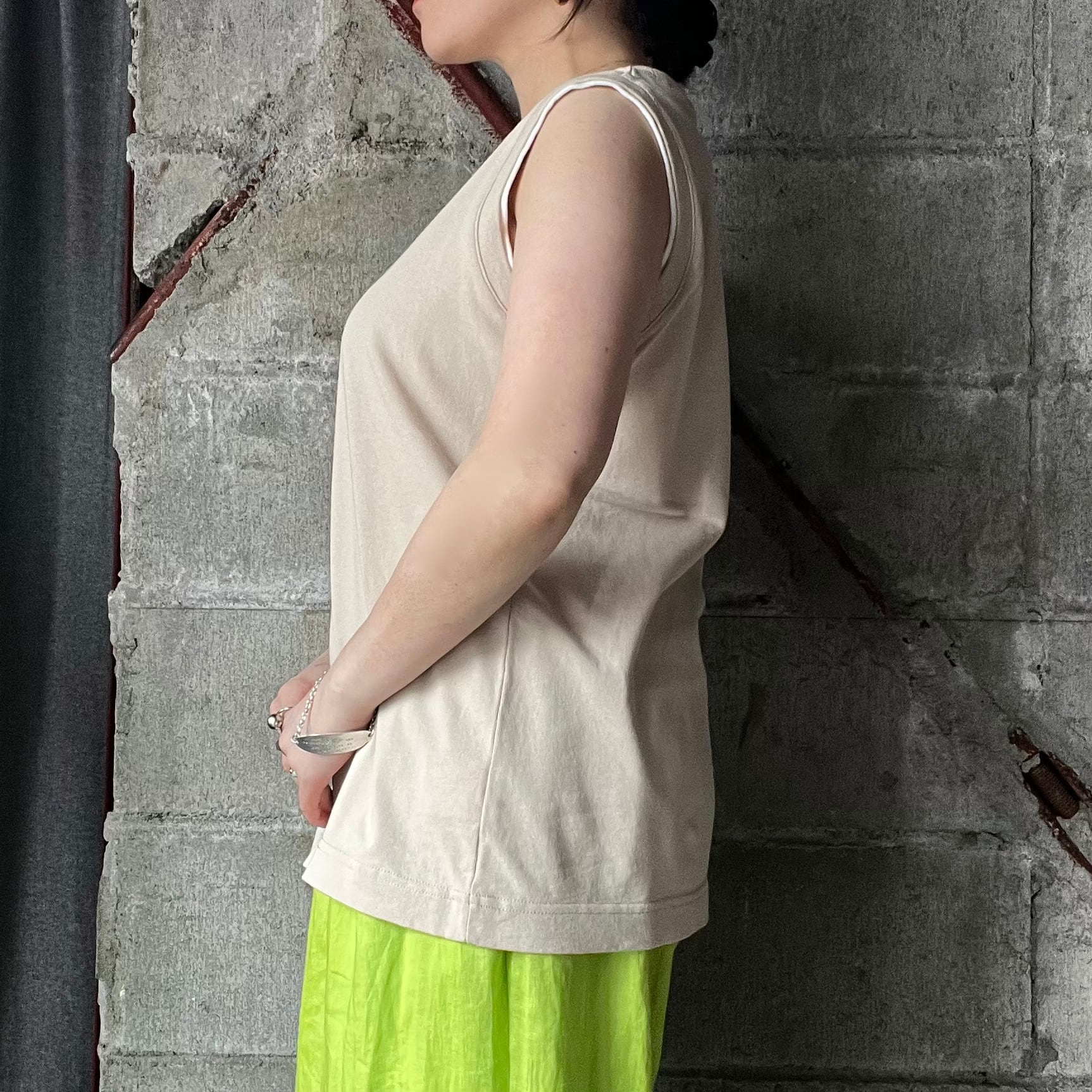 首周りとアームホールに配色を施し、シンプルなノースリーブに一癖デザインをプラス。