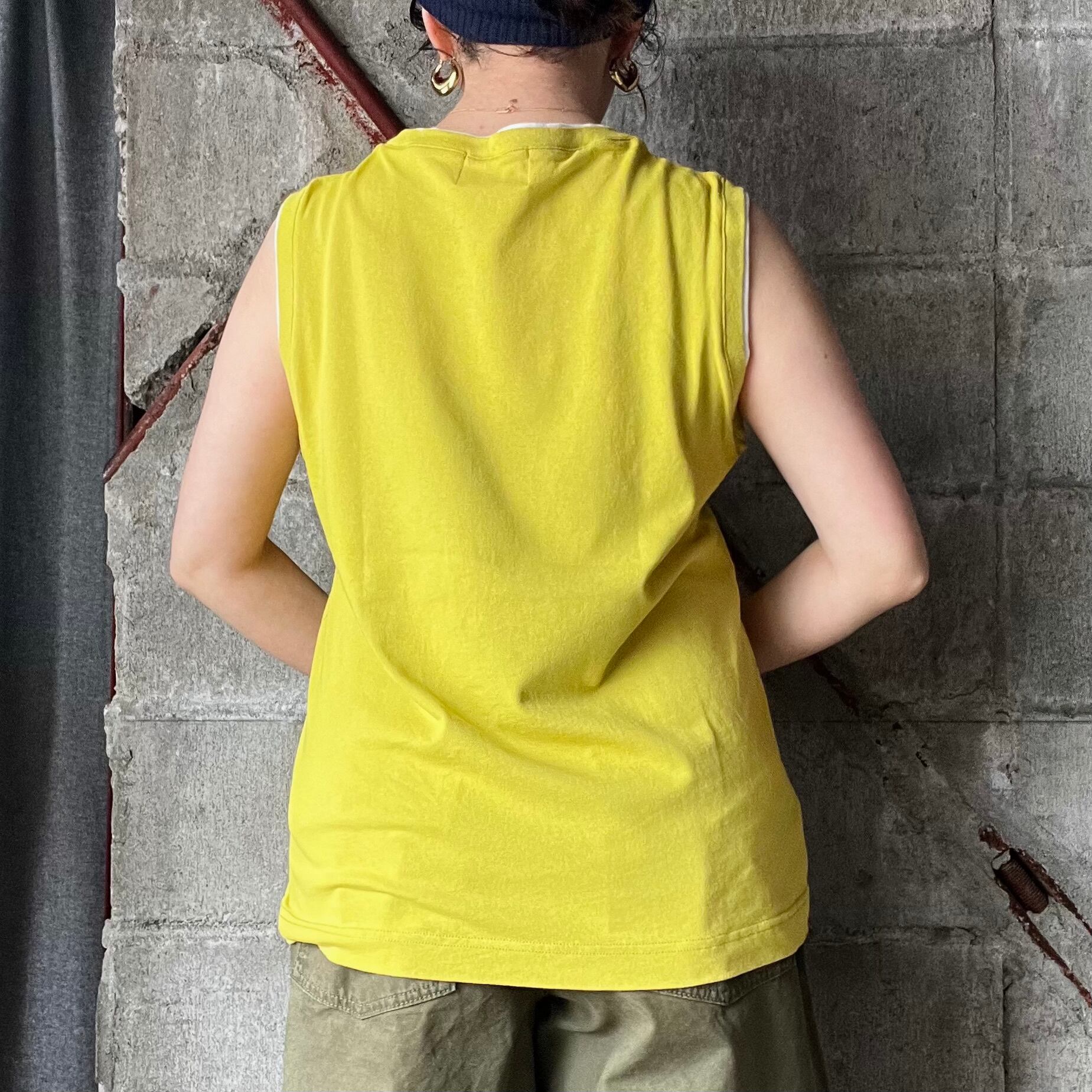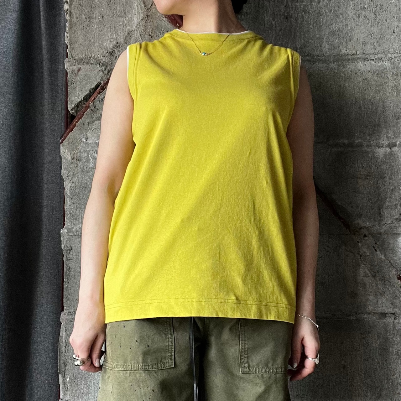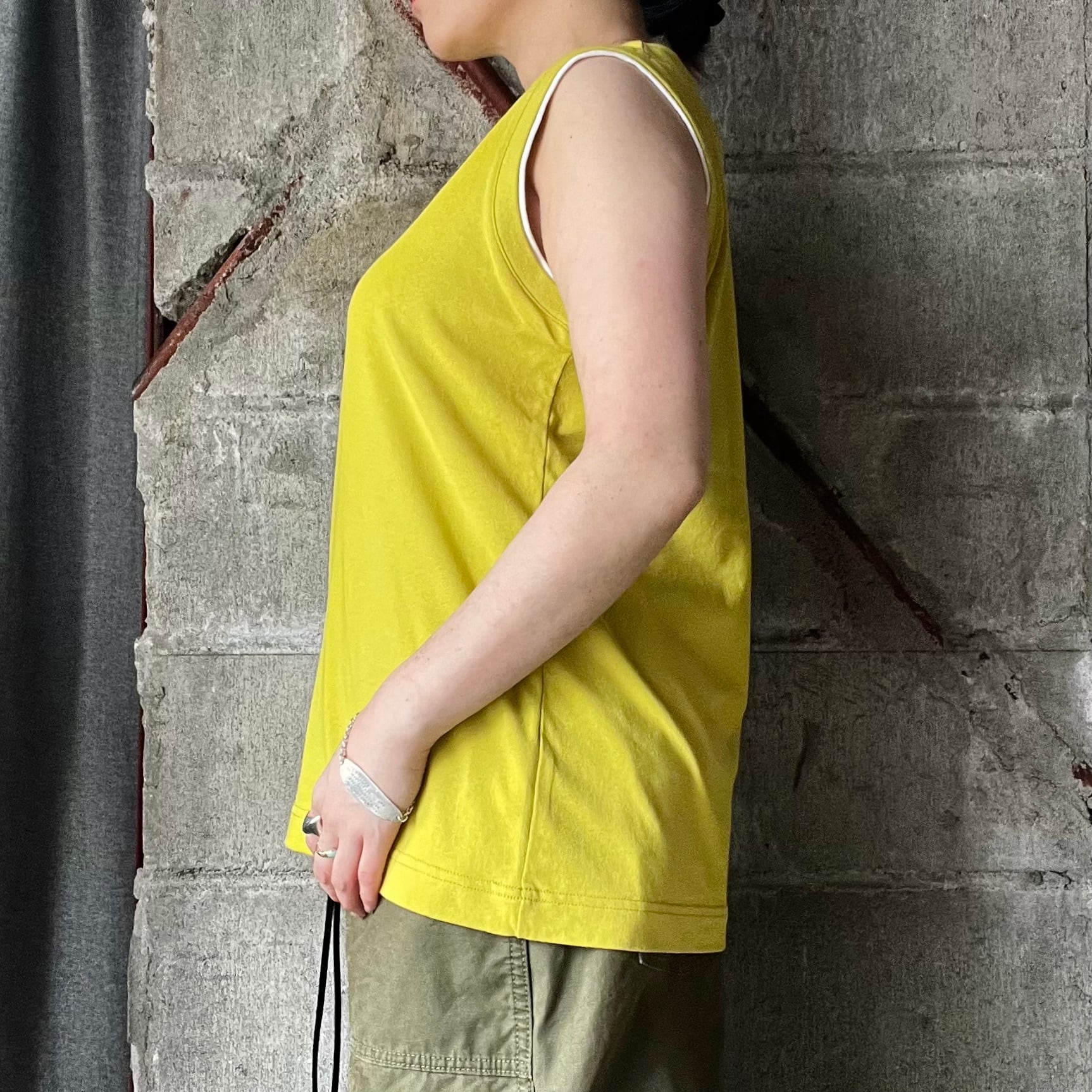 首周りとアームホールに配色を施し、シンプルなノースリーブに一癖デザインをプラス。