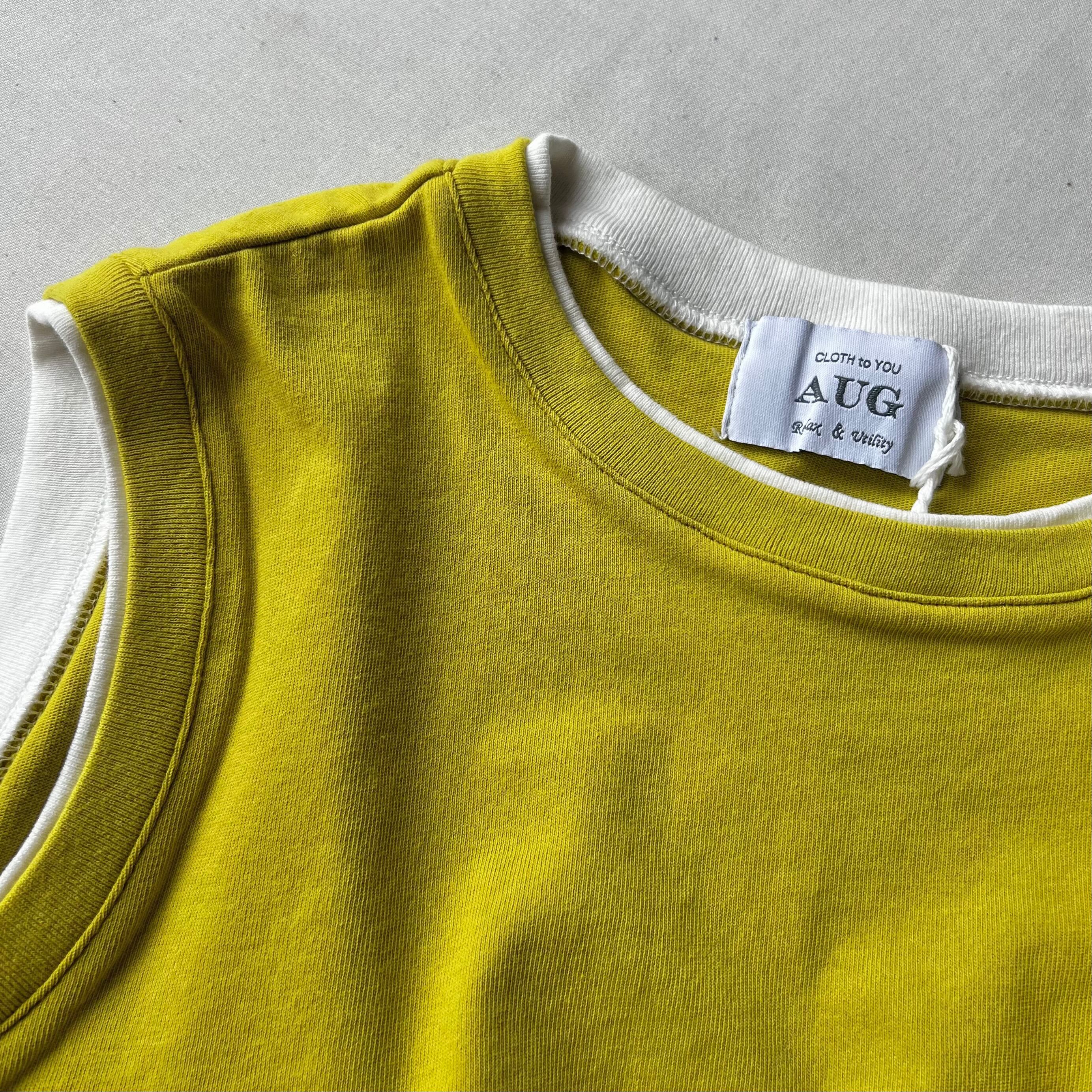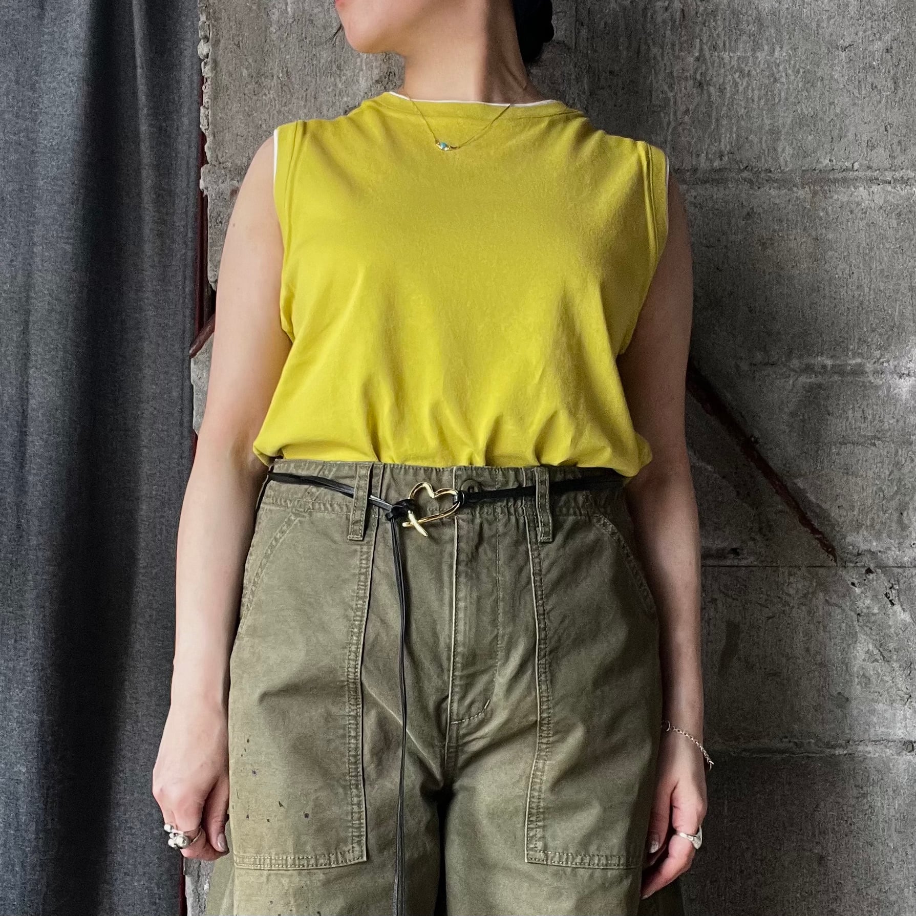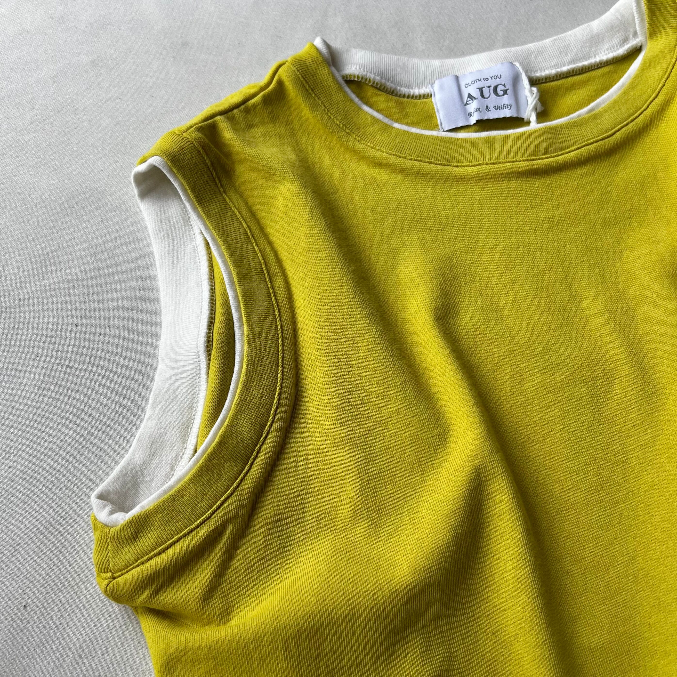 首周りとアームホールに配色を施し、シンプルなノースリーブに一癖デザインをプラス。