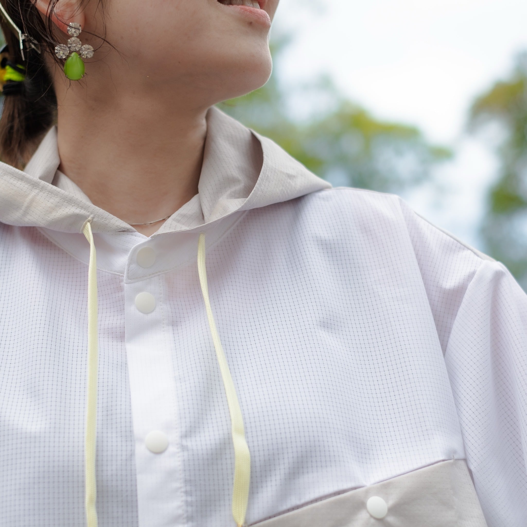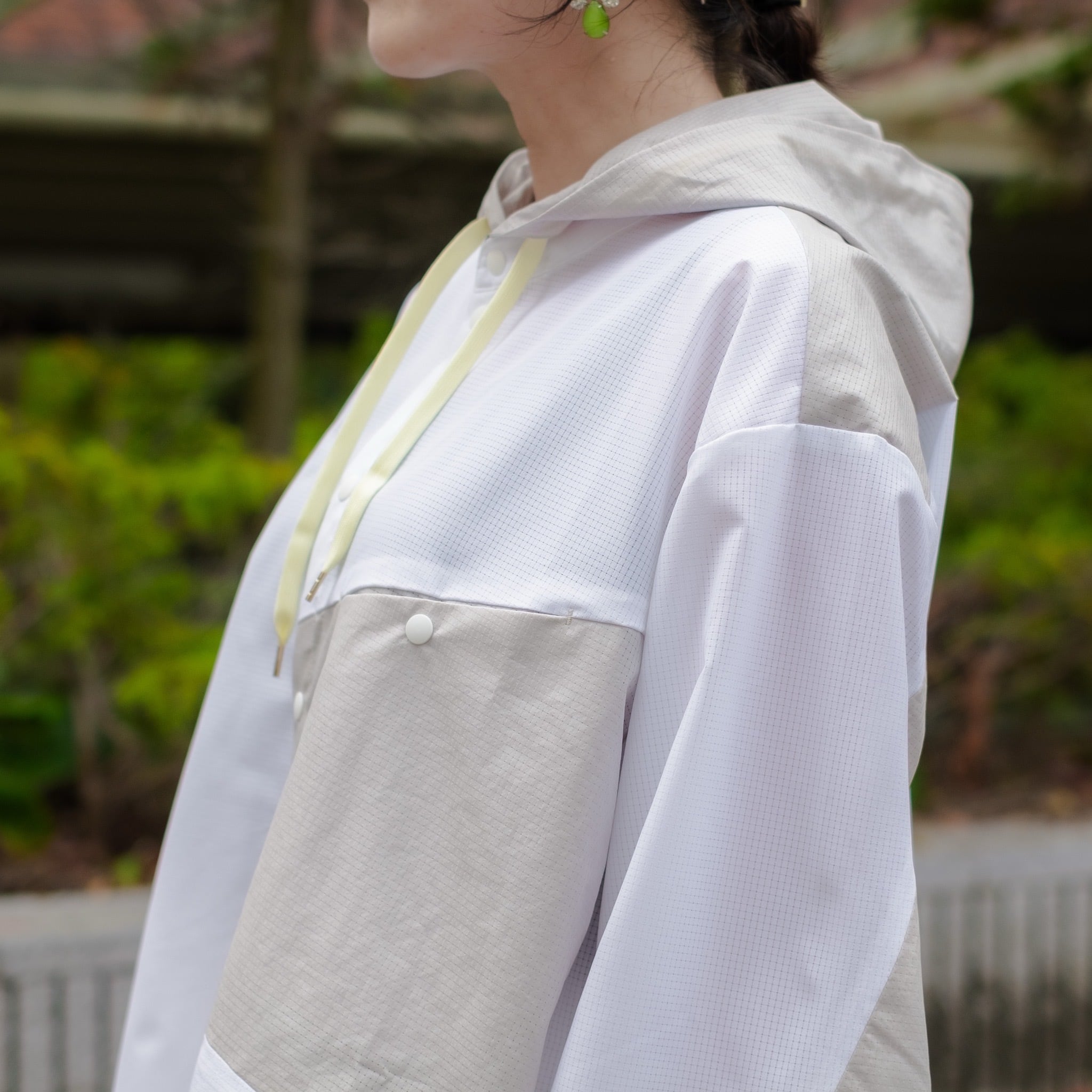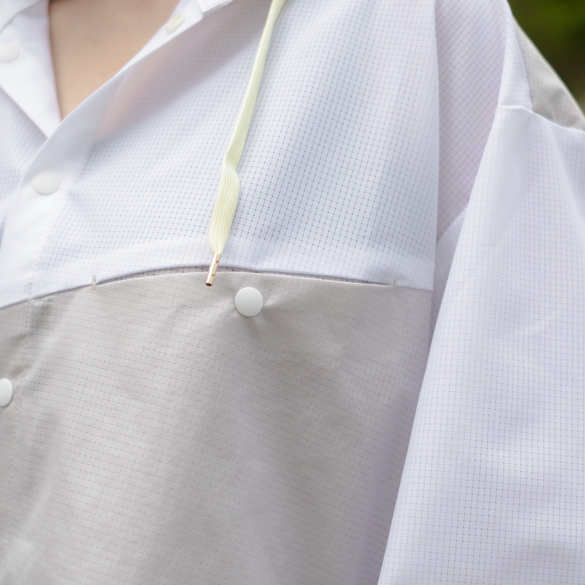 背中に大量のタックを入れる事で緩やかで丸みを帯びたシルエットに仕上げたシャツの中にフーディーを忍ばせているようなレイヤー風デザイン。