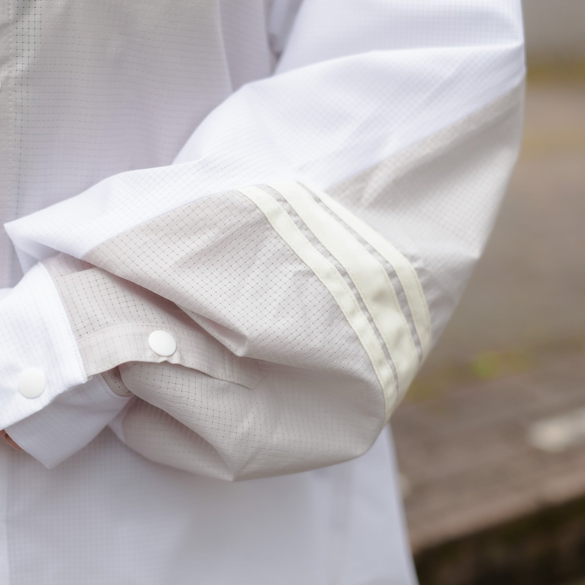 でも、袖部分の3本ラインでスポーティーな要素をミックスしたりmasterkeyらしい丸みを帯びた特徴的なシルエットは既存のアウトドアブランドでは絶対に出会えない夏でも着れる快適なシャツに仕上がっています。