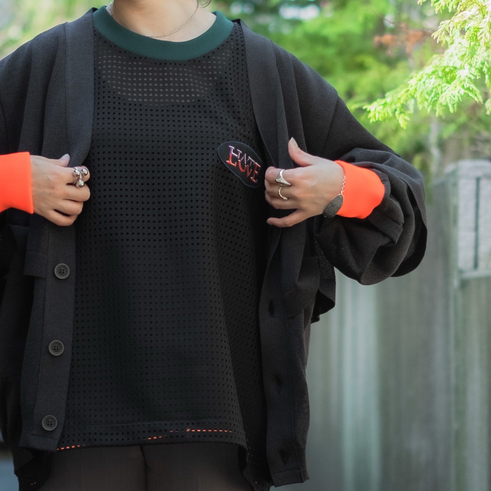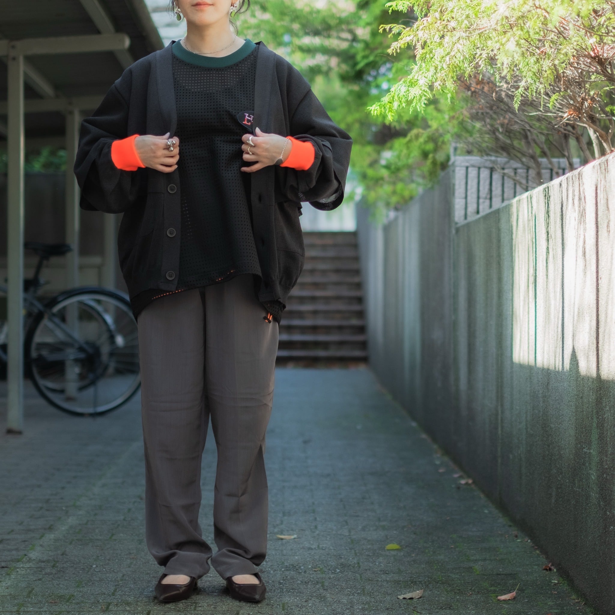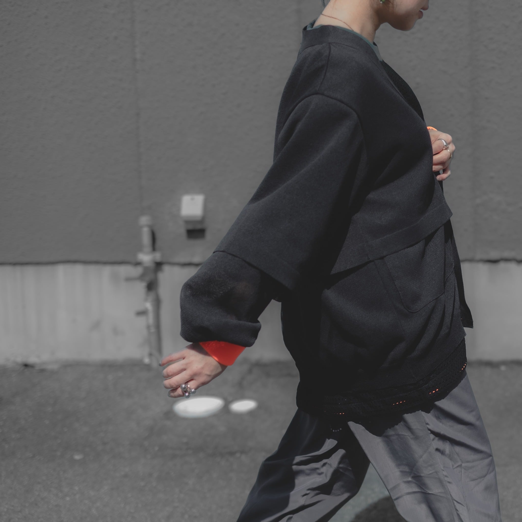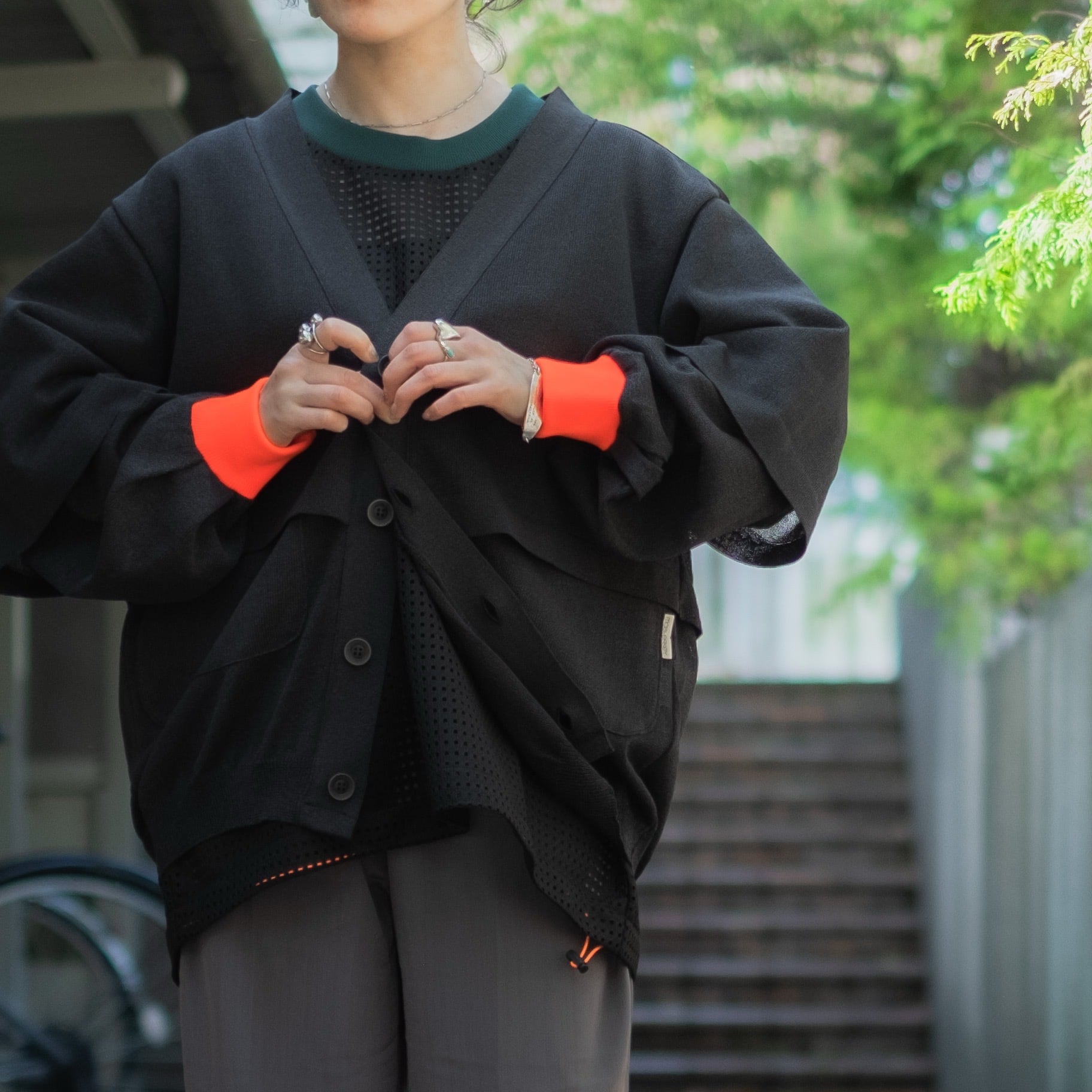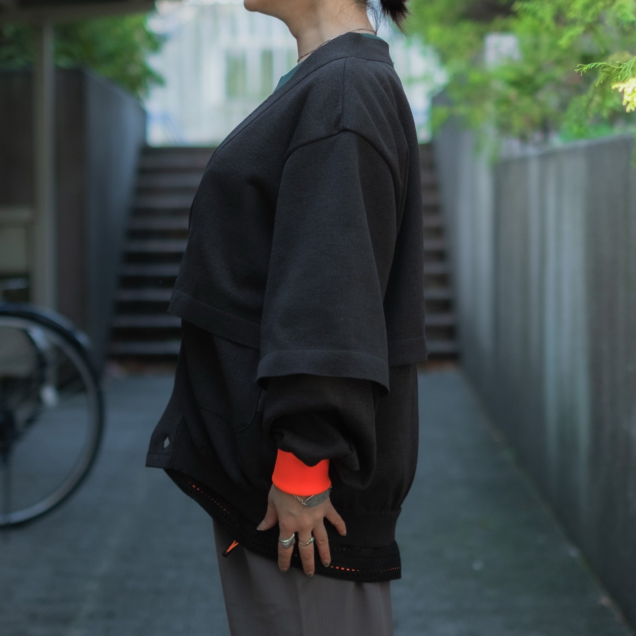 一見シンプルなデザインですが、アクセントとなる袖口の蛍光リブや隠しポケットの存在がポイント。