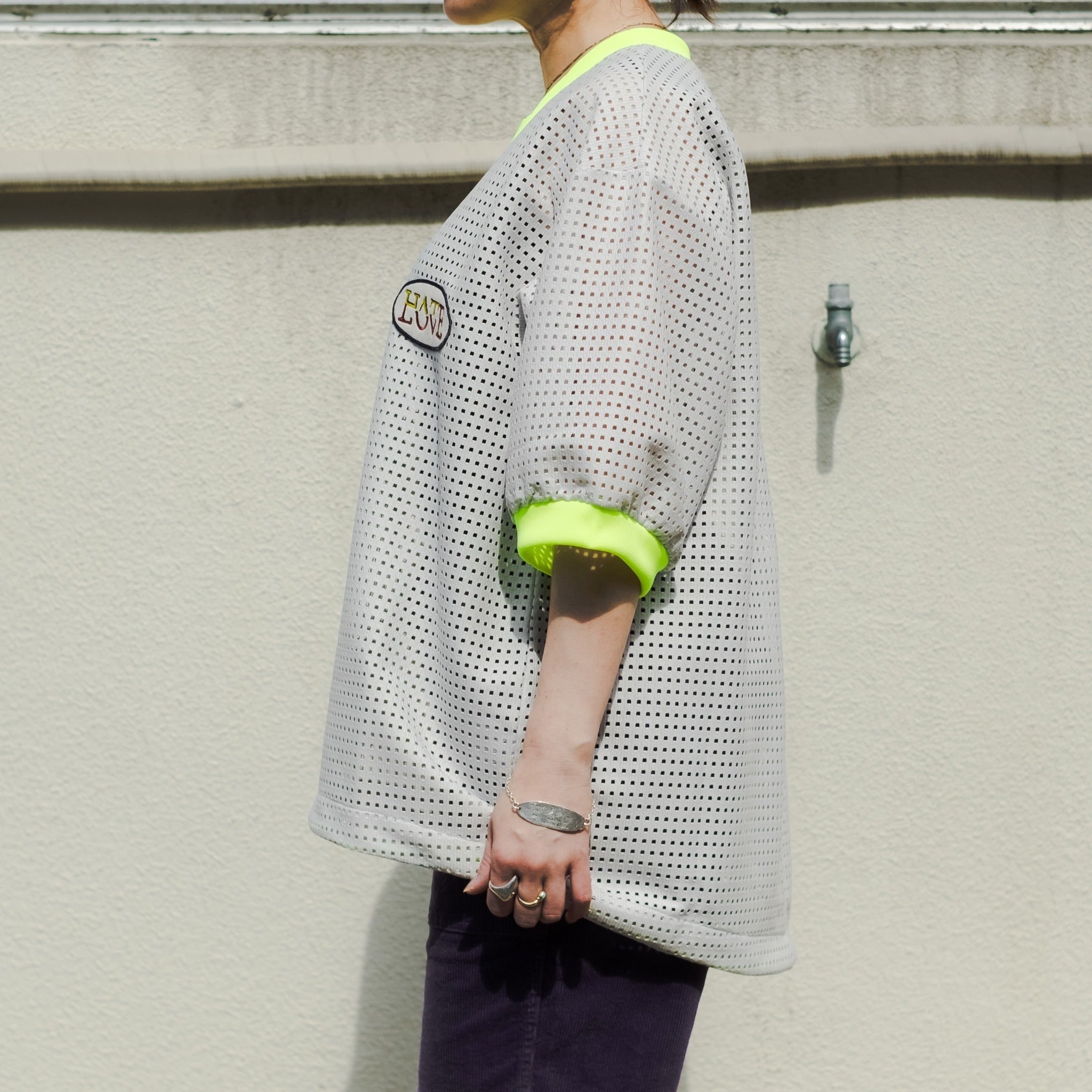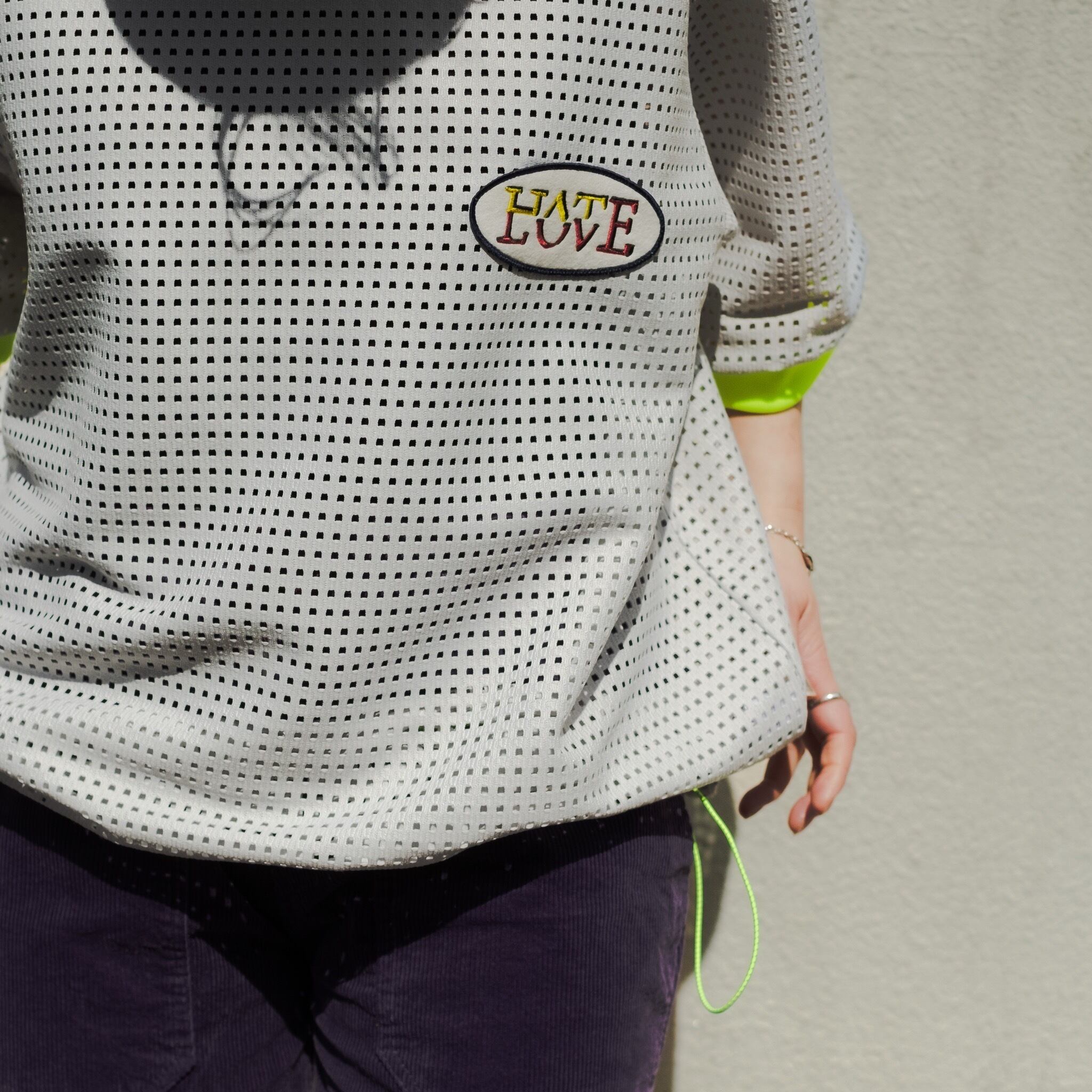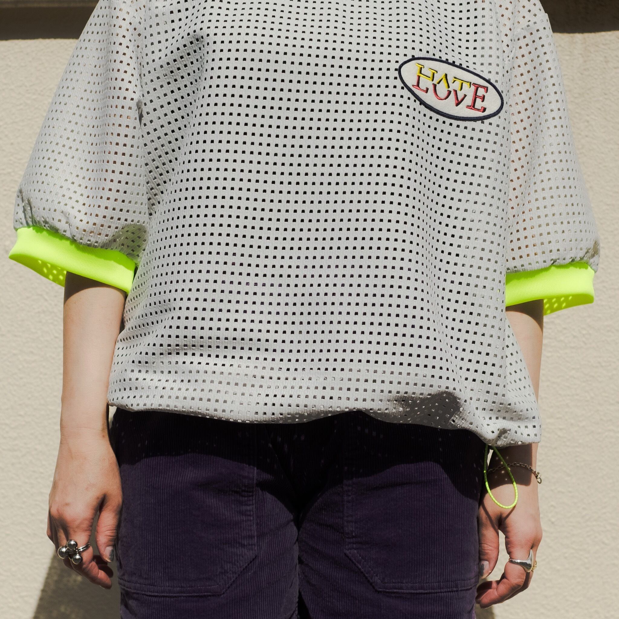 『 LOVE HATE 』のワッペンや、絞る事によりシルエットの変化を楽しめる裾の蛍光コードもデザインのアクセント。